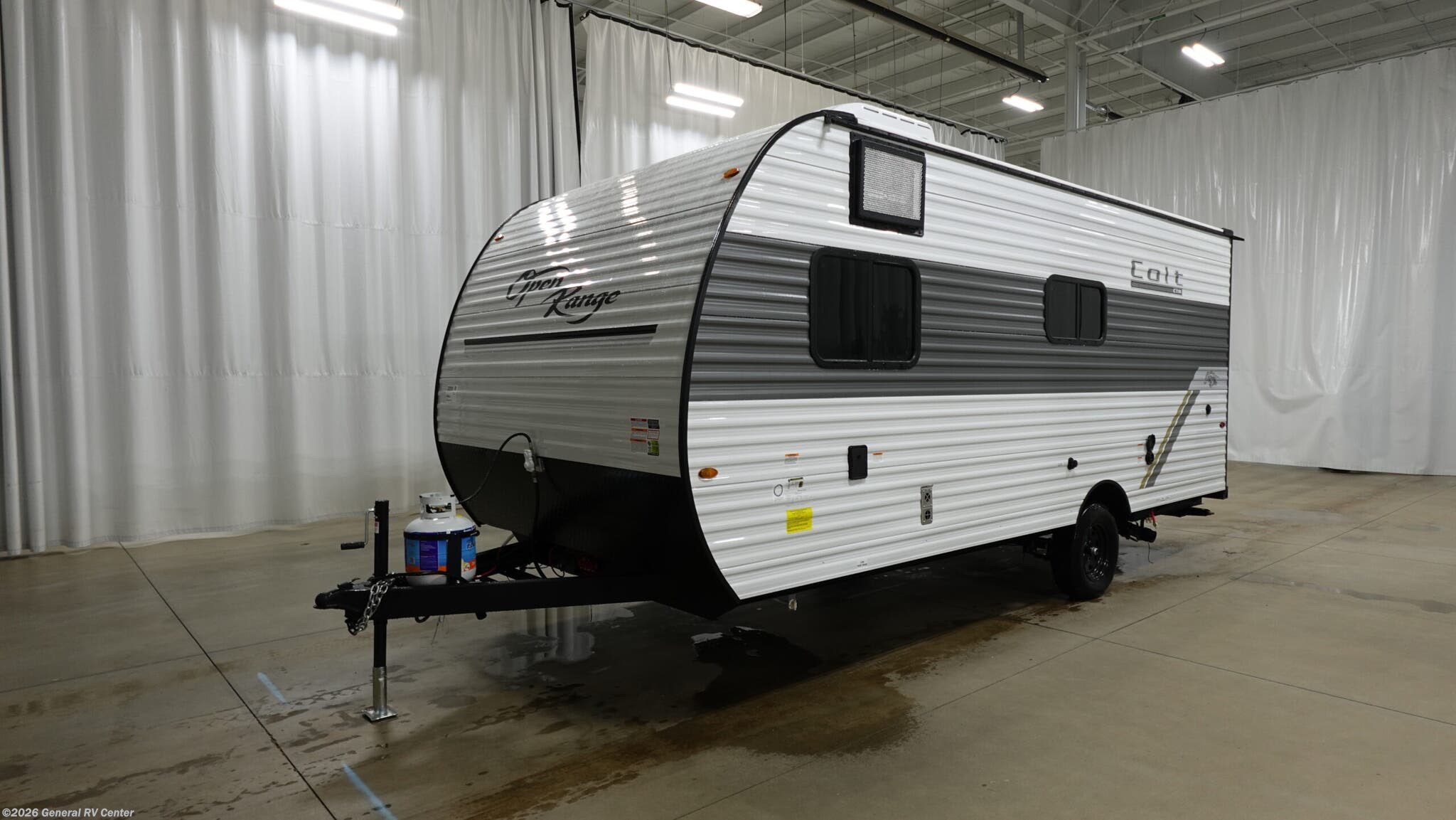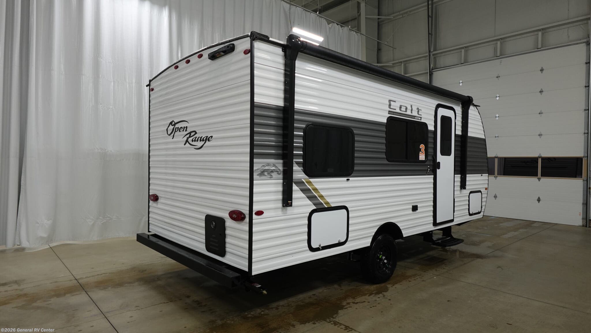 Open Range RV Colt travel trailer 17DB - CTR Edition highlights: Double-Size Bunk Beds Overhead Cabinets L-Shaped Dinette 40" Shower Front Queen Bed This easy to tow travel trailer features compact sleeping spaces thanks to the double-size bunk beds in the rear corner, and the private bath is right next to the bunks for easy nighttime use! You'll have the front queen bed to yourselves, along with a wardrobe, nightstand, and overhead shelf for your things. A two-burner cooktop and microwave oven will let you make meals each day, and there is a 12V refrigerator to keep your cold items fresh. Outside, you'll enjoy the 10' power awning for added shade, and there are two exterior storage compartments to keep fishing poles, hiking gear and more! With any Colt travel trailer by Open Range RV, you can be sure you're getting a budget-friendly unit designed to fit your lifestyle! Each one is built to last with a PVC roofing membrane and built-in A-frame, plus there are nitrogen-filled radial tires and self-adjusting electric brakes for easy towing. You will appreciate the utilities that include 30-amp service, an A/C unit, and an on-demand tankless water heater. A few interior comforts include vinyl flooring throughout, solid hardwood cabinet doors, and residential grade kitchen countertops to make your space feel more like home.