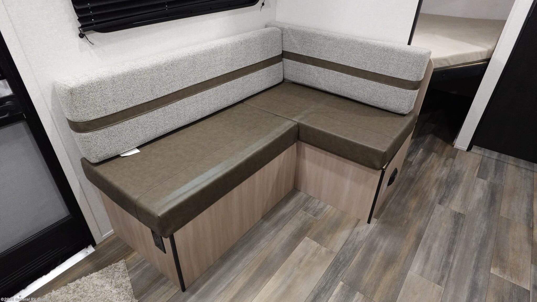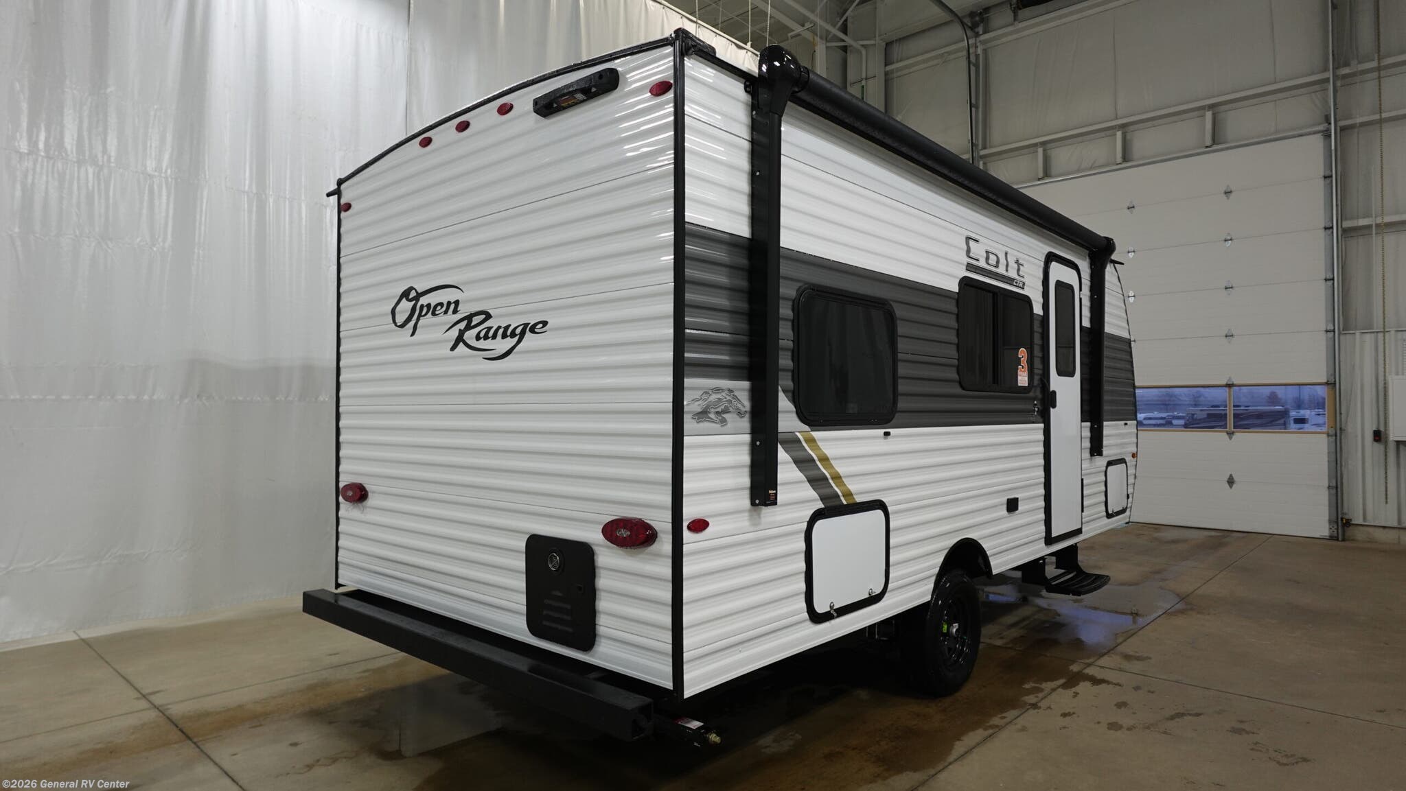 Open Range RV Colt travel trailer 17DB - CTR Edition highlights: Double-Size Bunk Beds Overhead Cabinets L-Shaped Dinette 40" Shower Front Queen Bed This easy to tow travel trailer features compact sleeping spaces thanks to the double-size bunk beds in the rear corner, and the private bath is right next to the bunks for easy nighttime use! You'll have the front queen bed to yourselves, along with a wardrobe, nightstand, and overhead shelf for your things. A two-burner cooktop and microwave oven will let you make meals each day, and there is a 12V refrigerator to keep your cold items fresh. Outside, you'll enjoy the 10' power awning for added shade, and there are two exterior storage compartments to keep fishing poles, hiking gear and more! With any Colt travel trailer by Open Range RV, you can be sure you're getting a budget-friendly unit designed to fit your lifestyle! Each one is built to last with a PVC roofing membrane and built-in A-frame, plus there are nitrogen-filled radial tires and self-adjusting electric brakes for easy towing. You will appreciate the utilities that include 30-amp service, an A/C unit, and an on-demand tankless water heater. A few interior comforts include vinyl flooring throughout, solid hardwood cabinet doors, and residential grade kitchen countertops to make your space feel more like home.