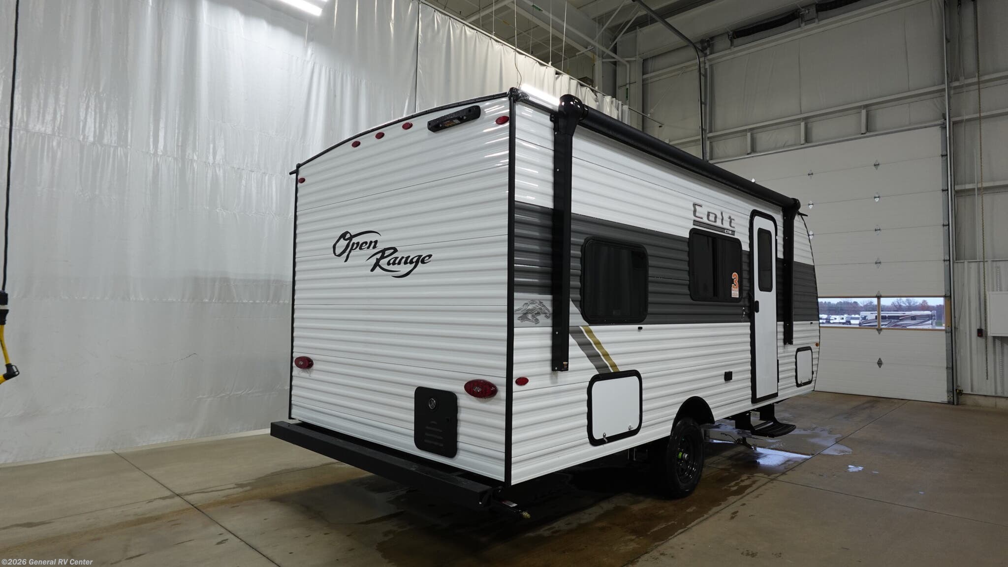 Open Range RV Colt travel trailer 17DB - CTR Edition highlights: Double-Size Bunk Beds Overhead Cabinets L-Shaped Dinette 40" Shower Front Queen Bed This easy to tow travel trailer features compact sleeping spaces thanks to the double-size bunk beds in the rear corner, and the private bath is right next to the bunks for easy nighttime use! You'll have the front queen bed to yourselves, along with a wardrobe, nightstand, and overhead shelf for your things. A two-burner cooktop and microwave oven will let you make meals each day, and there is a 12V refrigerator to keep your cold items fresh. Outside, you'll enjoy the 10' power awning for added shade, and there are two exterior storage compartments to keep fishing poles, hiking gear and more! With any Colt travel trailer by Open Range RV, you can be sure you're getting a budget-friendly unit designed to fit your lifestyle! Each one is built to last with a PVC roofing membrane and built-in A-frame, plus there are nitrogen-filled radial tires and self-adjusting electric brakes for easy towing. You will appreciate the utilities that include 30-amp service, an A/C unit, and an on-demand tankless water heater. A few interior comforts include vinyl flooring throughout, solid hardwood cabinet doors, and residential grade kitchen countertops to make your space feel more like home.
