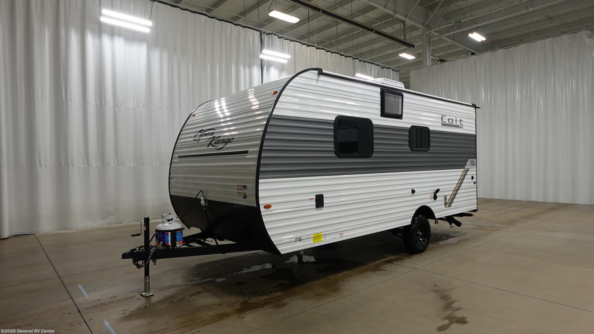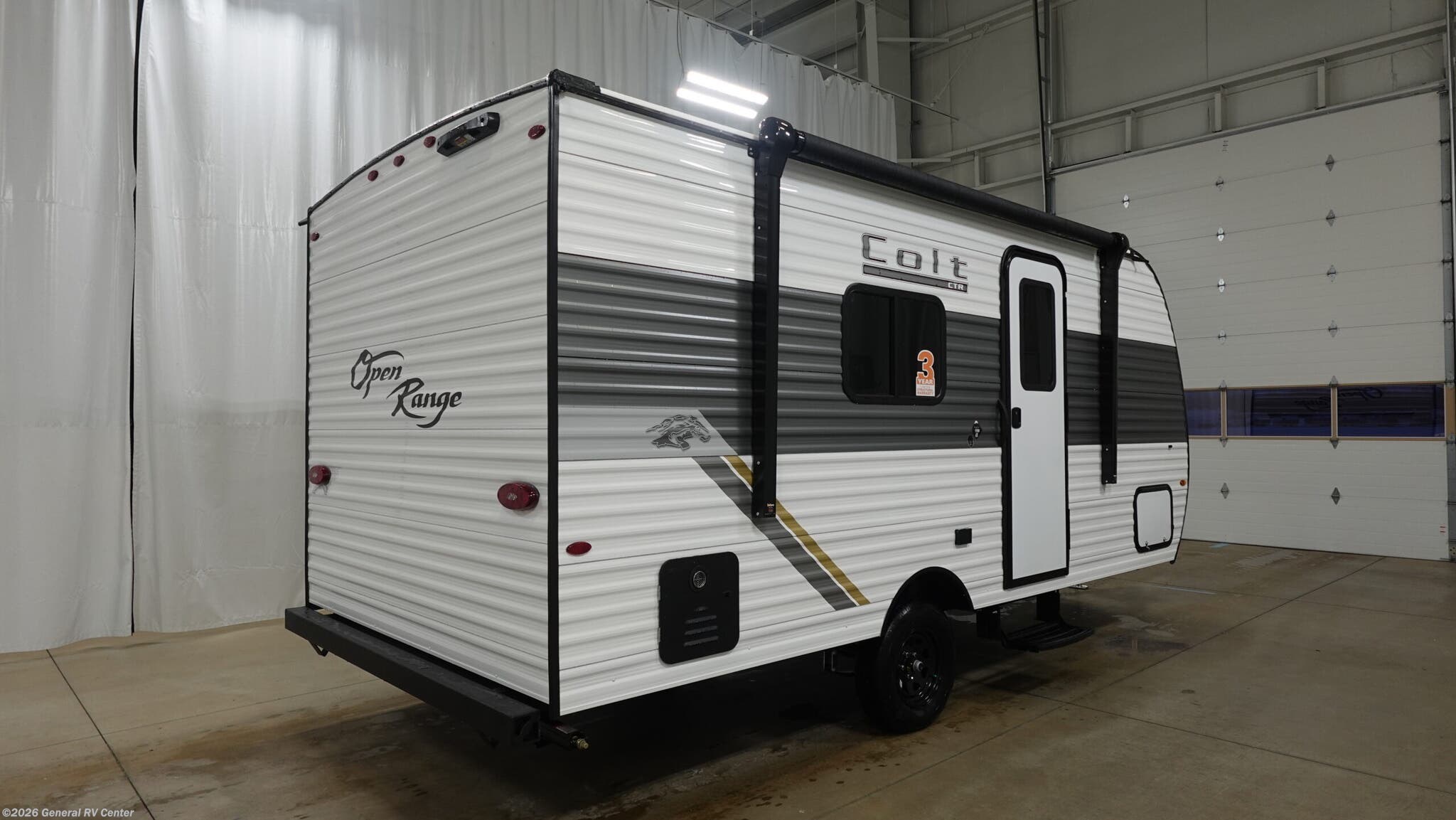 Open Range RV Colt travel trailer 17QB - CTR Edition highlights: Walk-Around Queen Bed Exterior Storage Full Rear Bath Two-Burner Cooktop This travel trailer is just what the doctor ordered! Once you've loaded up the exterior storage, you can head out to the campground of your choice. The 10' power awning can be put out when you arrive, then you can relax in your camp chairs or head inside to make lunch on the two-burner cooktop. There is also a microwave oven for quick meals and a 12V refrigerator for food storage. A booth dinette provides a place to dine together, and you can convert it to sleeping space at night for one to two guests. You'll love the front queen bed that includes an overhead shelf and a wardrobe for your things, and this unit includes a full rear bath for added privacy. Here, you'll find a 24" x 32" shower, a toilet, and a linen closet plus shelves/storage for toiletries and towels! With any Colt travel trailer by Open Range RV, you can be sure you're getting a budget-friendly unit designed to fit your lifestyle! Each one is built to last with a PVC roofing membrane and built-in A-frame, plus there are nitrogen-filled radial tires and self-adjusting electric brakes for easy towing. You will appreciate the utilities that include 30-amp service, an A/C unit, and an on-demand tankless water heater. A few interior comforts include vinyl flooring throughout, solid hardwood cabinet doors, and residential grade kitchen countertops to make your space feel more like home.