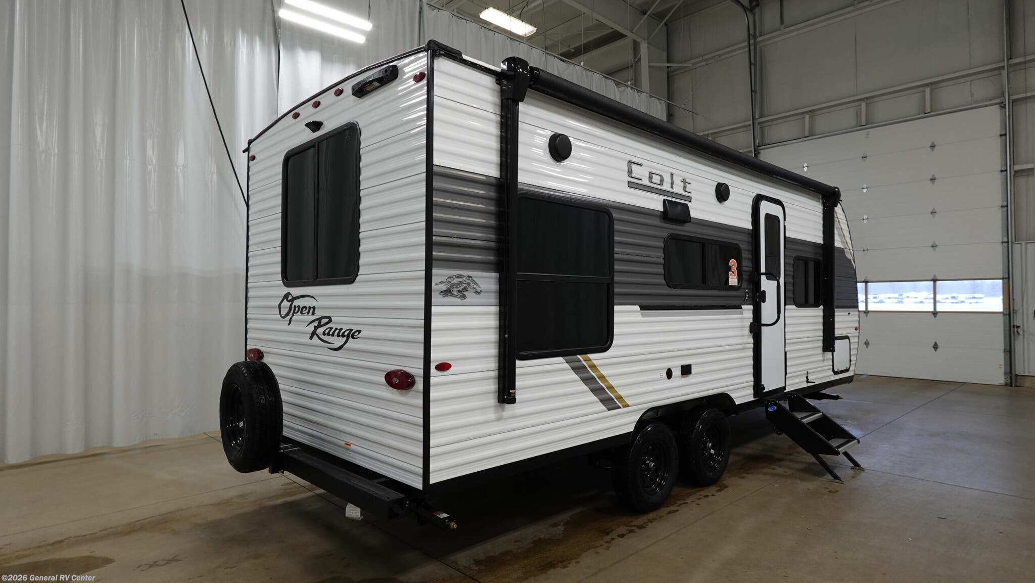 **Open Range RV Colt travel trailer 21QB highlights:** * Front RV Queen Bed * Exterior Storage * Middle Full Bath * 12V Refrigerator Make each camping trip count in this travel trailer that can sleep four to five each night. You'll wake up feeling refreshed on the front RV queen bed, and there are dual bedside wardrobes to keep your things organized. A middle bath includes a 40" tub/shower, which will make bath time easier if you have little ones. Once breakfast is made on the three-burner cooktop, you can dine at the booth dinette or take your plate outdoors to sit under the 16' power awning with LED lights. This unit also includes a jack-knife sofa, which can be used for sleeping space, along with the dinette! With any Colt travel trailer by Open Range RV, you can be sure you're getting a budget-friendly unit designed to fit your lifestyle! Each one is built to last with a PVC roofing membrane and built-in A-frame, plus there are nitrogen-filled radial tires and self-adjusting electric brakes for easy towing. You will appreciate the utilities that include 30-amp service, an A/C unit, and an on-demand tankless water heater. A few interior comforts include vinyl flooring throughout, solid hardwood cabinet doors, and residential grade kitchen countertops to make your space feel more like home.