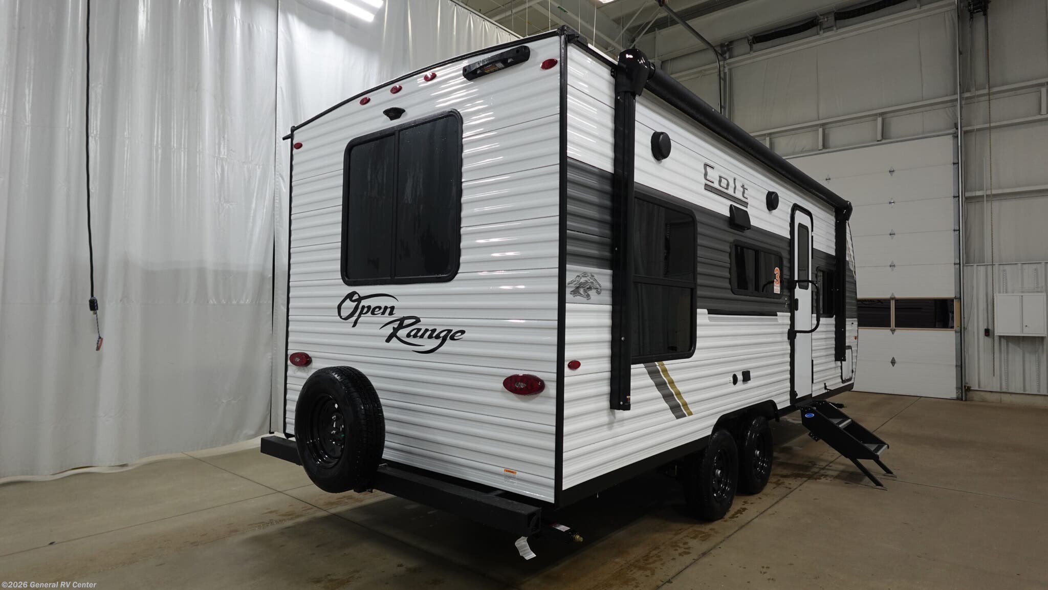 Open Range RV Colt travel trailer 21QB highlights: Front RV Queen Bed Exterior Storage Middle Full Bath 12V Refrigerator Make each camping trip count in this travel trailer that can sleep four to five each night. You'll wake up feeling refreshed on the front RV queen bed, and there are dual bedside wardrobes to keep your things organized. A middle bath includes a 40" tub/shower, which will make bath time easier if you have little ones. Once breakfast is made on the three-burner cooktop, you can dine at the booth dinette or take your plate outdoors to sit under the 16' power awning with LED lights. This unit also includes a jack-knife sofa, which can be used for sleeping space, along with the dinette! With any Colt travel trailer by Open Range RV, you can be sure you're getting a budget-friendly unit designed to fit your lifestyle! Each one is built to last with a PVC roofing membrane and built-in A-frame, plus there are nitrogen-filled radial tires and self-adjusting electric brakes for easy towing. You will appreciate the utilities that include 30-amp service, an A/C unit, and an on-demand tankless water heater. A few interior comforts include vinyl flooring throughout, solid hardwood cabinet doors, and residential grade kitchen countertops to make your space feel more like home.
