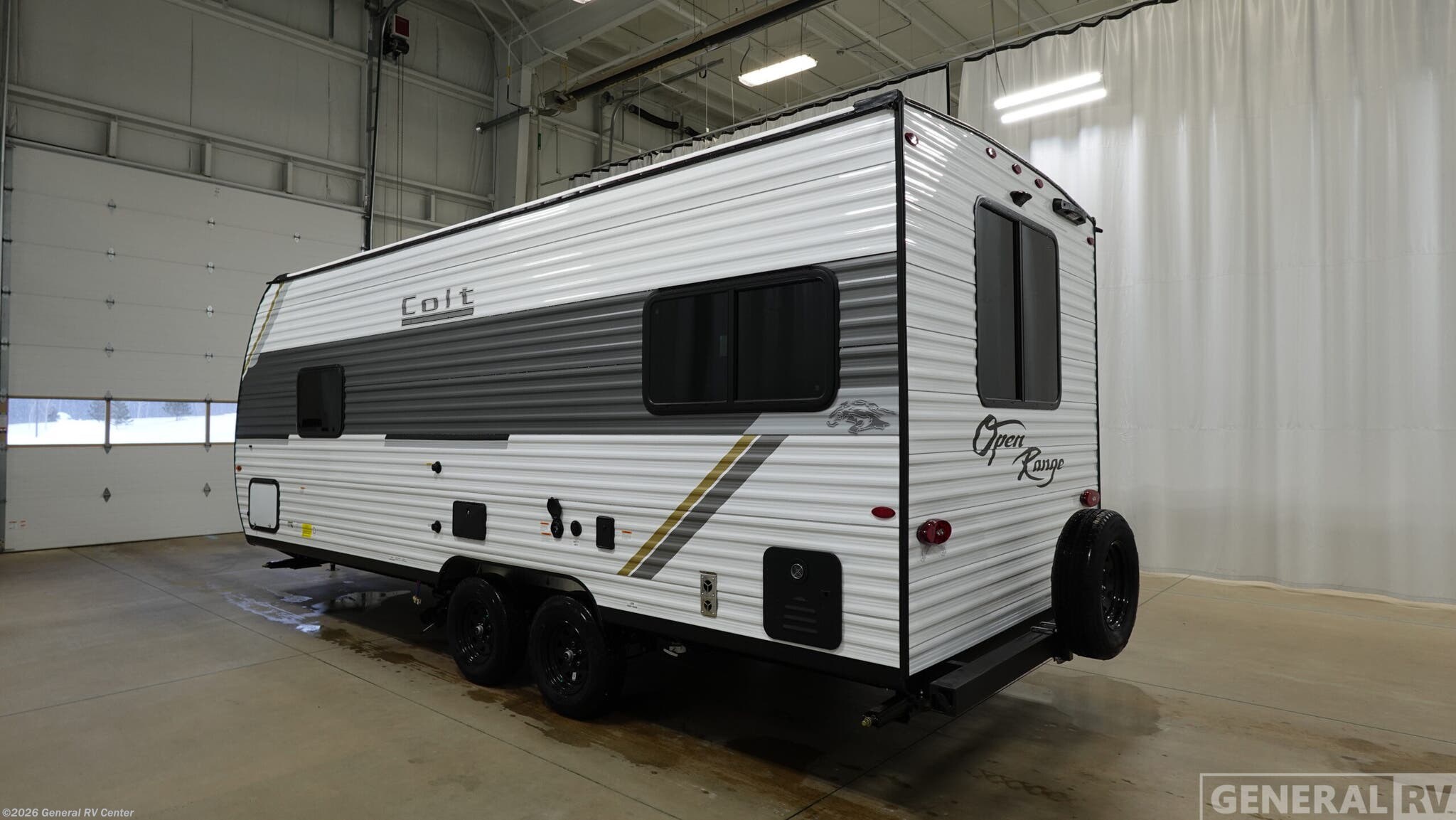 **Open Range RV Colt travel trailer 21QB highlights:** * Front RV Queen Bed * Exterior Storage * Middle Full Bath * 12V Refrigerator Make each camping trip count in this travel trailer that can sleep four to five each night. You'll wake up feeling refreshed on the front RV queen bed, and there are dual bedside wardrobes to keep your things organized. A middle bath includes a 40" tub/shower, which will make bath time easier if you have little ones. Once breakfast is made on the three-burner cooktop, you can dine at the booth dinette or take your plate outdoors to sit under the 16' power awning with LED lights. This unit also includes a jack-knife sofa, which can be used for sleeping space, along with the dinette! With any Colt travel trailer by Open Range RV, you can be sure you're getting a budget-friendly unit designed to fit your lifestyle! Each one is built to last with a PVC roofing membrane and built-in A-frame, plus there are nitrogen-filled radial tires and self-adjusting electric brakes for easy towing. You will appreciate the utilities that include 30-amp service, an A/C unit, and an on-demand tankless water heater. A few interior comforts include vinyl flooring throughout, solid hardwood cabinet doors, and residential grade kitchen countertops to make your space feel more like home.