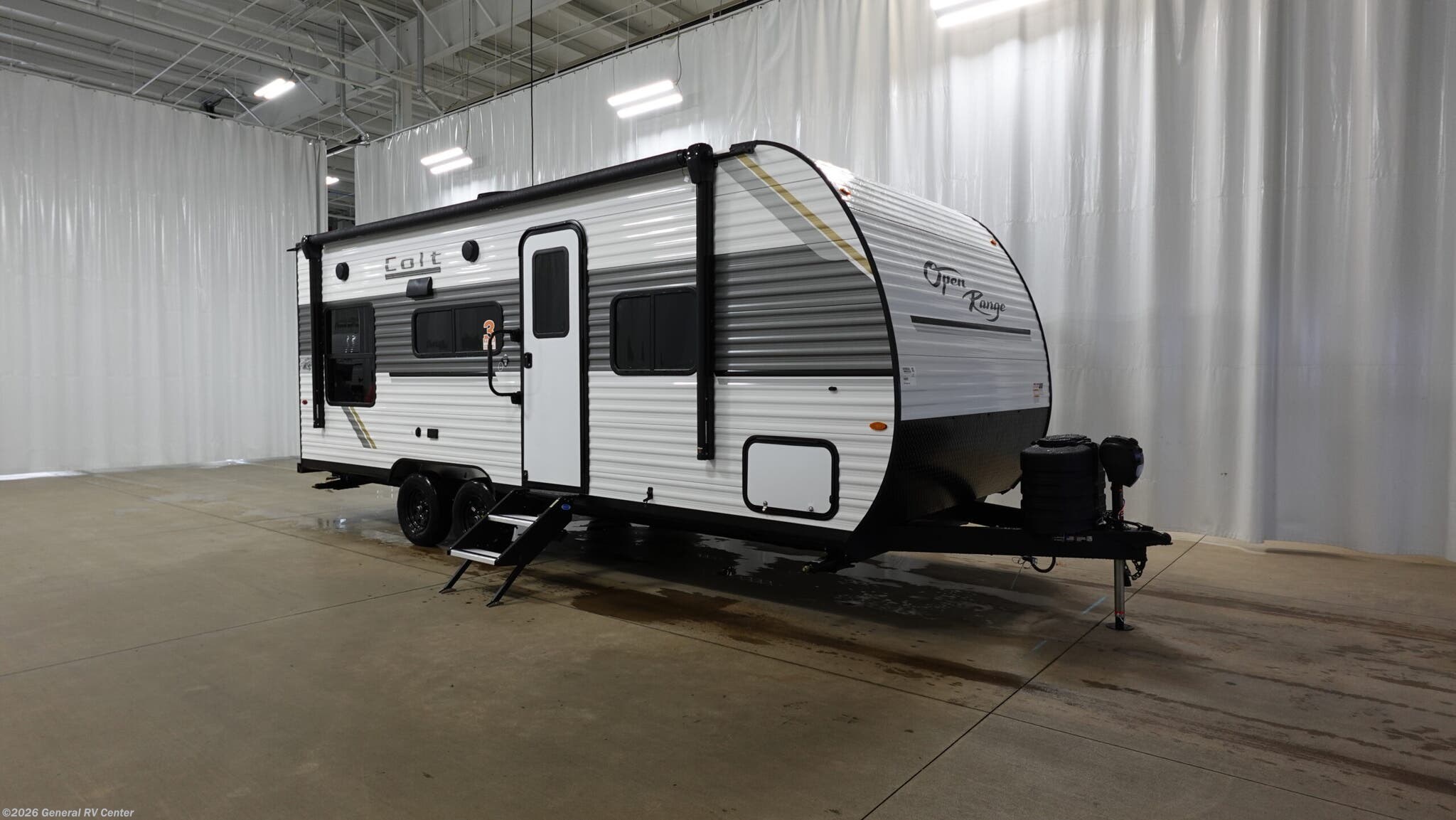 Open Range RV Colt travel trailer 21QB highlights: Front RV Queen Bed Exterior Storage Middle Full Bath 12V Refrigerator Make each camping trip count in this travel trailer that can sleep four to five each night. You'll wake up feeling refreshed on the front RV queen bed, and there are dual bedside wardrobes to keep your things organized. A middle bath includes a 40" tub/shower, which will make bath time easier if you have little ones. Once breakfast is made on the three-burner cooktop, you can dine at the booth dinette or take your plate outdoors to sit under the 16' power awning with LED lights. This unit also includes a jack-knife sofa, which can be used for sleeping space, along with the dinette! With any Colt travel trailer by Open Range RV, you can be sure you're getting a budget-friendly unit designed to fit your lifestyle! Each one is built to last with a PVC roofing membrane and built-in A-frame, plus there are nitrogen-filled radial tires and self-adjusting electric brakes for easy towing. You will appreciate the utilities that include 30-amp service, an A/C unit, and an on-demand tankless water heater. A few interior comforts include vinyl flooring throughout, solid hardwood cabinet doors, and residential grade kitchen countertops to make your space feel more like home.