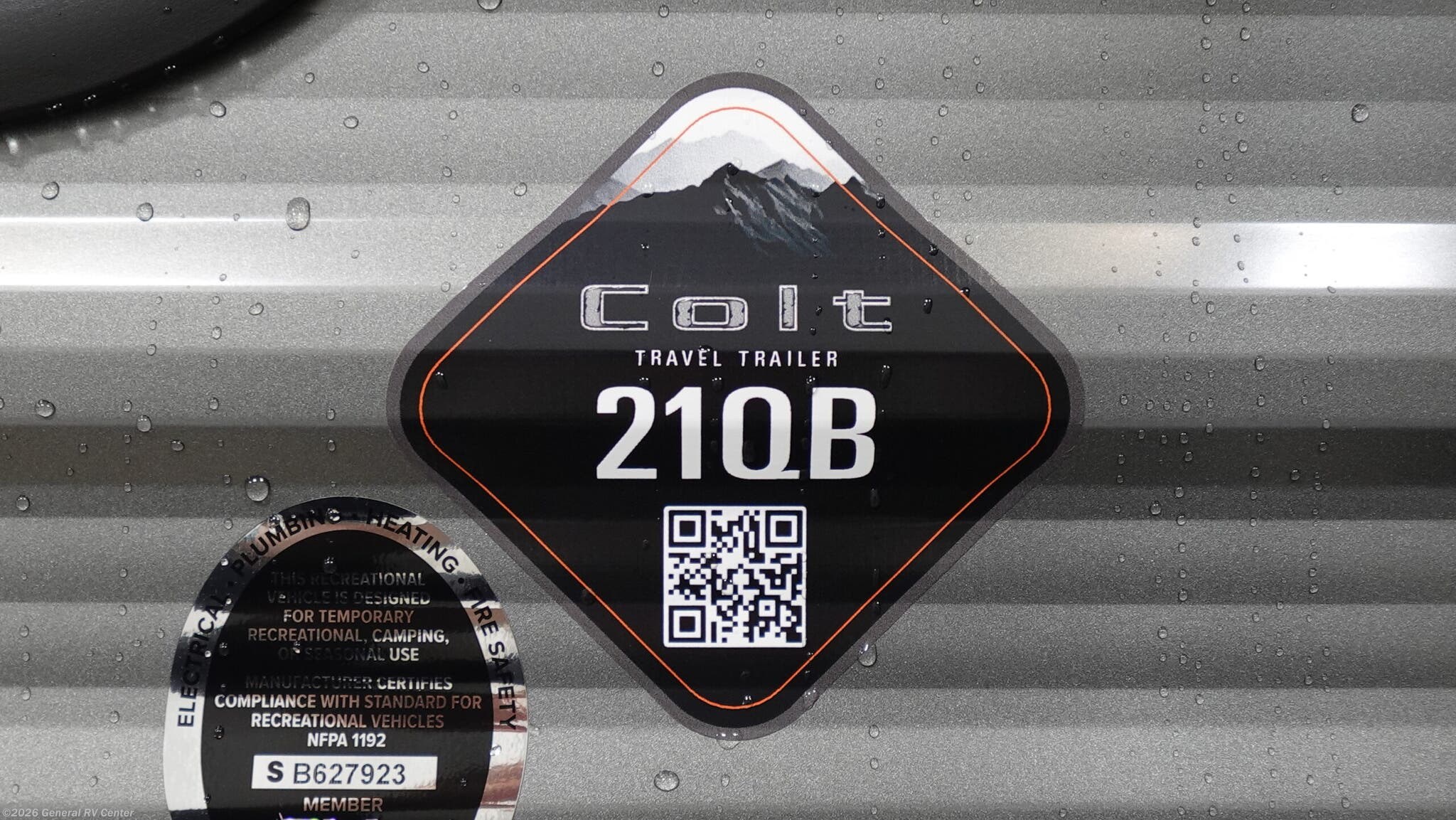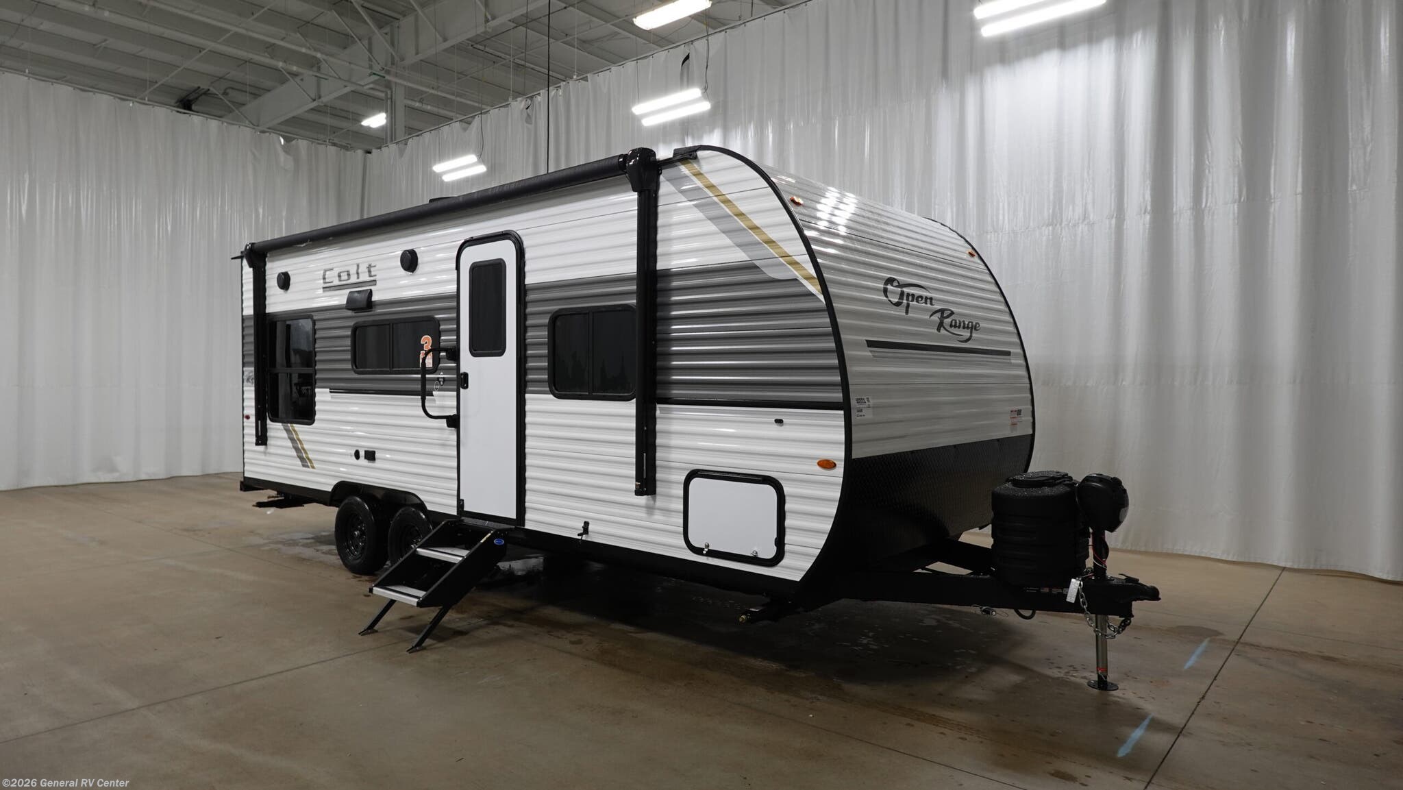 Open Range RV Colt travel trailer 21QB highlights: Front RV Queen Bed Exterior Storage Middle Full Bath 12V Refrigerator Make each camping trip count in this travel trailer that can sleep four to five each night. You'll wake up feeling refreshed on the front RV queen bed, and there are dual bedside wardrobes to keep your things organized. A middle bath includes a 40" tub/shower, which will make bath time easier if you have little ones. Once breakfast is made on the three-burner cooktop, you can dine at the booth dinette or take your plate outdoors to sit under the 16' power awning with LED lights. This unit also includes a jack-knife sofa, which can be used for sleeping space, along with the dinette! With any Colt travel trailer by Open Range RV, you can be sure you're getting a budget-friendly unit designed to fit your lifestyle! Each one is built to last with a PVC roofing membrane and built-in A-frame, plus there are nitrogen-filled radial tires and self-adjusting electric brakes for easy towing. You will appreciate the utilities that include 30-amp service, an A/C unit, and an on-demand tankless water heater. A few interior comforts include vinyl flooring throughout, solid hardwood cabinet doors, and residential grade kitchen countertops to make your space feel more like home.