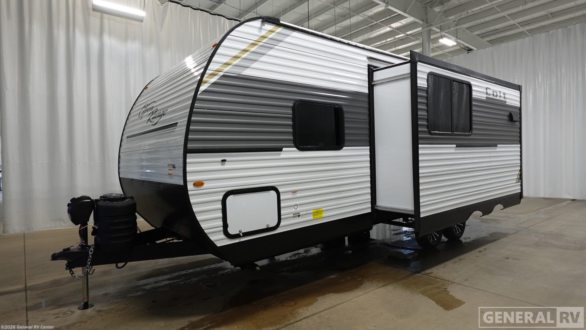 Open Range RV Colt travel trailer 22MDS highlights: Large Slide Out LP Quick Connect Spacious Full Bath Dual Bedside Wardrobes Booth Dinette This travel trailer is perfect for weekend trips to the lake! Once you arrive at the campground, you can unload the exterior storage, put out the 18' power awning with LED lights, then relax in your camp chairs. Head inside to make lunch on the three-burner cooktop in the rear corner kitchen, and you'll find the full bath in the other rear corner for quick access. A booth dinette provides a place to dine together, and a theater seat within the large slide out is sure to bring comfort. This unit includes a queen bed in the front semi-private bedroom with a privacy curtain and dual wardrobes for your things! With any Colt travel trailer by Open Range RV, you can be sure you're getting a budget-friendly unit designed to fit your lifestyle! Each one is built to last with a PVC roofing membrane and built-in A-frame, plus there are nitrogen-filled radial tires and self-adjusting electric brakes for easy towing. You will appreciate the utilities that include 30-amp service, an A/C unit, and an on-demand tankless water heater. A few interior comforts include vinyl flooring throughout, solid hardwood cabinet doors, and residential grade kitchen countertops to make your space feel more like home.