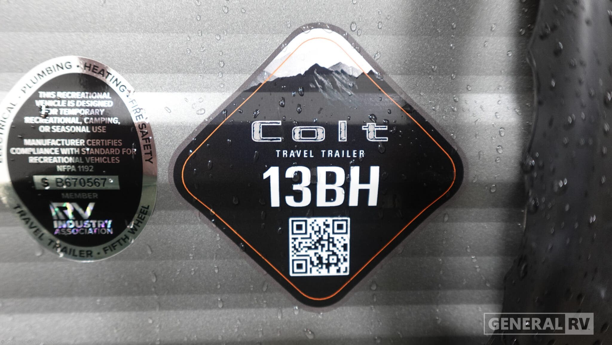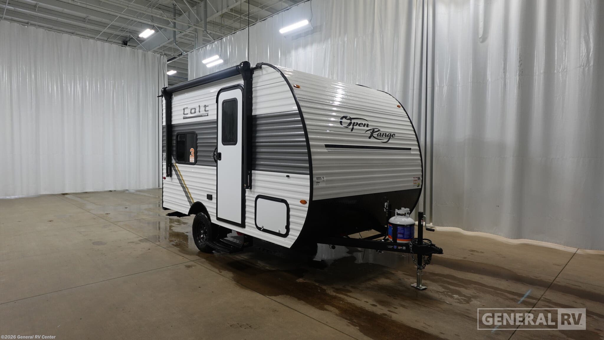 **Open Range RV Colt travel trailer 13BH - CTR Edition highlights:** - 54" x 74" Bed - Two-Burner Cooktop - Sleeps Four - Exterior Storage This lightweight travel trailer includes everything you need for comfortable camping trips at the lake. You can make your meals on the two-burner cooktop or in the microwave oven, and a 12V refrigerator will keep leftovers fresh. A front bed provides a great night's rest, and there are 30" x 73" bunk beds for your guests or little ones. And a private bath with a shower and toilet will let you easily freshen up without having to use the camp's facilities! With any Colt travel trailer by Open Range RV, you can be sure you're getting a budget-friendly unit designed to fit your lifestyle! Each one is built to last with a PVC roofing membrane and built-in A-frame, plus there are nitrogen-filled radial tires and self-adjusting electric brakes for easy towing. You will appreciate the utilities that include 30-amp service, an A/C unit, and an on-demand tankless water heater. A few interior comforts include vinyl flooring throughout, solid hardwood cabinet doors, and residential grade kitchen countertops to make your space feel more like home.
