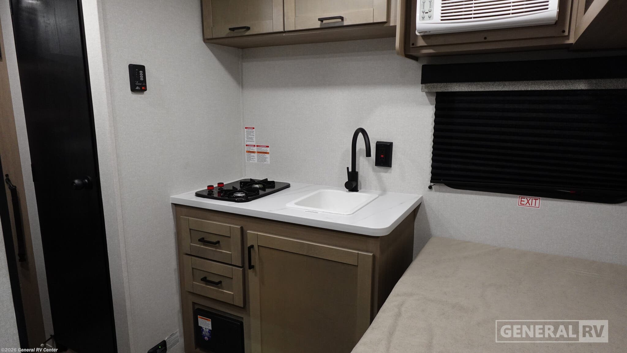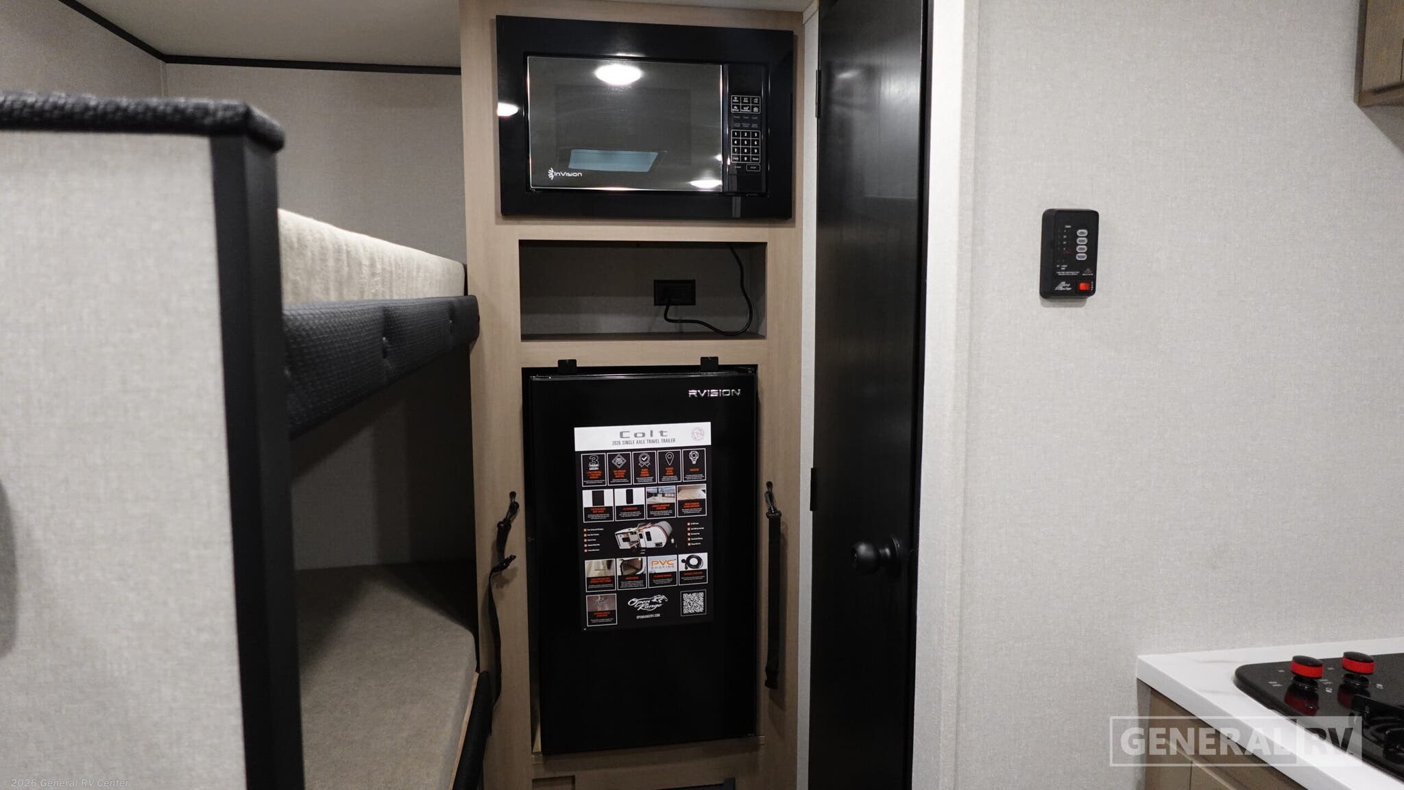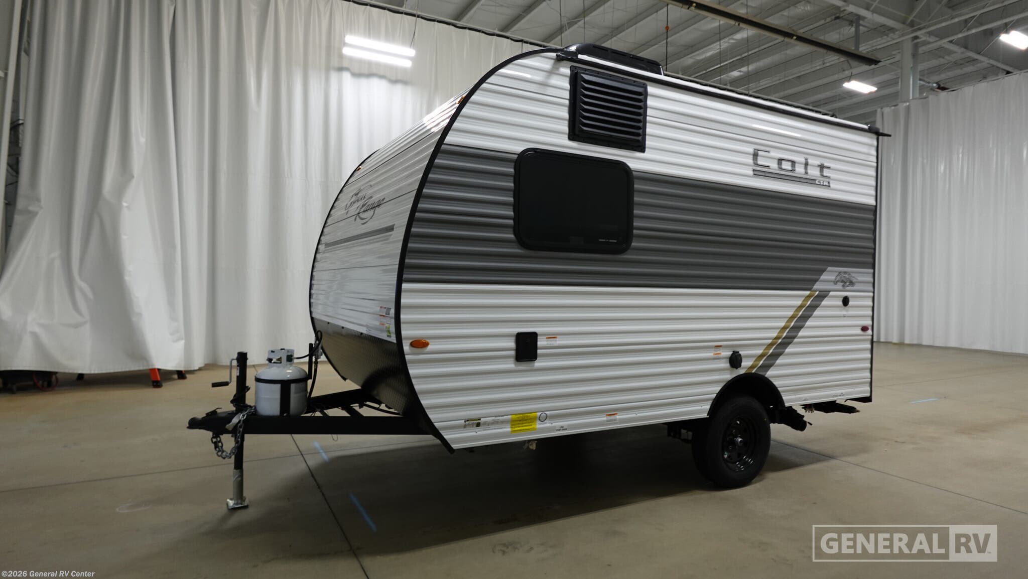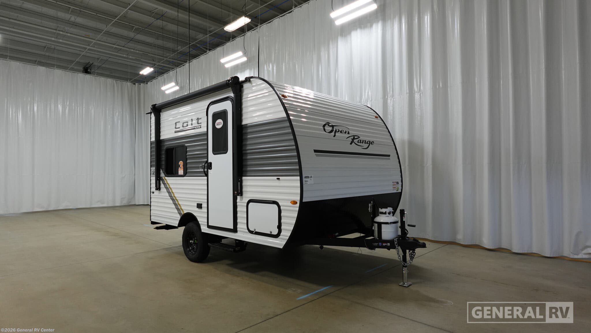 **Open Range RV Colt travel trailer 13BH - CTR Edition highlights:** - 54" x 74" Bed - Two-Burner Cooktop - Sleeps Four - Exterior Storage This lightweight travel trailer includes everything you need for comfortable camping trips at the lake. You can make your meals on the two-burner cooktop or in the microwave oven, and a 12V refrigerator will keep leftovers fresh. A front bed provides a great night's rest, and there are 30" x 73" bunk beds for your guests or little ones. And a private bath with a shower and toilet will let you easily freshen up without having to use the camp's facilities! With any Colt travel trailer by Open Range RV, you can be sure you're getting a budget-friendly unit designed to fit your lifestyle! Each one is built to last with a PVC roofing membrane and built-in A-frame, plus there are nitrogen-filled radial tires and self-adjusting electric brakes for easy towing. You will appreciate the utilities that include 30-amp service, an A/C unit, and an on-demand tankless water heater. A few interior comforts include vinyl flooring throughout, solid hardwood cabinet doors, and residential grade kitchen countertops to make your space feel more like home.