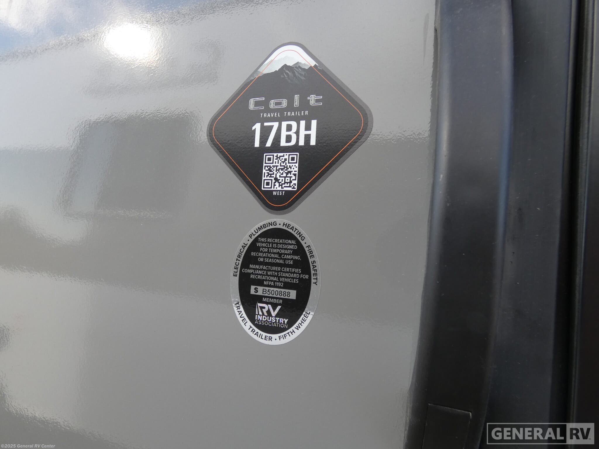 Open Range RV Colt travel trailer 17BH - CTR Edition highlights: Bunk Beds Overhead Cabinets Exterior Storage 36" Tub/Shower Front Queen Bed This easy to tow travel trailer features compact sleeping spaces thanks to the bunk beds in the rear corner, and the private bath is right next to the bunks for easy nighttime use! You'll have the front queen bed to yourselves, while another guest or two little ones convert the booth dinette to sleeping space. A two-burner cooktop and microwave oven will let you make meals each day, and there is a 12V refrigerator to keep your cold items fresh. Outside, you'll enjoy the 10' power awning for added shade, and there is exterior storage to keep fishing poles, hiking gear and more! With any Colt travel trailer by Open Range RV, you can be sure you're getting a budget-friendly unit designed to fit your lifestyle! Each one is built to last with a PVC roofing membrane and built-in A-frame, plus there are nitrogen-filled radial tires and self-adjusting electric brakes for easy towing. You will appreciate the utilities that include 30-amp service, an A/C unit, and an on-demand tankless water heater. A few interior comforts include vinyl flooring throughout, solid hardwood cabinet doors, and residential grade kitchen countertops to make your space feel more like home.