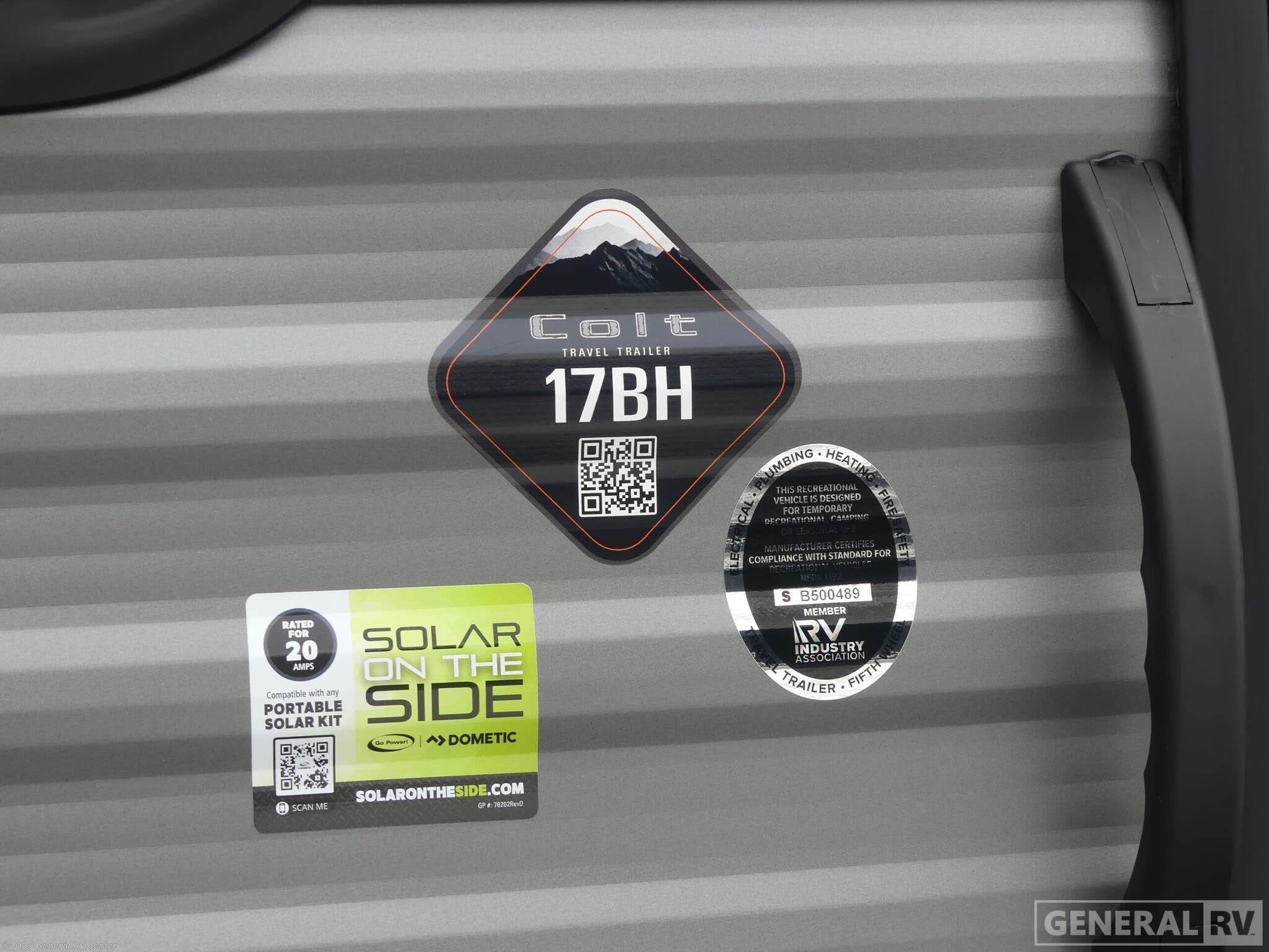 Open Range RV Colt travel trailer 17BH - CTR Edition highlights: Bunk Beds Overhead Cabinets Exterior Storage 36" Tub/Shower Front Queen Bed This easy to tow travel trailer features compact sleeping spaces thanks to the bunk beds in the rear corner, and the private bath is right next to the bunks for easy nighttime use! You'll have the front queen bed to yourselves, while another guest or two little ones convert the booth dinette to sleeping space. A two-burner cooktop and microwave oven will let you make meals each day, and there is a 12V refrigerator to keep your cold items fresh. Outside, you'll enjoy the 10' power awning for added shade, and there is exterior storage to keep fishing poles, hiking gear and more! With any Colt travel trailer by Open Range RV, you can be sure you're getting a budget-friendly unit designed to fit your lifestyle! Each one is built to last with a PVC roofing membrane and built-in A-frame, plus there are nitrogen-filled radial tires and self-adjusting electric brakes for easy towing. You will appreciate the utilities that include 30-amp service, an A/C unit, and an on-demand tankless water heater. A few interior comforts include vinyl flooring throughout, solid hardwood cabinet doors, and residential grade kitchen countertops to make your space feel more like home.