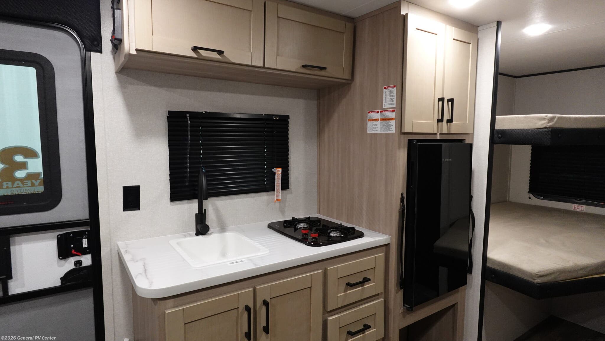 Open Range RV Colt travel trailer 17DBS - CTR Edition highlights: Double-Size Bunk Beds Overhead Cabinets Private Bath Front Queen Bed U-Shaped Dinette Slide This easy to tow travel trailer features compact sleeping spaces thanks to the double-size bunk beds in the rear corner, and the private bath is right next to the bunks for easy nighttime use! You'll have the front queen bed to yourselves, along with a wardrobe, nightstand, and overhead shelf for your things. And any other guests can convert the U-shaped dinette to sleeping space, allowing you to sleep eight total in this unit! A two-burner cooktop and microwave oven will let you make meals each day, and there is a 12V refrigerator to keep your cold items fresh. Outside, you'll enjoy the 10' power awning for added shade, and there are two exterior storage compartments to keep fishing poles, hiking gear and more! With any Colt travel trailer by Open Range RV, you can be sure you're getting a budget-friendly unit designed to fit your lifestyle! Each one is built to last with a PVC roofing membrane and built-in A-frame, plus there are nitrogen-filled radial tires and self-adjusting electric brakes for easy towing. You will appreciate the utilities that include 30-amp service, an A/C unit, and an on-demand tankless water heater. A few interior comforts include vinyl flooring throughout, solid hardwood cabinet doors, and residential grade kitchen countertops to make your space feel more like home.
