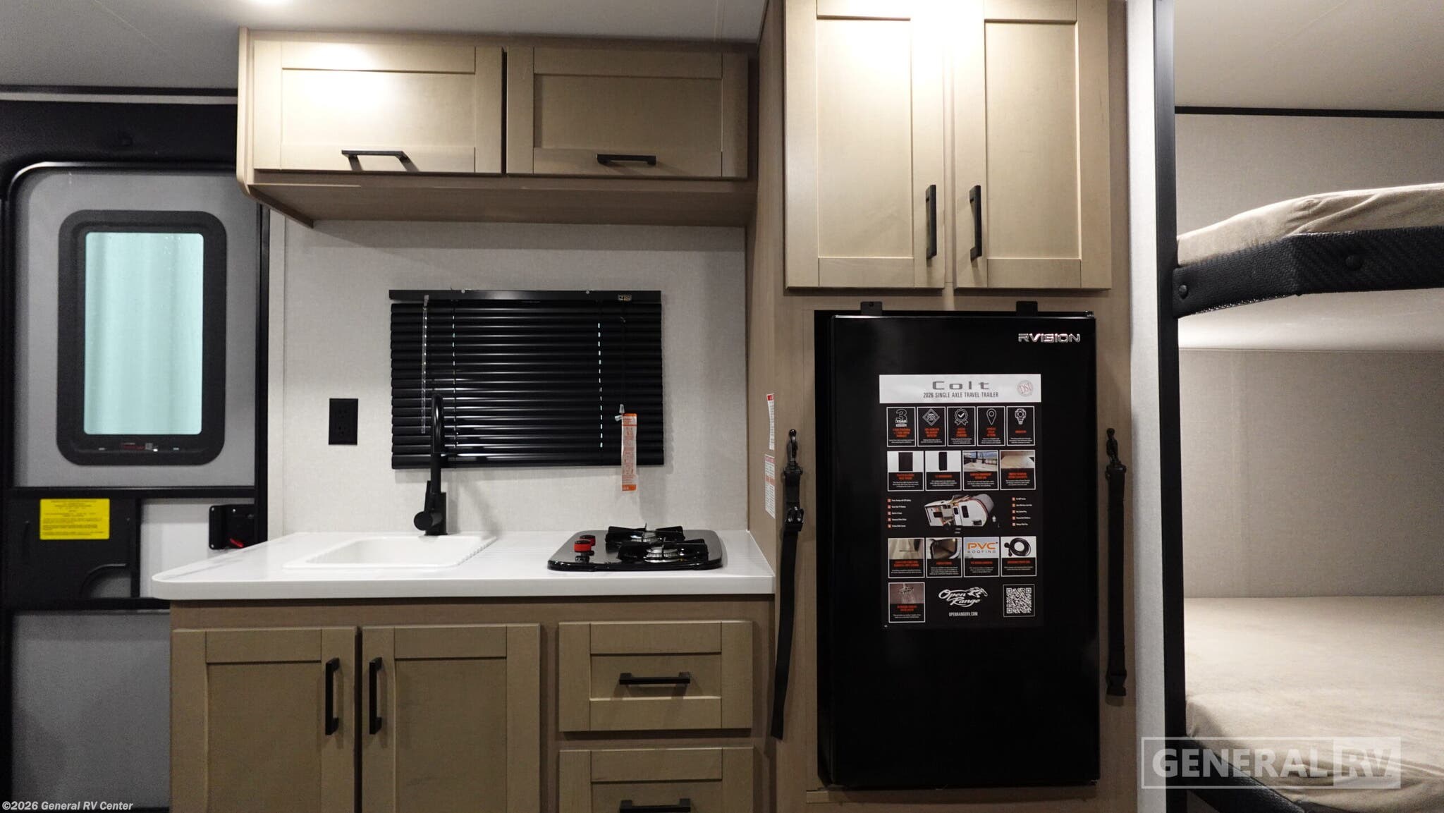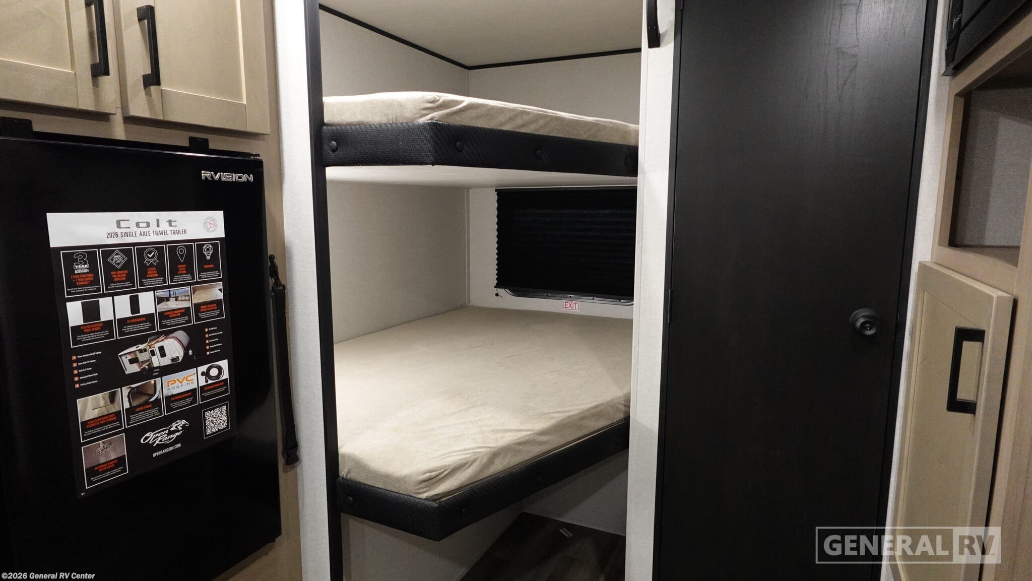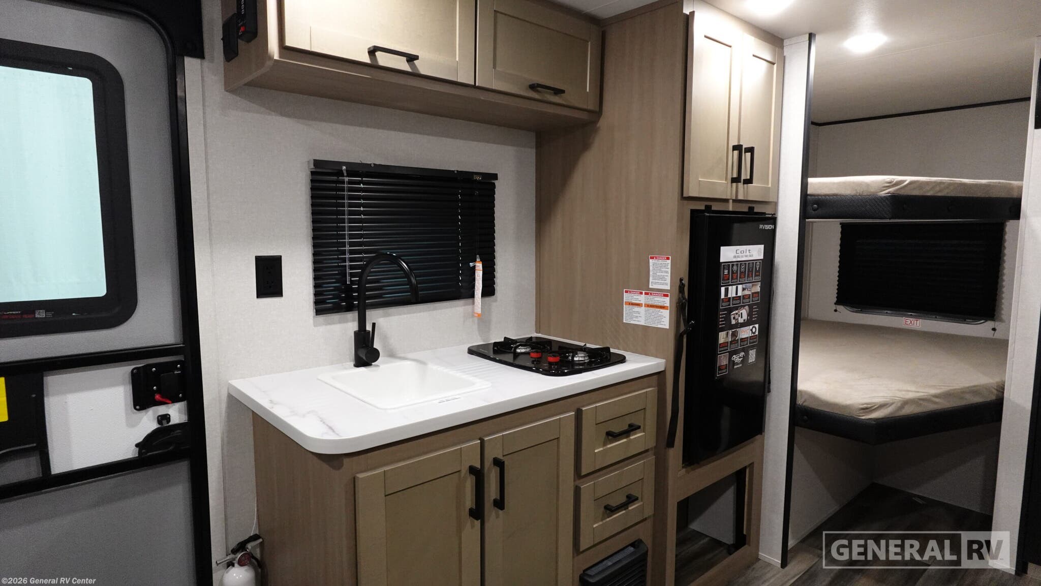 **Open Range RV Colt travel trailer 17DBS - CTR Edition highlights:** - Double-Size Bunk Beds - Overhead Cabinets - Private Bath - Front Queen Bed - U-Shaped Dinette Slide This easy to tow travel trailer features compact sleeping spaces thanks to the double-size bunk beds in the rear corner, and the private bath is right next to the bunks for easy nighttime use! You'll have the front queen bed to yourselves, along with a wardrobe, nightstand, and overhead shelf for your things. And any other guests can convert the U-shaped dinette to sleeping space, allowing you to sleep eight total in this unit! A two-burner cooktop and microwave oven will let you make meals each day, and there is a 12V refrigerator to keep your cold items fresh. Outside, you'll enjoy the 10' power awning for added shade, and there are two exterior storage compartments to keep fishing poles, hiking gear and more! With any Colt travel trailer by Open Range RV, you can be sure you're getting a budget-friendly unit designed to fit your lifestyle! Each one is built to last with a PVC roofing membrane and built-in A-frame, plus there are nitrogen-filled radial tires and self-adjusting electric brakes for easy towing. You will appreciate the utilities that include 30-amp service, an A/C unit, and an on-demand tankless water heater. A few interior comforts include vinyl flooring throughout, solid hardwood cabinet doors, and residential grade kitchen countertops to make your space feel more like home.