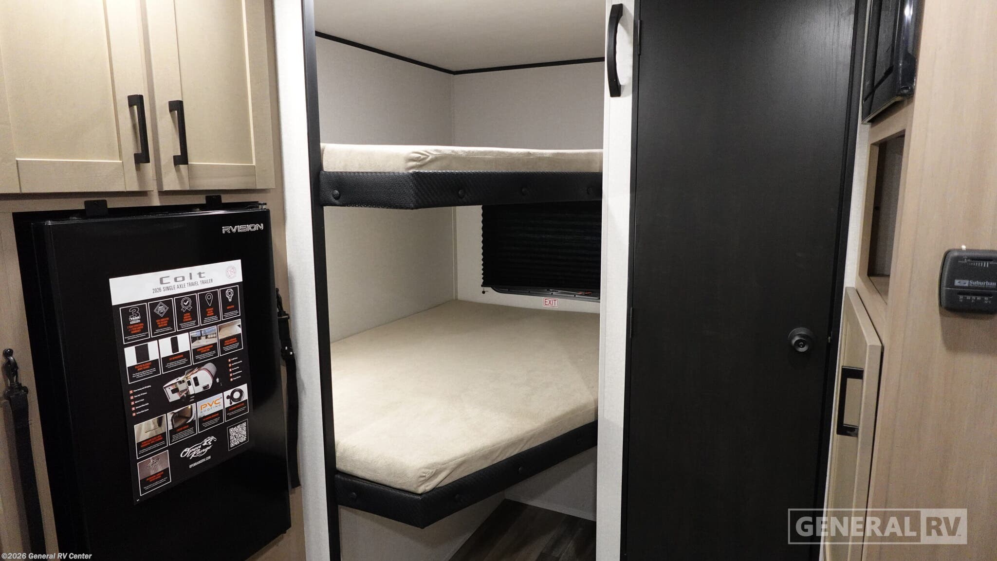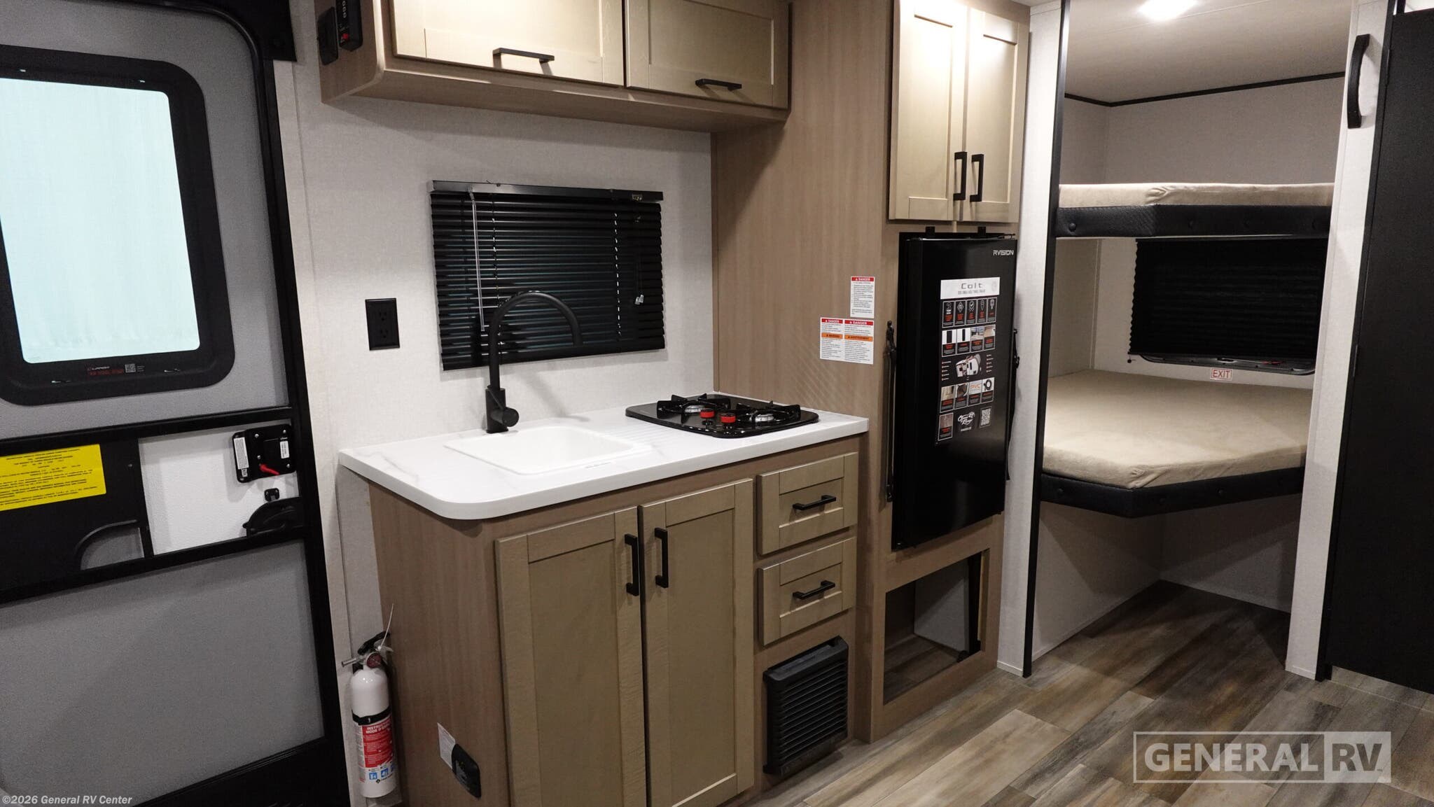 **Open Range RV Colt travel trailer 17DBS - CTR Edition highlights:** - Double-Size Bunk Beds - Overhead Cabinets - Private Bath - Front Queen Bed - U-Shaped Dinette Slide This easy to tow travel trailer features compact sleeping spaces thanks to the double-size bunk beds in the rear corner, and the private bath is right next to the bunks for easy nighttime use! You'll have the front queen bed to yourselves, along with a wardrobe, nightstand, and overhead shelf for your things. And any other guests can convert the U-shaped dinette to sleeping space, allowing you to sleep eight total in this unit! A two-burner cooktop and microwave oven will let you make meals each day, and there is a 12V refrigerator to keep your cold items fresh. Outside, you'll enjoy the 10' power awning for added shade, and there are two exterior storage compartments to keep fishing poles, hiking gear and more! With any Colt travel trailer by Open Range RV, you can be sure you're getting a budget-friendly unit designed to fit your lifestyle! Each one is built to last with a PVC roofing membrane and built-in A-frame, plus there are nitrogen-filled radial tires and self-adjusting electric brakes for easy towing. You will appreciate the utilities that include 30-amp service, an A/C unit, and an on-demand tankless water heater. A few interior comforts include vinyl flooring throughout, solid hardwood cabinet doors, and residential grade kitchen countertops to make your space feel more like home.