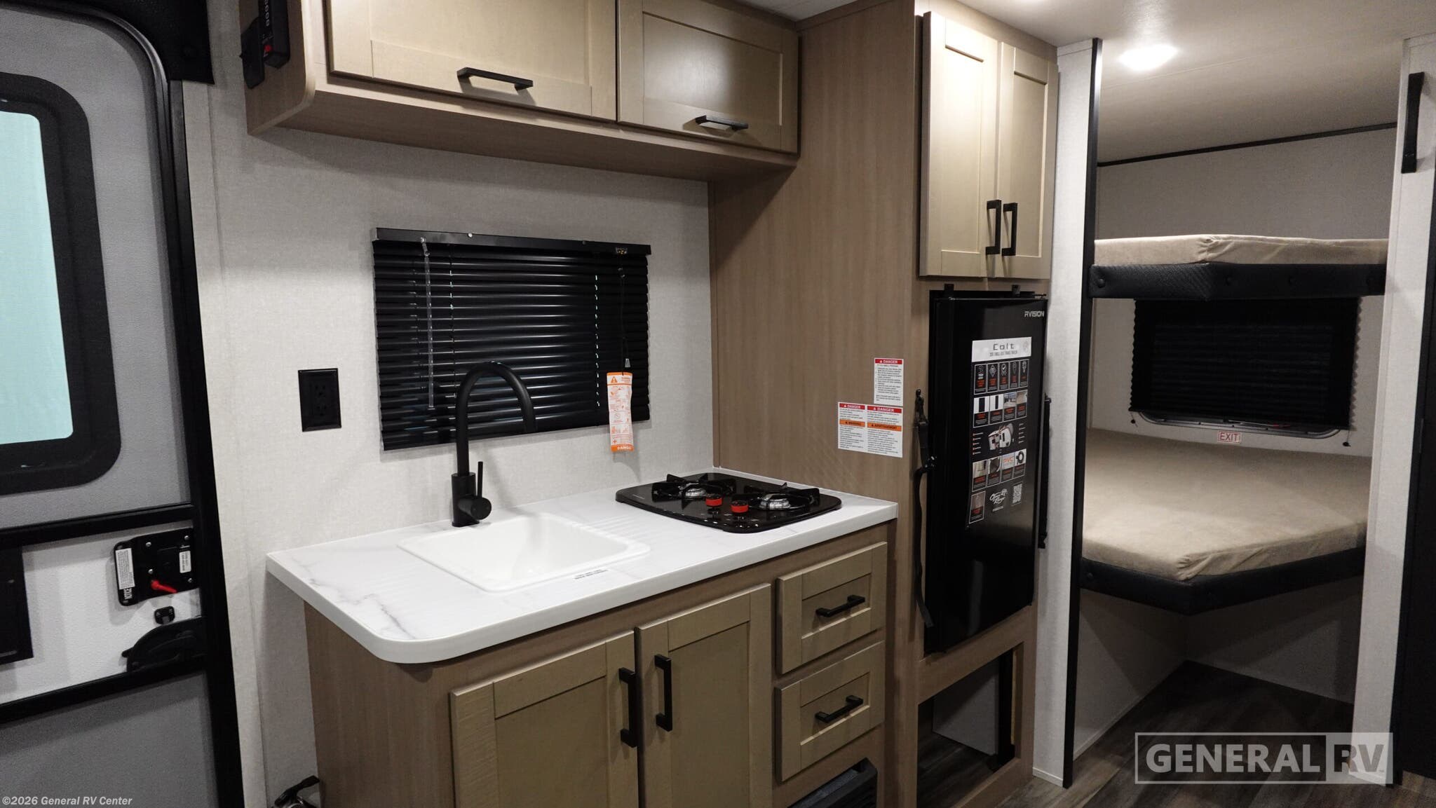 **Open Range RV Colt travel trailer 17DBS - CTR Edition highlights:** - Double-Size Bunk Beds - Overhead Cabinets - Private Bath - Front Queen Bed - U-Shaped Dinette Slide This easy to tow travel trailer features compact sleeping spaces thanks to the double-size bunk beds in the rear corner, and the private bath is right next to the bunks for easy nighttime use! You'll have the front queen bed to yourselves, along with a wardrobe, nightstand, and overhead shelf for your things. And any other guests can convert the U-shaped dinette to sleeping space, allowing you to sleep eight total in this unit! A two-burner cooktop and microwave oven will let you make meals each day, and there is a 12V refrigerator to keep your cold items fresh. Outside, you'll enjoy the 10' power awning for added shade, and there are two exterior storage compartments to keep fishing poles, hiking gear and more! With any Colt travel trailer by Open Range RV, you can be sure you're getting a budget-friendly unit designed to fit your lifestyle! Each one is built to last with a PVC roofing membrane and built-in A-frame, plus there are nitrogen-filled radial tires and self-adjusting electric brakes for easy towing. You will appreciate the utilities that include 30-amp service, an A/C unit, and an on-demand tankless water heater. A few interior comforts include vinyl flooring throughout, solid hardwood cabinet doors, and residential grade kitchen countertops to make your space feel more like home.