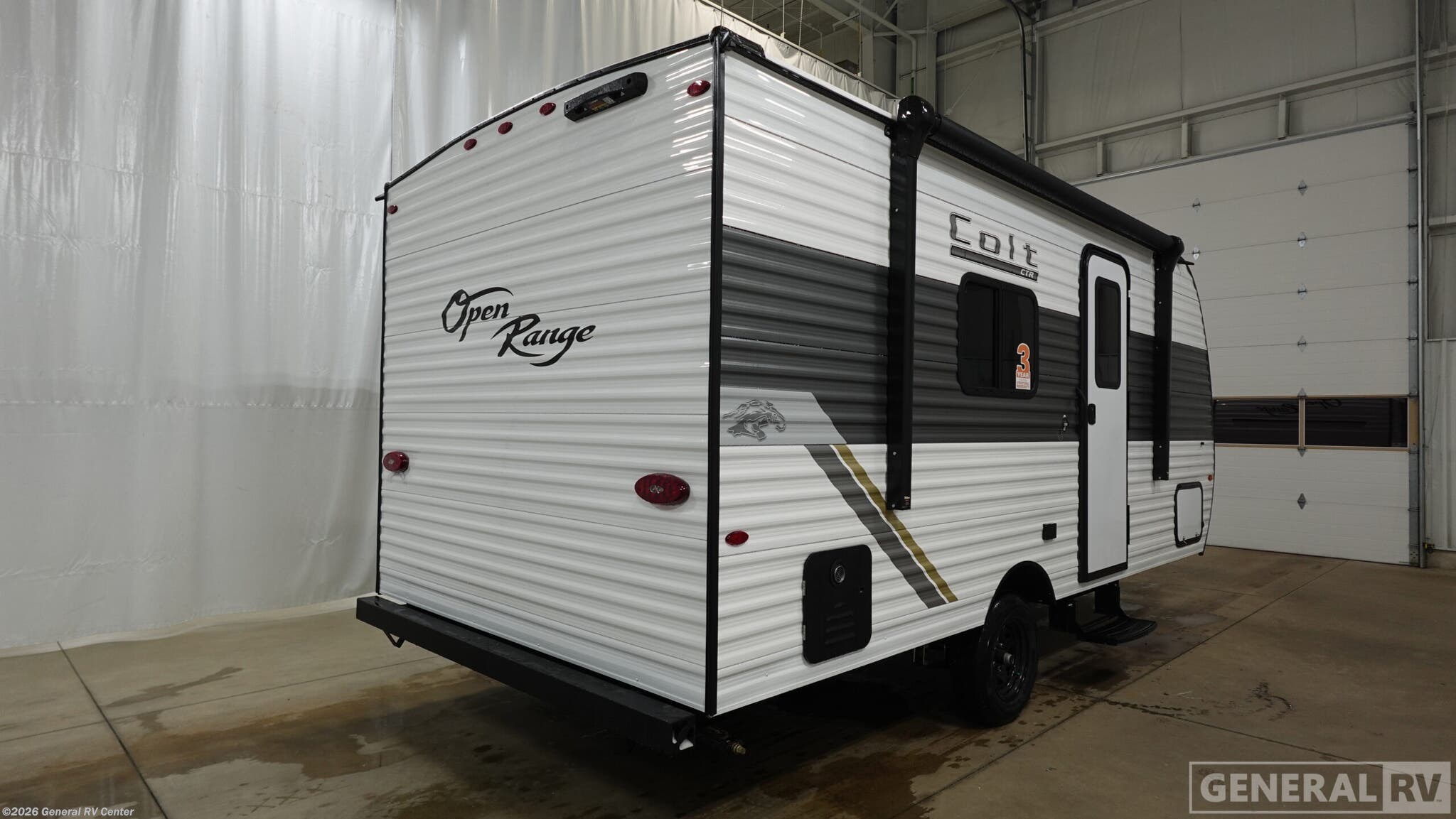 Open Range RV Colt travel trailer 17QB - CTR Edition highlights: Walk-Around Queen Bed Exterior Storage Full Rear Bath Two-Burner Cooktop This travel trailer is just what the doctor ordered! Once you've loaded up the exterior storage, you can head out to the campground of your choice. The 10' power awning can be put out when you arrive, then you can relax in your camp chairs or head inside to make lunch on the two-burner cooktop. There is also a microwave oven for quick meals and a 12V refrigerator for food storage. A booth dinette provides a place to dine together, and you can convert it to sleeping space at night for one to two guests. You'll love the front queen bed that includes an overhead shelf and a wardrobe for your things, and this unit includes a full rear bath for added privacy. Here, you'll find a 24" x 32" shower, a toilet, and a linen closet plus shelves/storage for toiletries and towels! With any Colt travel trailer by Open Range RV, you can be sure you're getting a budget-friendly unit designed to fit your lifestyle! Each one is built to last with a PVC roofing membrane and built-in A-frame, plus there are nitrogen-filled radial tires and self-adjusting electric brakes for easy towing. You will appreciate the utilities that include 30-amp service, an A/C unit, and an on-demand tankless water heater. A few interior comforts include vinyl flooring throughout, solid hardwood cabinet doors, and residential grade kitchen countertops to make your space feel more like home.