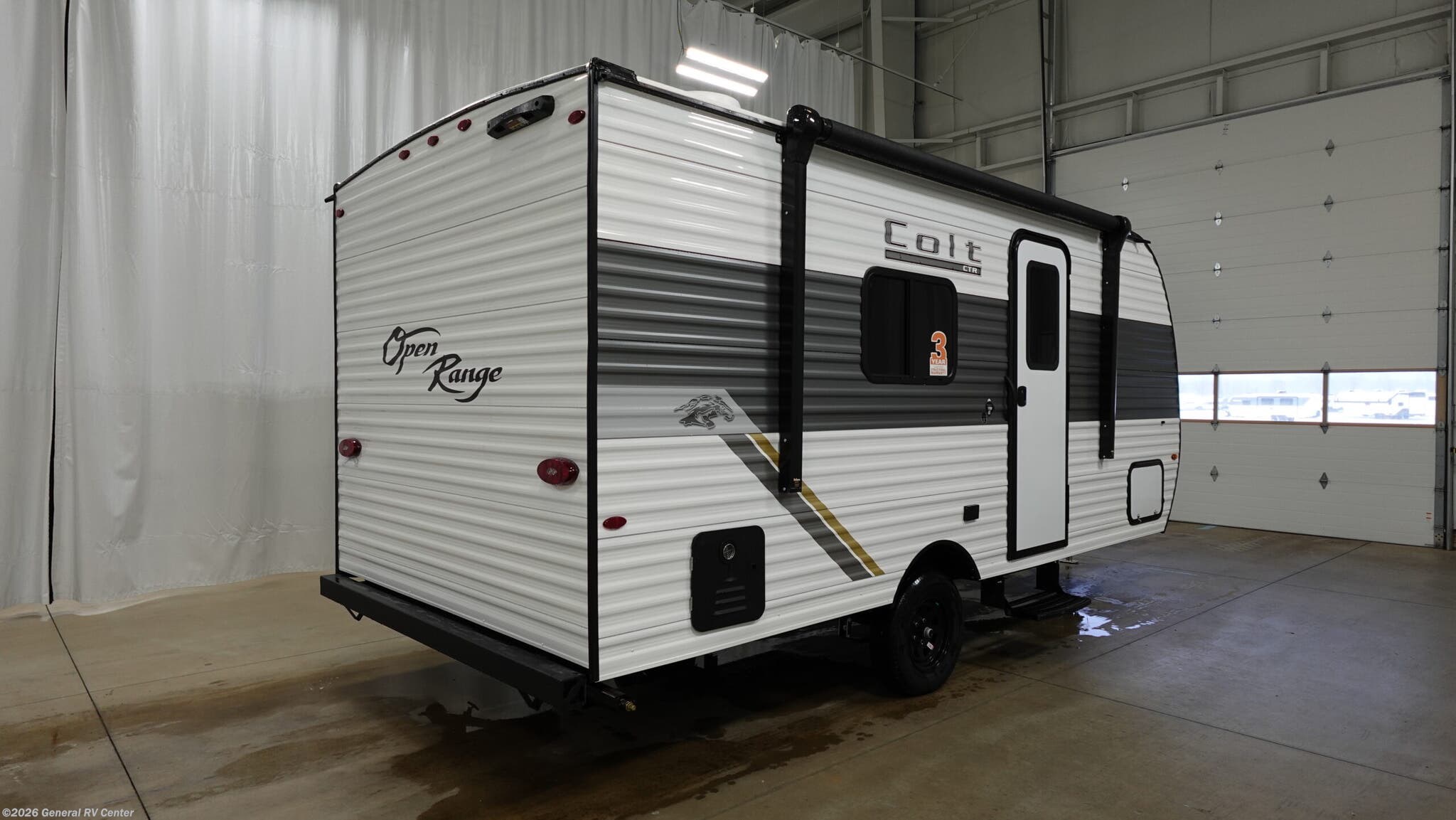 **Open Range RV Colt travel trailer 17QB - CTR Edition highlights:** * Walk-Around Queen Bed * Exterior Storage * Full Rear Bath * Two-Burner Cooktop This travel trailer is just what the doctor ordered! Once you've loaded up the exterior storage, you can head out to the campground of your choice. The 10' power awning can be put out when you arrive, then you can relax in your camp chairs or head inside to make lunch on the two-burner cooktop. There is also a microwave oven for quick meals and a 12V refrigerator for food storage. A booth dinette provides a place to dine together, and you can convert it to sleeping space at night for one to two guests. You'll love the front queen bed that includes an overhead shelf and a wardrobe for your things, and this unit includes a full rear bath for added privacy. Here, you'll find a 24" x 32" shower, a toilet, and a linen closet plus shelves/storage for toiletries and towels! With any Colt travel trailer by Open Range RV, you can be sure you're getting a budget-friendly unit designed to fit your lifestyle! Each one is built to last with a PVC roofing membrane and built-in A-frame, plus there are nitrogen-filled radial tires and self-adjusting electric brakes for easy towing. You will appreciate the utilities that include 30-amp service, an A/C unit, and an on-demand tankless water heater. A few interior comforts include vinyl flooring throughout, solid hardwood cabinet doors, and residential grade kitchen countertops to make your space feel more like home.