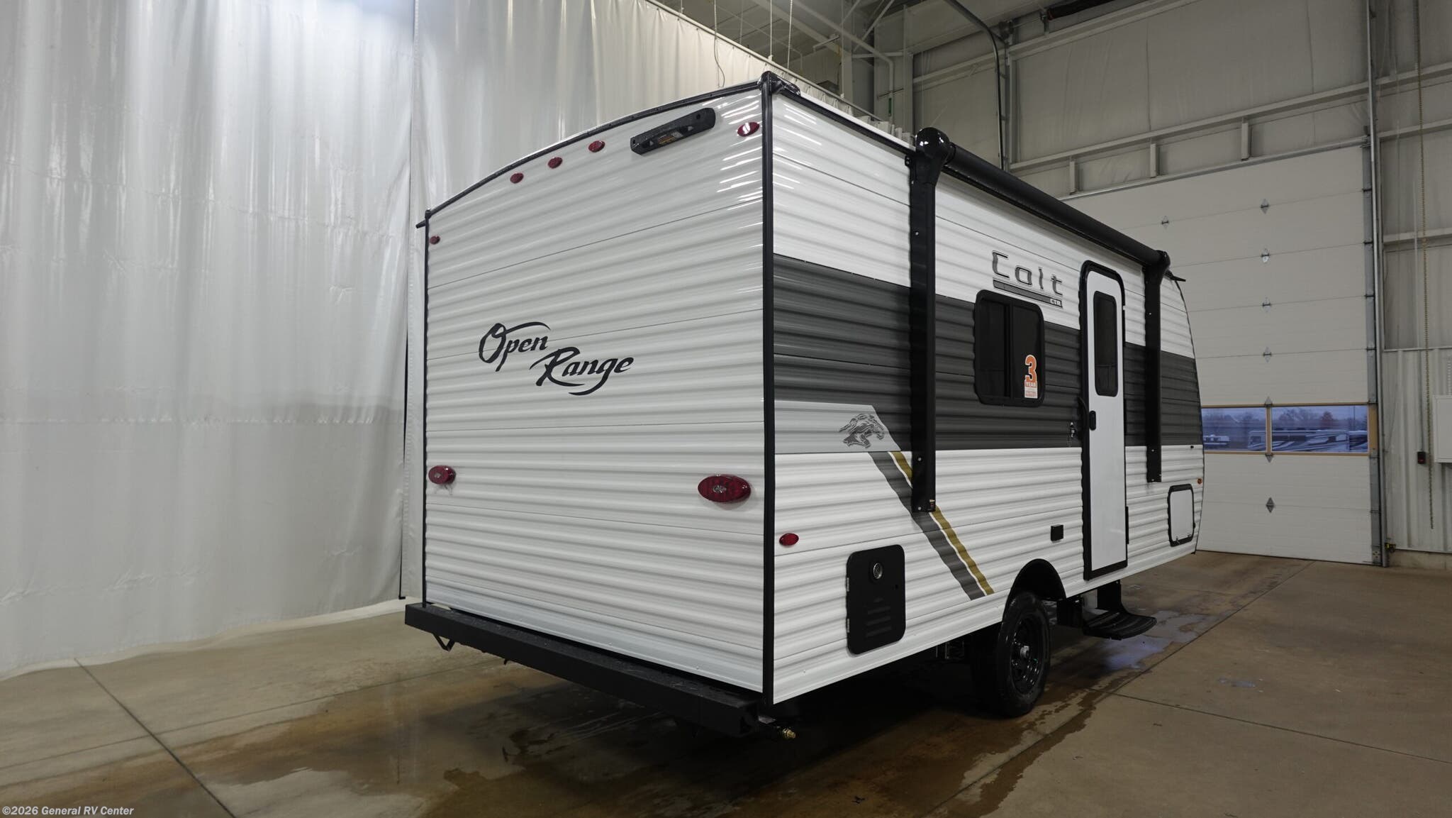 Open Range RV Colt travel trailer 17QB - CTR Edition highlights: Walk-Around Queen Bed Exterior Storage Full Rear Bath Two-Burner Cooktop This travel trailer is just what the doctor ordered! Once you've loaded up the exterior storage, you can head out to the campground of your choice. The 10' power awning can be put out when you arrive, then you can relax in your camp chairs or head inside to make lunch on the two-burner cooktop. There is also a microwave oven for quick meals and a 12V refrigerator for food storage. A booth dinette provides a place to dine together, and you can convert it to sleeping space at night for one to two guests. You'll love the front queen bed that includes an overhead shelf and a wardrobe for your things, and this unit includes a full rear bath for added privacy. Here, you'll find a 24" x 32" shower, a toilet, and a linen closet plus shelves/storage for toiletries and towels! With any Colt travel trailer by Open Range RV, you can be sure you're getting a budget-friendly unit designed to fit your lifestyle! Each one is built to last with a PVC roofing membrane and built-in A-frame, plus there are nitrogen-filled radial tires and self-adjusting electric brakes for easy towing. You will appreciate the utilities that include 30-amp service, an A/C unit, and an on-demand tankless water heater. A few interior comforts include vinyl flooring throughout, solid hardwood cabinet doors, and residential grade kitchen countertops to make your space feel more like home.