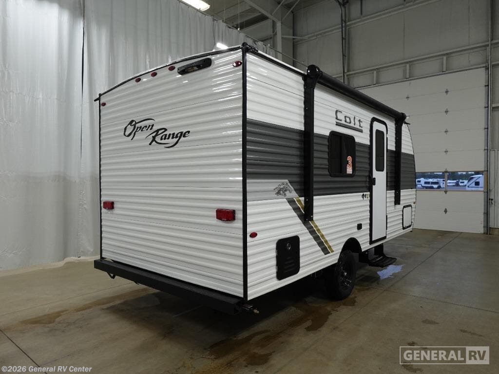 Open Range RV Colt travel trailer 17QB - CTR Edition highlights: Walk-Around Queen Bed Exterior Storage Full Rear Bath Two-Burner Cooktop This travel trailer is just what the doctor ordered! Once you've loaded up the exterior storage, you can head out to the campground of your choice. The 10' power awning can be put out when you arrive, then you can relax in your camp chairs or head inside to make lunch on the two-burner cooktop. There is also a microwave oven for quick meals and a 12V refrigerator for food storage. A booth dinette provides a place to dine together, and you can convert it to sleeping space at night for one to two guests. You'll love the front queen bed that includes an overhead shelf and a wardrobe for your things, and this unit includes a full rear bath for added privacy. Here, you'll find a 24" x 32" shower, a toilet, and a linen closet plus shelves/storage for toiletries and towels! With any Colt travel trailer by Open Range RV, you can be sure you're getting a budget-friendly unit designed to fit your lifestyle! Each one is built to last with a PVC roofing membrane and built-in A-frame, plus there are nitrogen-filled radial tires and self-adjusting electric brakes for easy towing. You will appreciate the utilities that include 30-amp service, an A/C unit, and an on-demand tankless water heater. A few interior comforts include vinyl flooring throughout, solid hardwood cabinet doors, and residential grade kitchen countertops to make your space feel more like home.