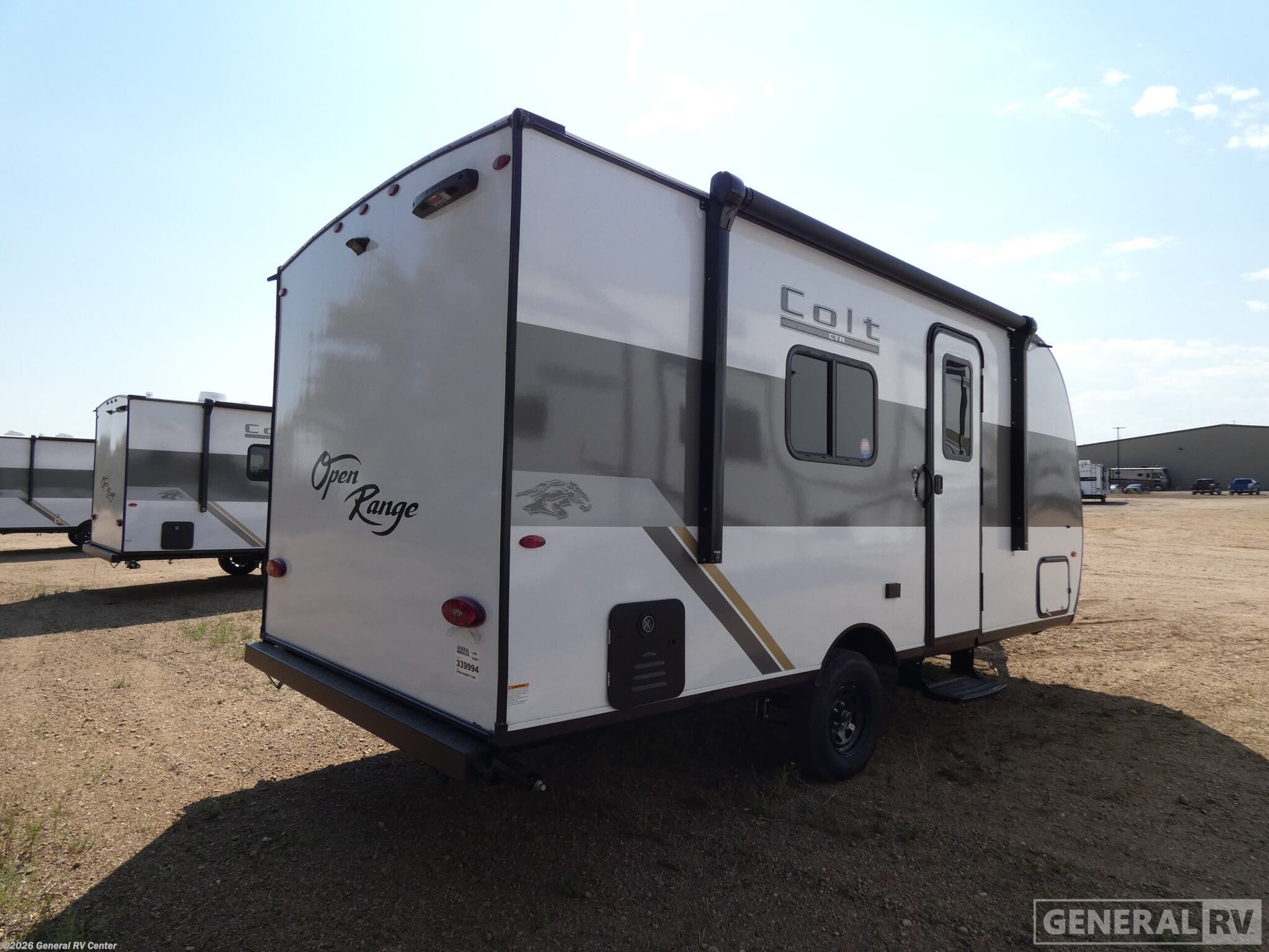 Open Range RV Colt travel trailer 17QB - CTR Edition highlights: Walk-Around Queen Bed Exterior Storage Full Rear Bath Two-Burner Cooktop This travel trailer is just what the doctor ordered! Once you've loaded up the exterior storage, you can head out to the campground of your choice. The 10' power awning can be put out when you arrive, then you can relax in your camp chairs or head inside to make lunch on the two-burner cooktop. There is also a microwave oven for quick meals and a 12V refrigerator for food storage. A booth dinette provides a place to dine together, and you can convert it to sleeping space at night for one to two guests. You'll love the front queen bed that includes an overhead shelf and a wardrobe for your things, and this unit includes a full rear bath for added privacy. Here, you'll find a 24" x 32" shower, a toilet, and a linen closet plus shelves/storage for toiletries and towels! With any Colt travel trailer by Open Range RV, you can be sure you're getting a budget-friendly unit designed to fit your lifestyle! Each one is built to last with a PVC roofing membrane and built-in A-frame, plus there are nitrogen-filled radial tires and self-adjusting electric brakes for easy towing. You will appreciate the utilities that include 30-amp service, an A/C unit, and an on-demand tankless water heater. A few interior comforts include vinyl flooring throughout, solid hardwood cabinet doors, and residential grade kitchen countertops to make your space feel more like home.