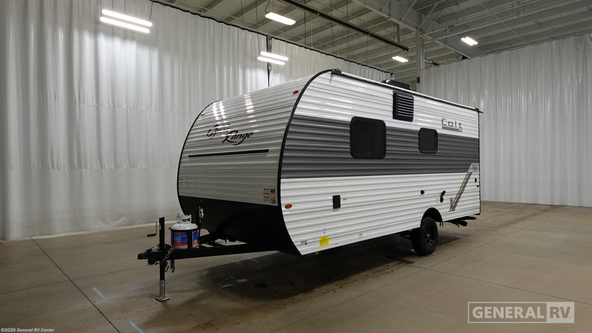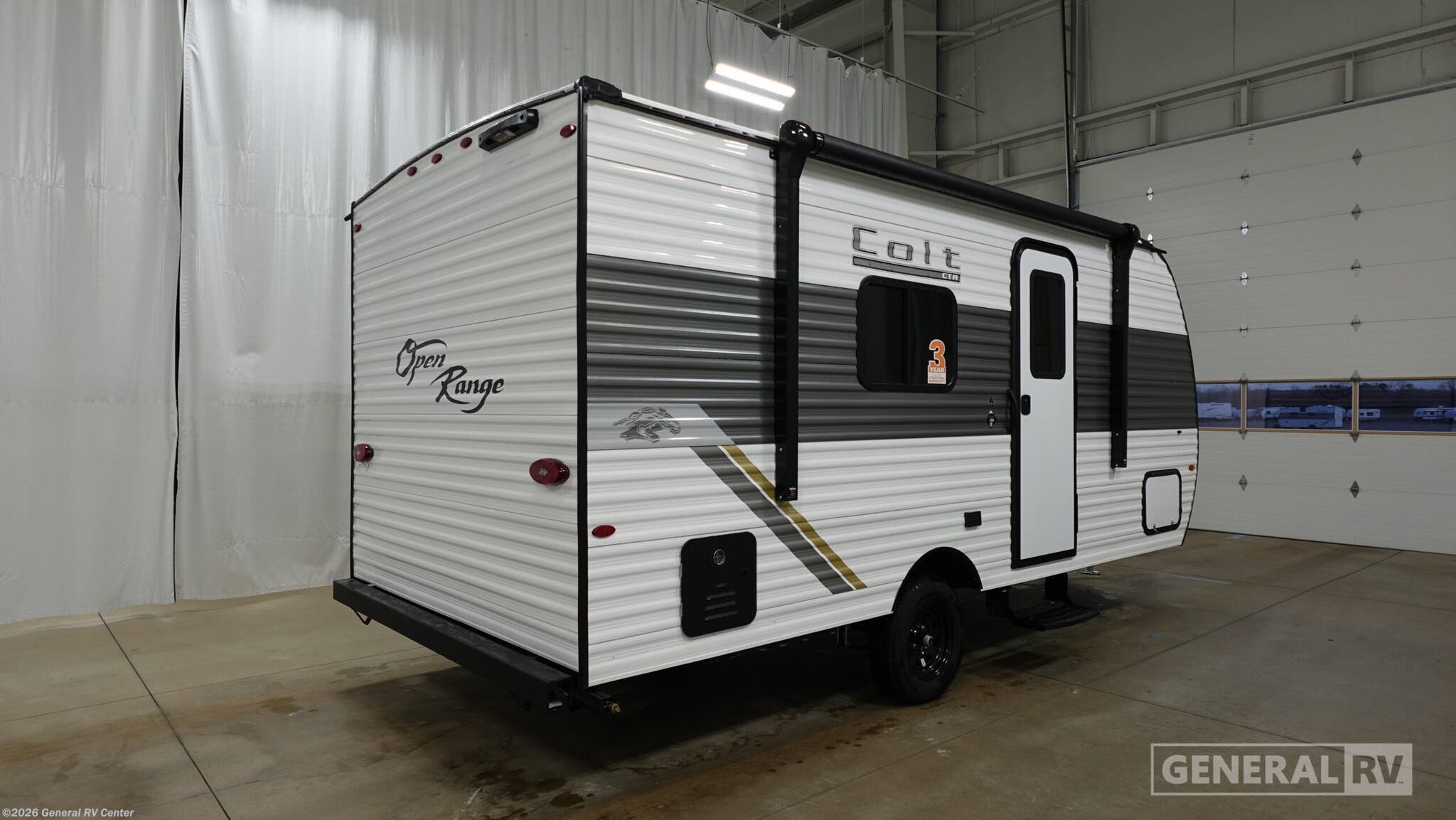 Open Range RV Colt travel trailer 17QB - CTR Edition highlights: Walk-Around Queen Bed Exterior Storage Full Rear Bath Two-Burner Cooktop This travel trailer is just what the doctor ordered! Once you've loaded up the exterior storage, you can head out to the campground of your choice. The 10' power awning can be put out when you arrive, then you can relax in your camp chairs or head inside to make lunch on the two-burner cooktop. There is also a microwave oven for quick meals and a 12V refrigerator for food storage. A booth dinette provides a place to dine together, and you can convert it to sleeping space at night for one to two guests. You'll love the front queen bed that includes an overhead shelf and a wardrobe for your things, and this unit includes a full rear bath for added privacy. Here, you'll find a 24" x 32" shower, a toilet, and a linen closet plus shelves/storage for toiletries and towels! With any Colt travel trailer by Open Range RV, you can be sure you're getting a budget-friendly unit designed to fit your lifestyle! Each one is built to last with a PVC roofing membrane and built-in A-frame, plus there are nitrogen-filled radial tires and self-adjusting electric brakes for easy towing. You will appreciate the utilities that include 30-amp service, an A/C unit, and an on-demand tankless water heater. A few interior comforts include vinyl flooring throughout, solid hardwood cabinet doors, and residential grade kitchen countertops to make your space feel more like home.