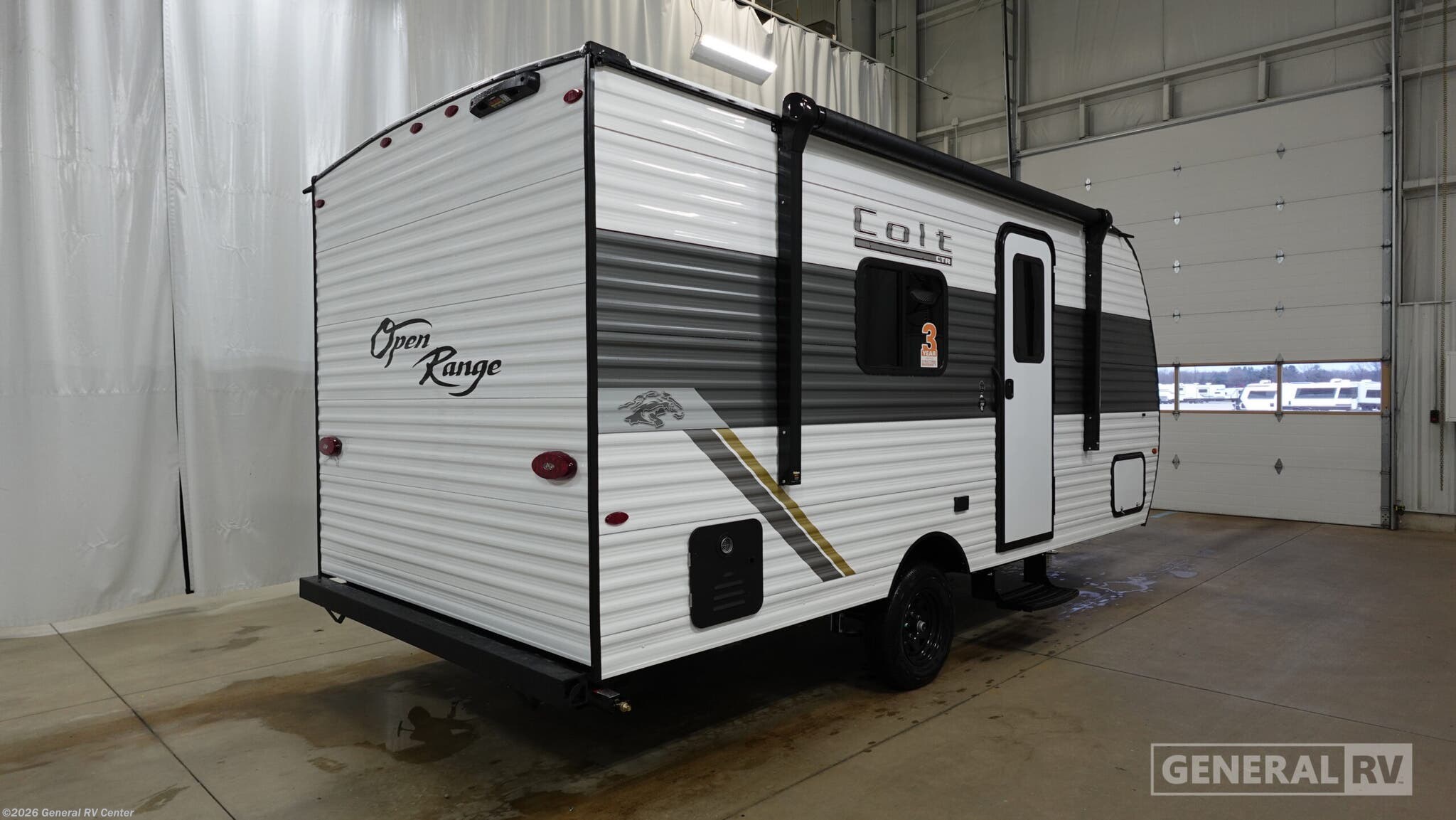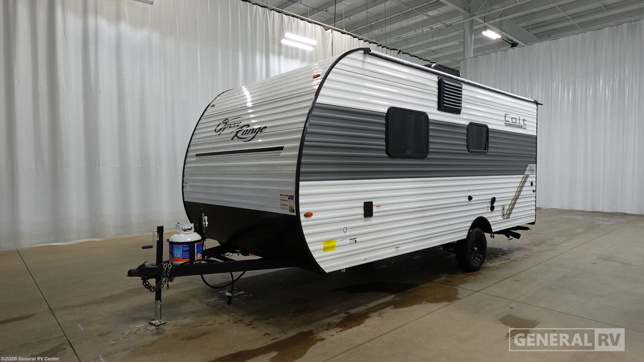 Open Range RV Colt travel trailer 17QB - CTR Edition highlights: Walk-Around Queen Bed Exterior Storage Full Rear Bath Two-Burner Cooktop This travel trailer is just what the doctor ordered! Once you've loaded up the exterior storage, you can head out to the campground of your choice. The 10' power awning can be put out when you arrive, then you can relax in your camp chairs or head inside to make lunch on the two-burner cooktop. There is also a microwave oven for quick meals and a 12V refrigerator for food storage. A booth dinette provides a place to dine together, and you can convert it to sleeping space at night for one to two guests. You'll love the front queen bed that includes an overhead shelf and a wardrobe for your things, and this unit includes a full rear bath for added privacy. Here, you'll find a 24" x 32" shower, a toilet, and a linen closet plus shelves/storage for toiletries and towels! With any Colt travel trailer by Open Range RV, you can be sure you're getting a budget-friendly unit designed to fit your lifestyle! Each one is built to last with a PVC roofing membrane and built-in A-frame, plus there are nitrogen-filled radial tires and self-adjusting electric brakes for easy towing. You will appreciate the utilities that include 30-amp service, an A/C unit, and an on-demand tankless water heater. A few interior comforts include vinyl flooring throughout, solid hardwood cabinet doors, and residential grade kitchen countertops to make your space feel more like home.