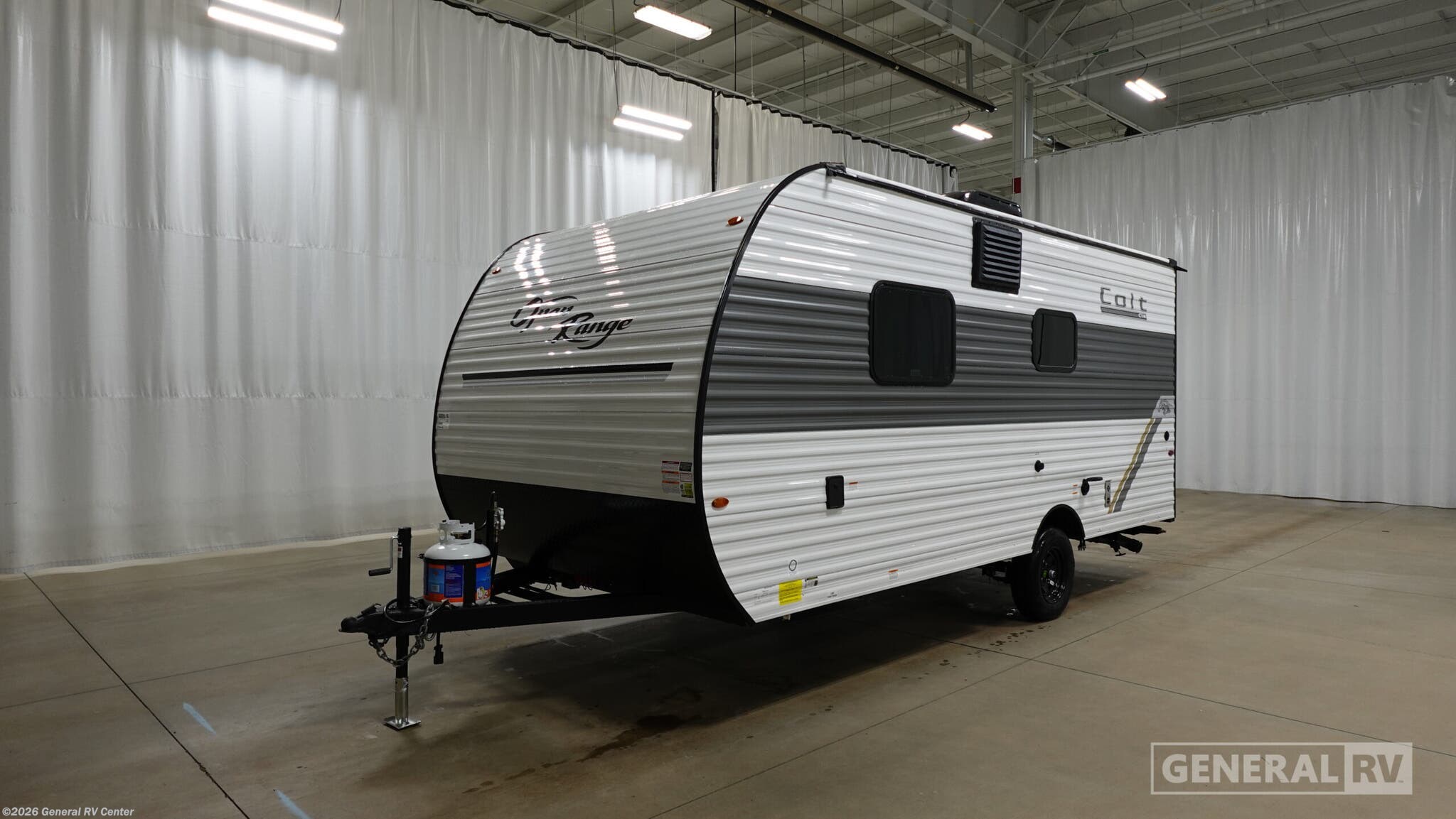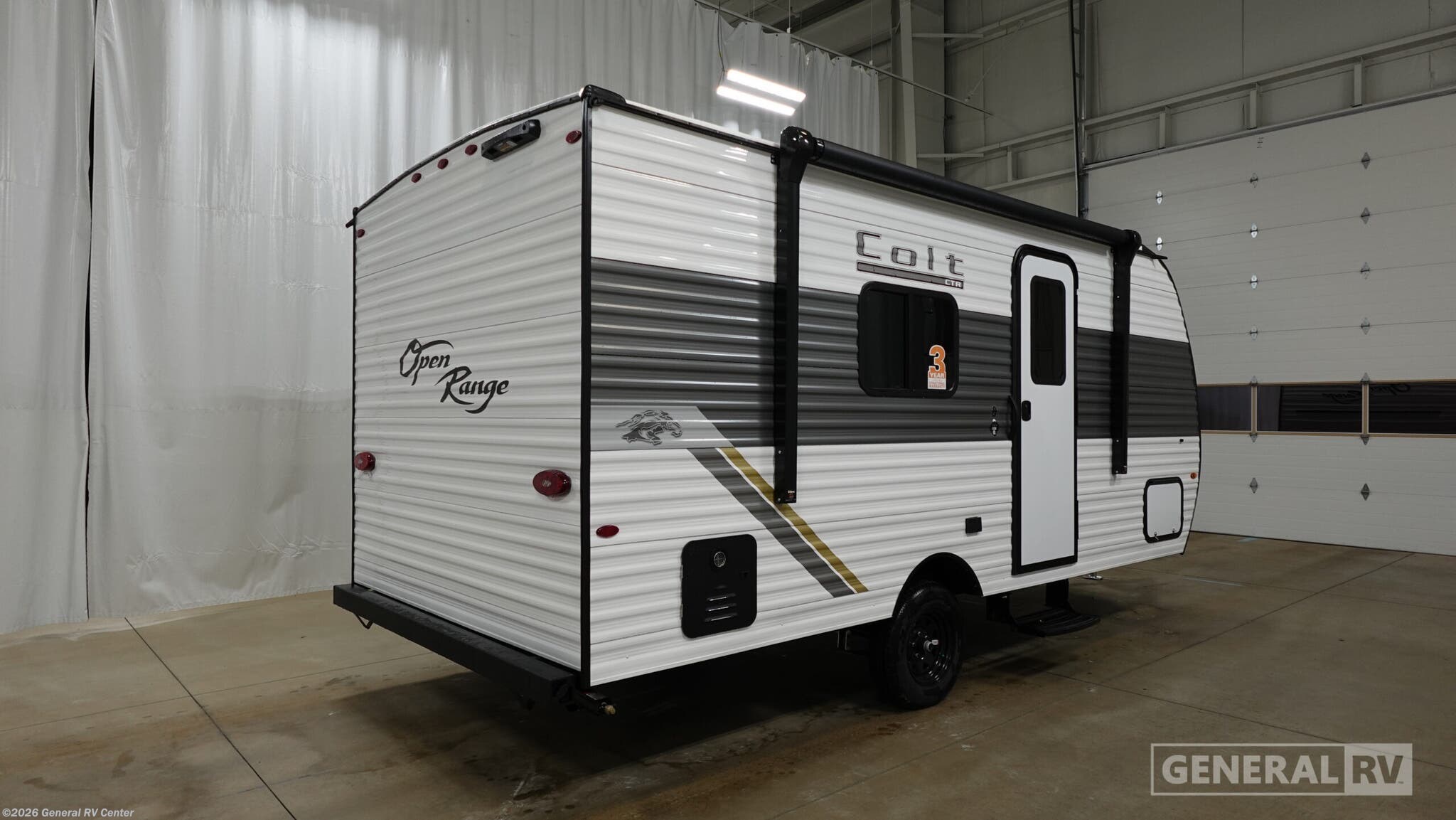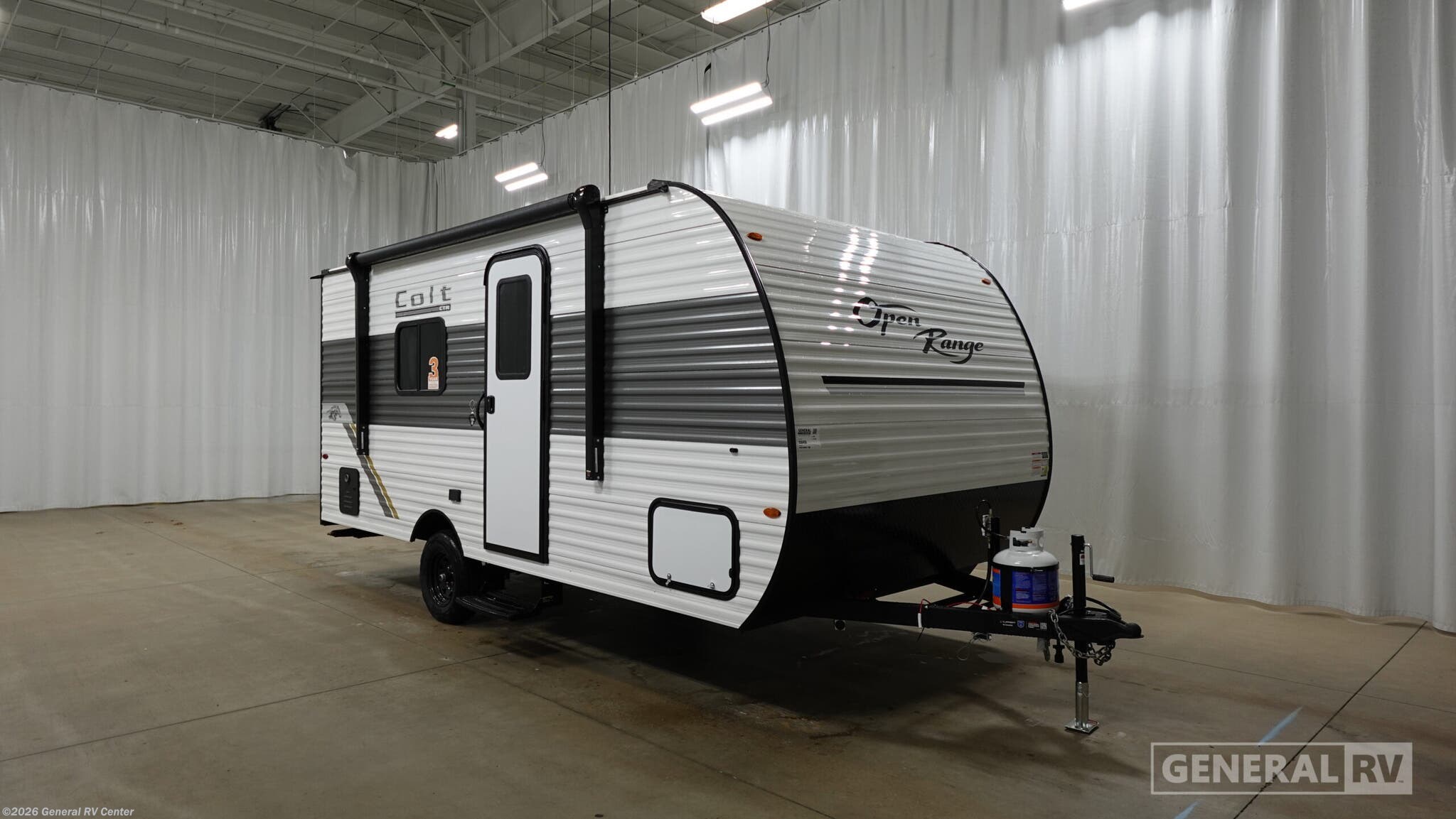 Open Range RV Colt travel trailer 17QB - CTR Edition highlights: Walk-Around Queen Bed Exterior Storage Full Rear Bath Two-Burner Cooktop This travel trailer is just what the doctor ordered! Once you've loaded up the exterior storage, you can head out to the campground of your choice. The 10' power awning can be put out when you arrive, then you can relax in your camp chairs or head inside to make lunch on the two-burner cooktop. There is also a microwave oven for quick meals and a 12V refrigerator for food storage. A booth dinette provides a place to dine together, and you can convert it to sleeping space at night for one to two guests. You'll love the front queen bed that includes an overhead shelf and a wardrobe for your things, and this unit includes a full rear bath for added privacy. Here, you'll find a 24" x 32" shower, a toilet, and a linen closet plus shelves/storage for toiletries and towels! With any Colt travel trailer by Open Range RV, you can be sure you're getting a budget-friendly unit designed to fit your lifestyle! Each one is built to last with a PVC roofing membrane and built-in A-frame, plus there are nitrogen-filled radial tires and self-adjusting electric brakes for easy towing. You will appreciate the utilities that include 30-amp service, an A/C unit, and an on-demand tankless water heater. A few interior comforts include vinyl flooring throughout, solid hardwood cabinet doors, and residential grade kitchen countertops to make your space feel more like home.