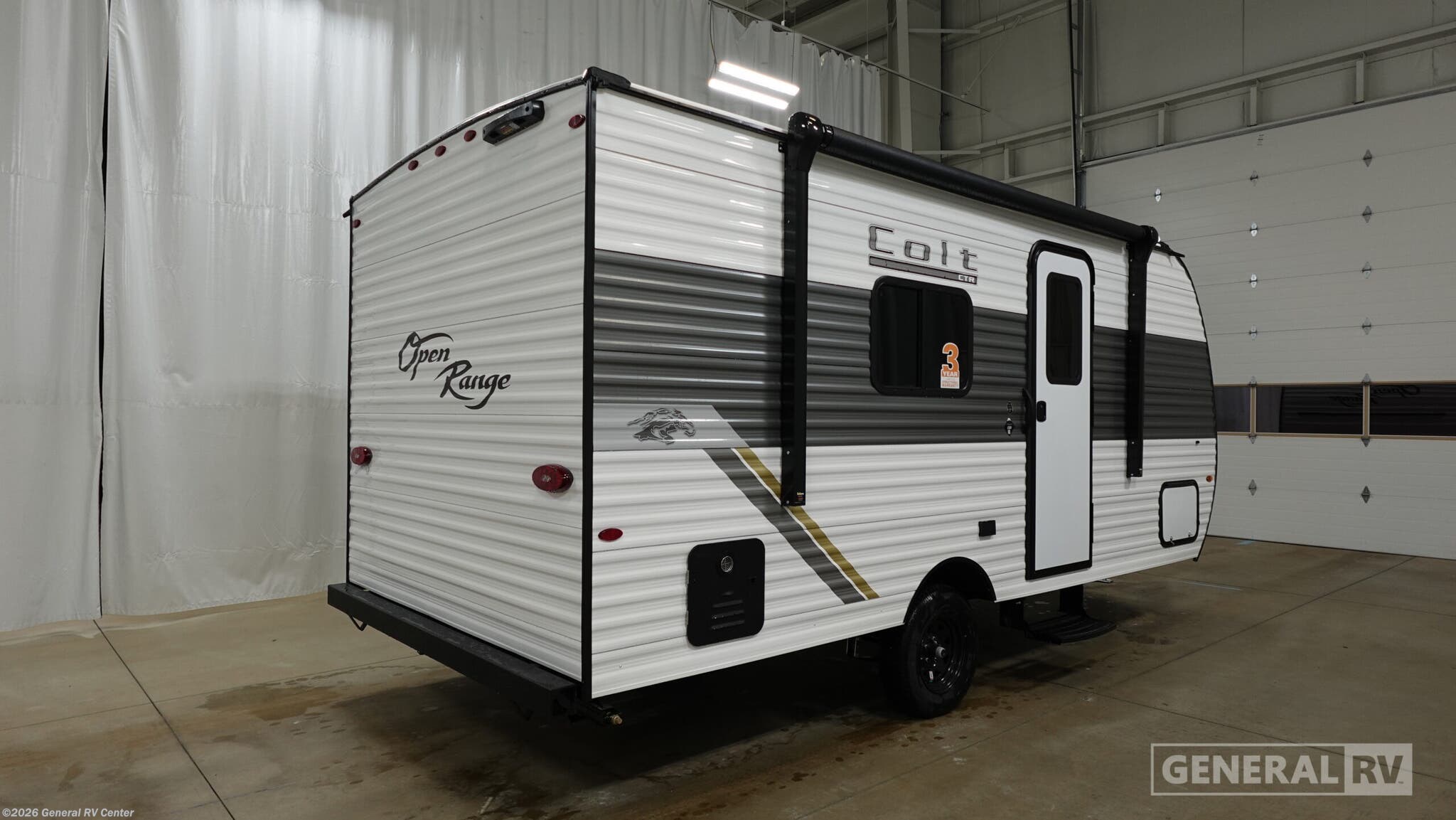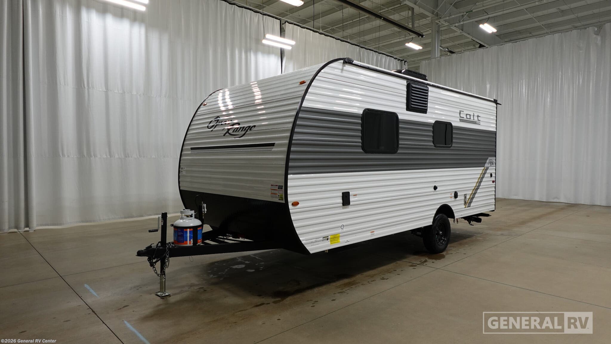 Open Range RV Colt travel trailer 17QB - CTR Edition highlights: Walk-Around Queen Bed Exterior Storage Full Rear Bath Two-Burner Cooktop This travel trailer is just what the doctor ordered! Once you've loaded up the exterior storage, you can head out to the campground of your choice. The 10' power awning can be put out when you arrive, then you can relax in your camp chairs or head inside to make lunch on the two-burner cooktop. There is also a microwave oven for quick meals and a 12V refrigerator for food storage. A booth dinette provides a place to dine together, and you can convert it to sleeping space at night for one to two guests. You'll love the front queen bed that includes an overhead shelf and a wardrobe for your things, and this unit includes a full rear bath for added privacy. Here, you'll find a 24" x 32" shower, a toilet, and a linen closet plus shelves/storage for toiletries and towels! With any Colt travel trailer by Open Range RV, you can be sure you're getting a budget-friendly unit designed to fit your lifestyle! Each one is built to last with a PVC roofing membrane and built-in A-frame, plus there are nitrogen-filled radial tires and self-adjusting electric brakes for easy towing. You will appreciate the utilities that include 30-amp service, an A/C unit, and an on-demand tankless water heater. A few interior comforts include vinyl flooring throughout, solid hardwood cabinet doors, and residential grade kitchen countertops to make your space feel more like home.