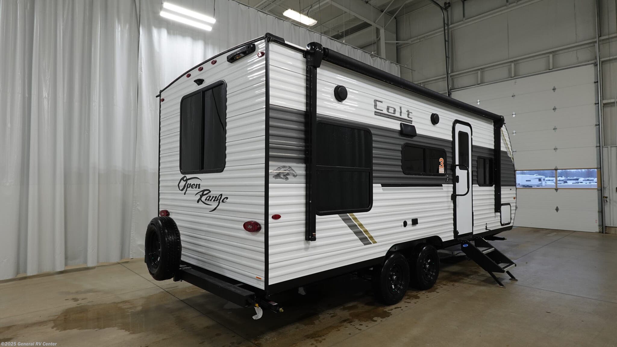 **Open Range RV Colt travel trailer 21QB highlights:** * Front RV Queen Bed * Exterior Storage * Middle Full Bath * 12V Refrigerator Make each camping trip count in this travel trailer that can sleep four to five each night. You'll wake up feeling refreshed on the front RV queen bed, and there are dual bedside wardrobes to keep your things organized. A middle bath includes a 40" tub/shower, which will make bath time easier if you have little ones. Once breakfast is made on the three-burner cooktop, you can dine at the booth dinette or take your plate outdoors to sit under the 16' power awning with LED lights. This unit also includes a jack-knife sofa, which can be used for sleeping space, along with the dinette! With any Colt travel trailer by Open Range RV, you can be sure you're getting a budget-friendly unit designed to fit your lifestyle! Each one is built to last with a PVC roofing membrane and built-in A-frame, plus there are nitrogen-filled radial tires and self-adjusting electric brakes for easy towing. You will appreciate the utilities that include 30-amp service, an A/C unit, and an on-demand tankless water heater. A few interior comforts include vinyl flooring throughout, solid hardwood cabinet doors, and residential grade kitchen countertops to make your space feel more like home.