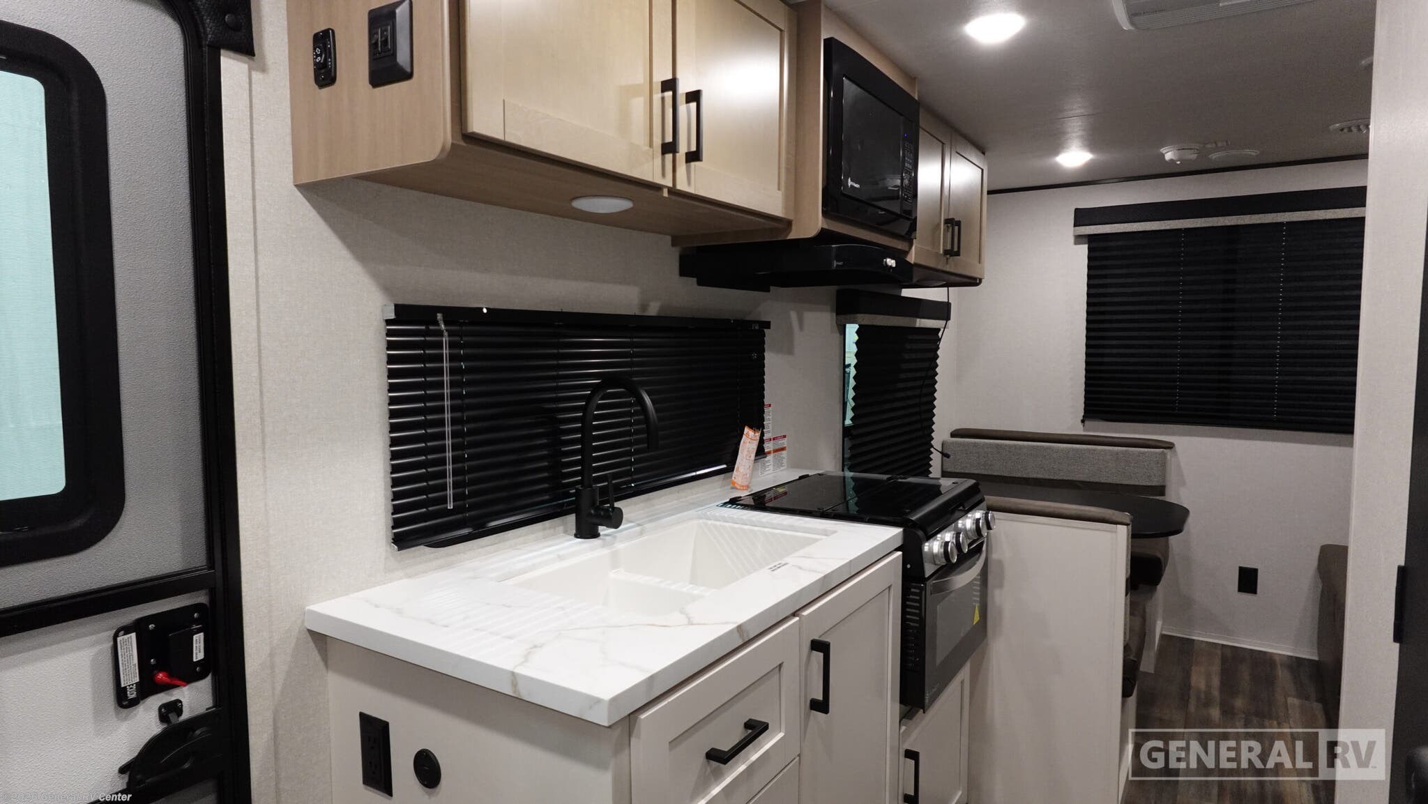 Open Range RV Colt travel trailer 21QB highlights: Front RV Queen Bed Exterior Storage Middle Full Bath 12V Refrigerator Make each camping trip count in this travel trailer that can sleep four to five each night. You'll wake up feeling refreshed on the front RV queen bed, and there are dual bedside wardrobes to keep your things organized. A middle bath includes a 40" tub/shower, which will make bath time easier if you have little ones. Once breakfast is made on the three-burner cooktop, you can dine at the booth dinette or take your plate outdoors to sit under the 16' power awning with LED lights. This unit also includes a jack-knife sofa, which can be used for sleeping space, along with the dinette! With any Colt travel trailer by Open Range RV, you can be sure you're getting a budget-friendly unit designed to fit your lifestyle! Each one is built to last with a PVC roofing membrane and built-in A-frame, plus there are nitrogen-filled radial tires and self-adjusting electric brakes for easy towing. You will appreciate the utilities that include 30-amp service, an A/C unit, and an on-demand tankless water heater. A few interior comforts include vinyl flooring throughout, solid hardwood cabinet doors, and residential grade kitchen countertops to make your space feel more like home.