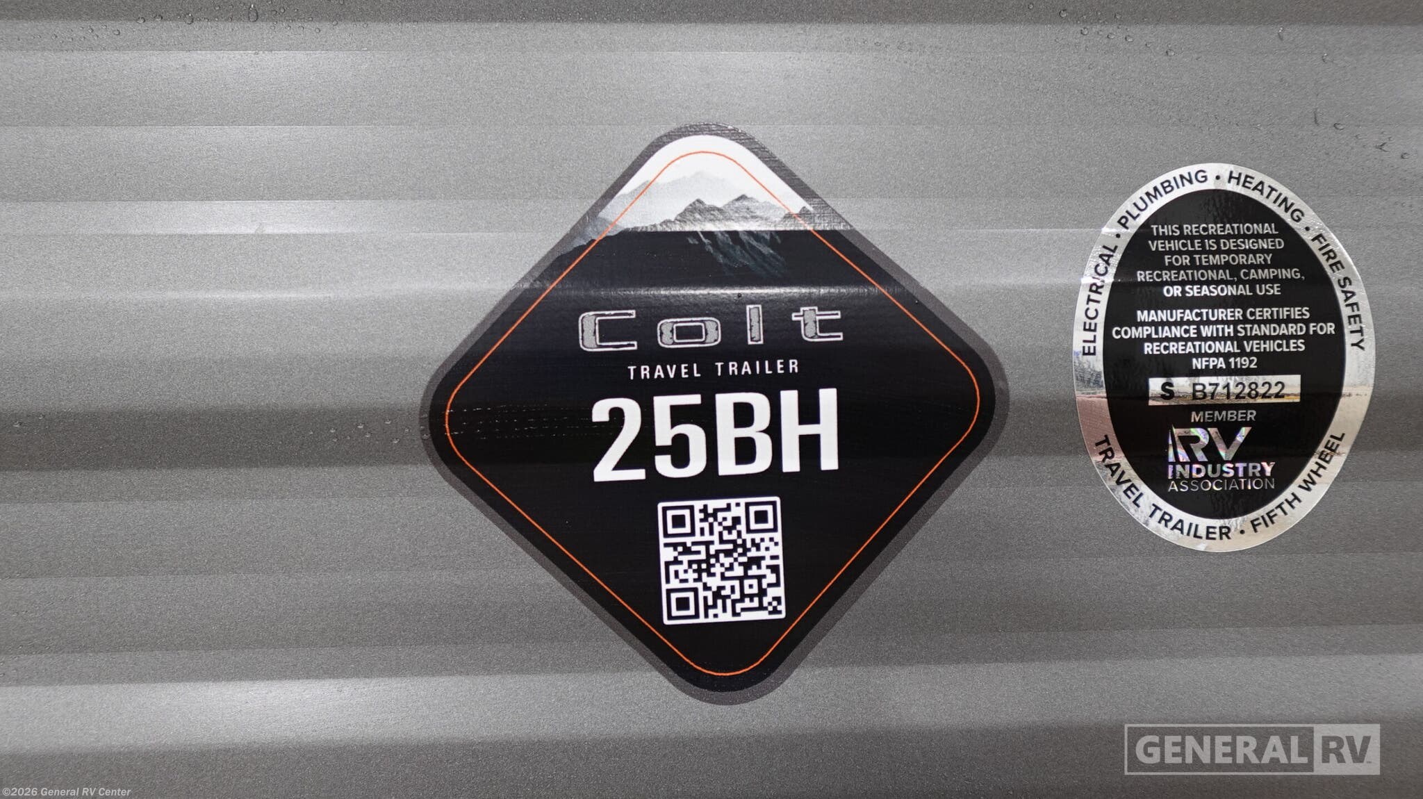 Open Range RV Colt travel trailer 25BH - CTR Edition highlights: Front Queen Bed Jack-Knife Sofa Private Bath 12' Power Awning If you enjoy camping with a larger group, this travel trailer is perfect for you! There are double-size bunks in the back, which are right next to the private bath with a toilet and 40" shower. You can take the front queen bed with dual wardrobes, and any other guests can convert the sofa and booth dinette to sleeping space. A two-burner cooktop will let you make breakfast for everyone in the morning, and a 12V refrigerator will keep your perishables fresh! With any Colt travel trailer by Open Range RV, you can be sure you're getting a budget-friendly unit designed to fit your lifestyle! Each one is built to last with a PVC roofing membrane and built-in A-frame, plus there are nitrogen-filled radial tires and self-adjusting electric brakes for easy towing. You will appreciate the utilities that include 30-amp service, an A/C unit, and an on-demand tankless water heater. A few interior comforts include vinyl flooring throughout, solid hardwood cabinet doors, and residential grade kitchen countertops to make your space feel more like home.