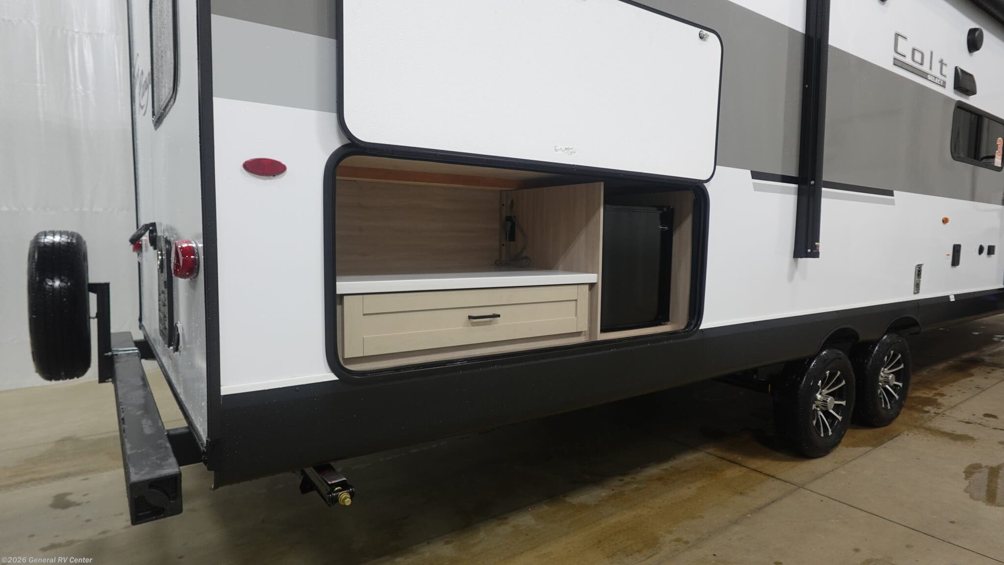 Open Range RV Colt travel trailer 28DBS highlights: Front Private Bedroom Outdoor Camp Kitchen Large Slide Out U-Shaped Dinette This travel trailer with double-size bunks is spacious and cozy! Once you've unloaded the exterior storage, your crew can put out the 18' power awning with LED lights, then relax in your camp chairs. There is also an outdoor camp kitchen here with an outside refrigerator and storage for snacks. When you're ready to make lunch, there is a three-burner cooktop and microwave oven inside, plus comfortable seating on the jack-knife sofa and U-shaped dinette. And an entertainment center with a fireplace will make this space feel more like home! You're sure to appreciate the front private bedroom with an RV queen bed, dual wardrobes, and overhead storage for books. With any Colt travel trailer by Open Range RV, you can be sure you're getting a budget-friendly unit designed to fit your lifestyle! Each one is built to last with a PVC roofing membrane and built-in A-frame, plus there are nitrogen-filled radial tires and self-adjusting electric brakes for easy towing. You will appreciate the utilities that include 30-amp service, an A/C unit, and an on-demand tankless water heater. A few interior comforts include vinyl flooring throughout, solid hardwood cabinet doors, and residential grade kitchen countertops to make your space feel more like home.