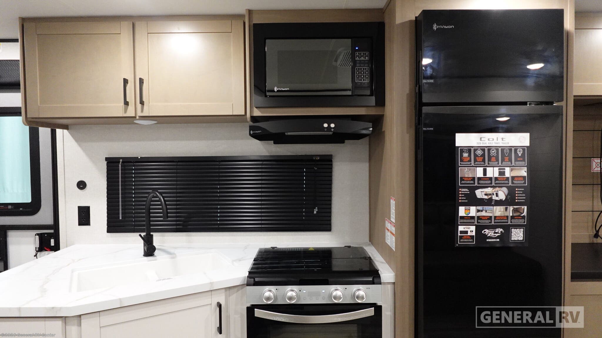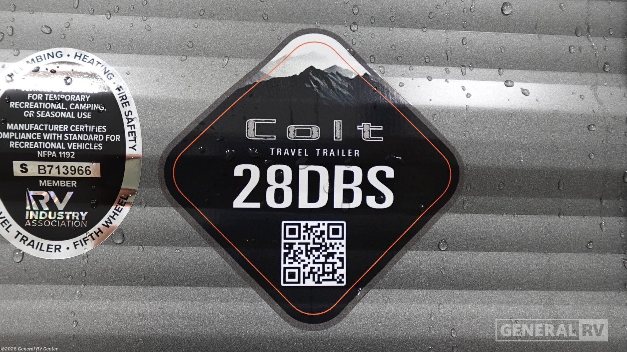 **Open Range RV Colt travel trailer 28DBS highlights:** - Front Private Bedroom - Outdoor Camp Kitchen - Large Slide Out - U-Shaped Dinette This travel trailer with double-size bunks is spacious and cozy! Once you've unloaded the exterior storage, your crew can put out the 18' power awning with LED lights, then relax in your camp chairs. There is also an outdoor camp kitchen here with an outside refrigerator and storage for snacks. When you're ready to make lunch, there is a three-burner cooktop and microwave oven inside, plus comfortable seating on the jack-knife sofa and U-shaped dinette. And an entertainment center with a fireplace will make this space feel more like home! You're sure to appreciate the front private bedroom with an RV queen bed, dual wardrobes, and overhead storage for books. With any Colt travel trailer by Open Range RV, you can be sure you're getting a budget-friendly unit designed to fit your lifestyle! Each one is built to last with a PVC roofing membrane and built-in A-frame, plus there are nitrogen-filled radial tires and self-adjusting electric brakes for easy towing. You will appreciate the utilities that include 30-amp service, an A/C unit, and an on-demand tankless water heater. A few interior comforts include vinyl flooring throughout, solid hardwood cabinet doors, and residential grade kitchen countertops to make your space feel more like home.