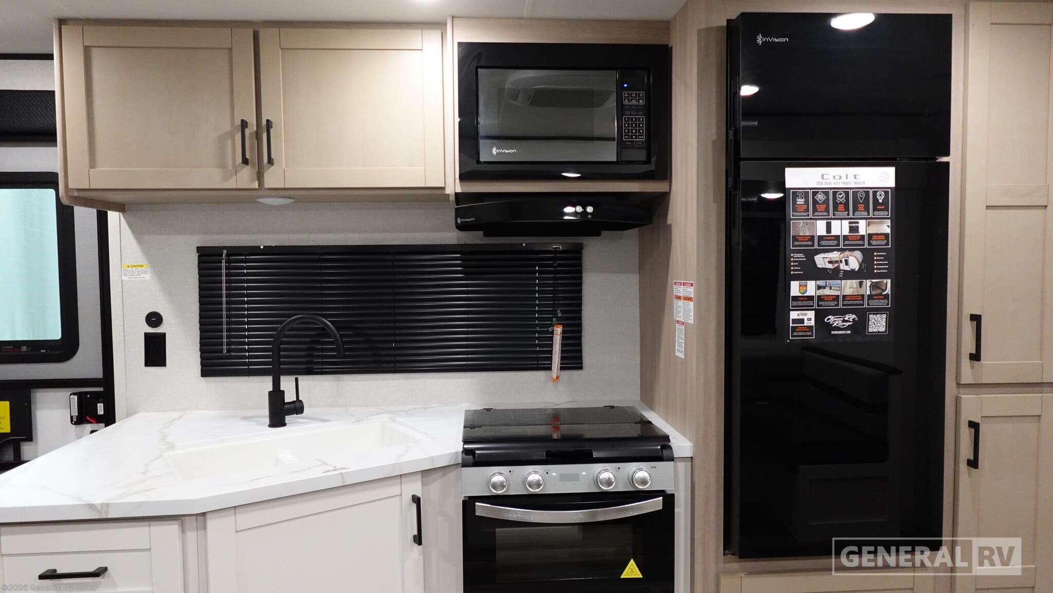 Open Range RV Colt travel trailer 32DSB highlights: Outside Kitchen Rear Private Bunkhouse U-Shaped Dinette RV Queen Bed The perfect family-friendly travel trailer is found with this Colt! You will appreciate dual entry doors, with one leading into the full bath for convenience. The rear private bunkhouse features a slide out for more space, along with a bunk bed above a futon sofa plus a set of bunks across the room. The second slide out is found in the combined kitchen and living room, which houses the U-shaped dinette and jack-knife sofa. When your crew is getting hungry, the chef of your group will have their choice to cook indoors on the three-burner cooktop or at the outside kitchen. And each night you can retreat to the front private bedroom for a great night's rest on the RV queen bed! With any Colt travel trailer by Open Range RV, you can be sure you're getting a budget-friendly unit designed to fit your lifestyle! Each one is built to last with a PVC roofing membrane and built-in A-frame, plus there are nitrogen-filled radial tires and self-adjusting electric brakes for easy towing. You will appreciate the utilities that include 30-amp service, an A/C unit, and an on-demand tankless water heater. A few interior comforts include vinyl flooring throughout, solid hardwood cabinet doors, and residential grade kitchen countertops to make your space feel more like home. There are additional features available, depending on the edition you choose!