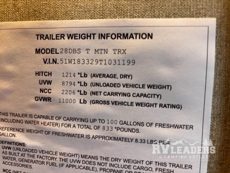 Outdoors RV Back Country Series MTN TRX Titanium Series travel trailer 28DBS highlights: