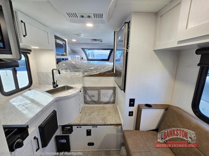 You will have everything you need for a comfortable trip in this hard side truck camper! There is a front queen bed to lay your head on at night with storage next to it and an entertainment center if you choose to add the optional TV. Above the two burner cooktop and sink are overhead cabinets to store your cooking essentials. The 60" x 22" jackknife sofa is not only a comfortable place to enjoy your meals, but also for transforming into an extra sleeping space, plus it has overhead cabinets to store your games. You even have a wet bath to freshen up in each morning!