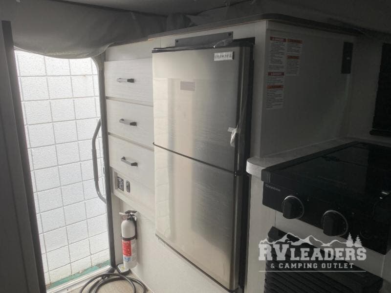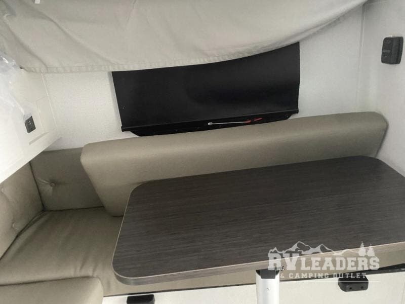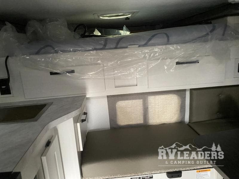 Make the most of all your adventures with this soft side truck camper! Start each morning feeling recharged after sleeping on the front queen bed with foot lockers and bedroom storage on either side of it, and freshen up in the wet bath with storage to keep your towel nearby. There is storage across from the bathroom for your canned goods, a refrigerator to keep your perishables fresh, and a two burner cooktop to prepare your best meals. Enjoy your meals at the seating area with a table then grab a board game from the storage area under the seating!