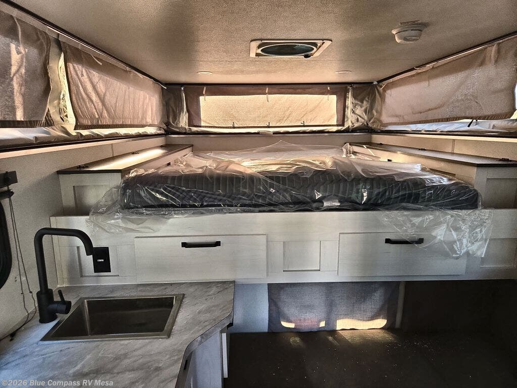 Make the most of all your adventures with this soft side truck camper! Start each morning feeling recharged after sleeping on the front queen bed with foot lockers and bedroom storage on either side of it, and freshen up in the wet bath with storage to keep your towel nearby. There is storage across from the bathroom for your canned goods, a refrigerator to keep your perishables fresh, and a two burner cooktop to prepare your best meals. Enjoy your meals at the seating area with a table then grab a board game from the storage area under the seating!
