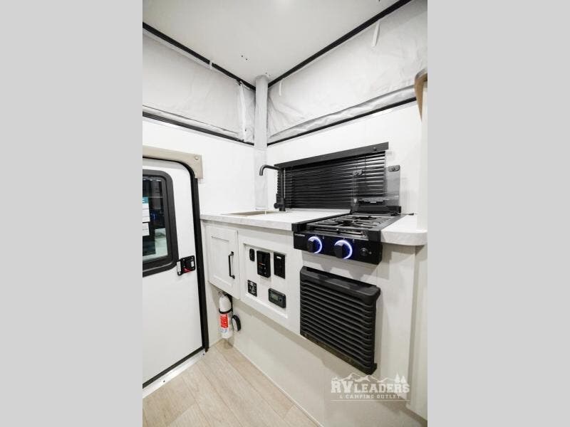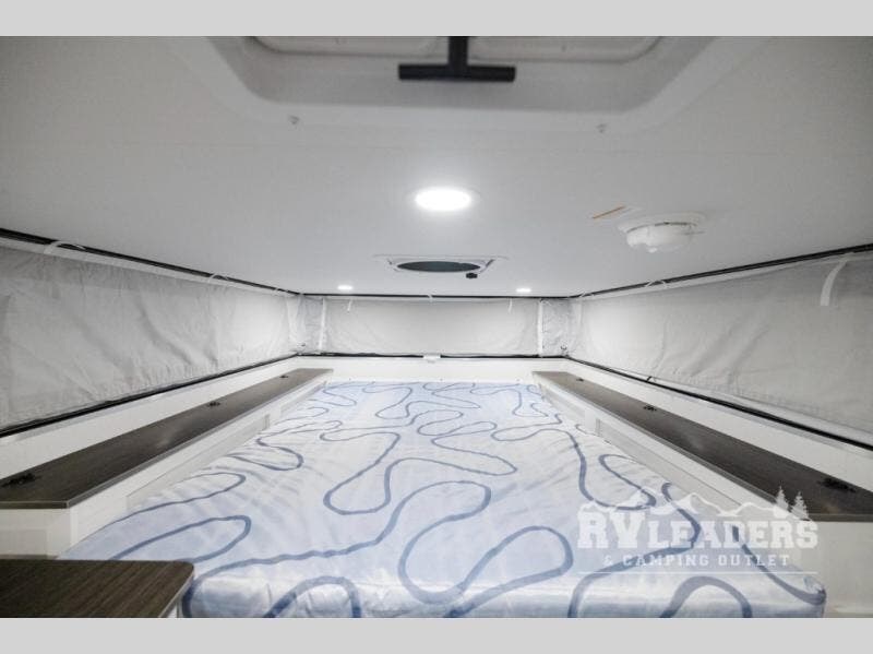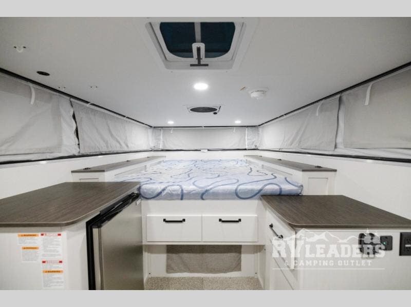 This soft side truck camper was built for 1/2 ton trucks with a 5' 6" to an 8' bed. Wake up feeling recharged after sleeping on the front queen bed with foot lockers and bedroom storage on either side of it. There is even a wardrobe for added storage. You can prepare your best meals with the two burner cooktop, and the refrigerator can hold perishables. Your meals can be enjoyed at the U-shaped seating area with a table and you can transform it into an extra sleeping space for a friend to join the fun!