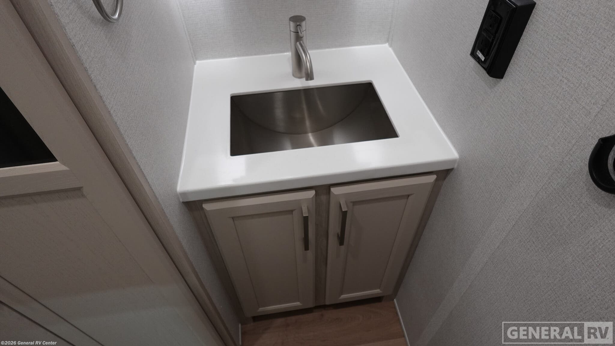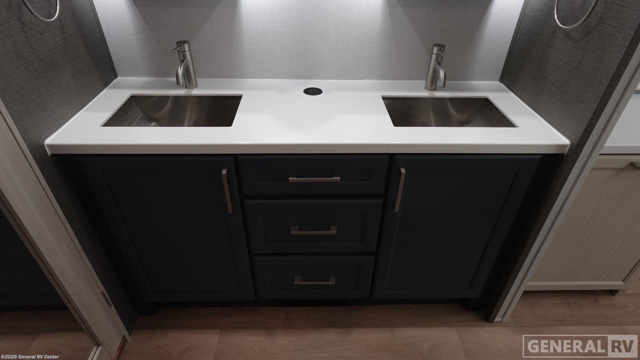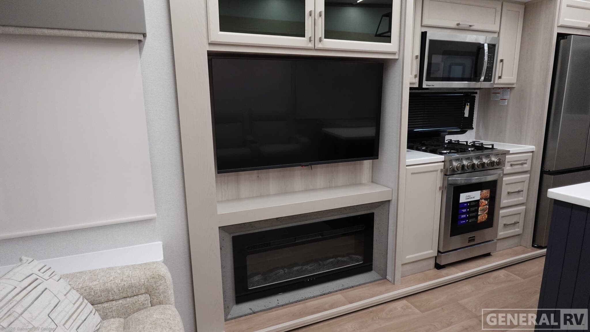 Palomino Columbus fifth wheel 383RLH highlights: Dual Sink Vanity Kitchen Island Bath and a Half King Bed Slide Two Power Awnings Everyone will stay clean with a bath and a half in this fifth wheel! The kitchen has a pantry big enough for everyone's favorite snacks, a four burner gas cooktop, and a kitchen island to prepare your best meals. You can have game night indoors at the table and chairs or set up a table and chairs underneath the two power awnings. The rear living area offers a comfortable place to watch the big game too with an sofa/sleeper and theater seating directly across from the entertainment center with a 50" Smart TV and fireplace. Two can get ready at once in the front bathroom featuring a vanity with dual sinks. Experience a different camping life with residential furnishings and high end features in each one of these Palomino Columbus fifth wheels! The 101" wide body lets you walk around more throughout and the all-welded aluminum-frame superstructure has a snap-in ceiling molding to hold up through every adventure. Don't leave any of your gear behind either when you can easily store it in the climate controlled drop frame storage area. On the exterior, you'll find a heated utility convenience center, an outside sprayer to keep the dirt outside where it belongs, and magnetic compartment door holds to keep them from falling on you as you grab your items. Plus, there are some modern features that will really seal the deal like the Wi-Fi Booster with 4G LTE capability prep, upgraded true solid-surface countertops, power theater seating with USB charging, and a 260W solar panel for off-grid camping!