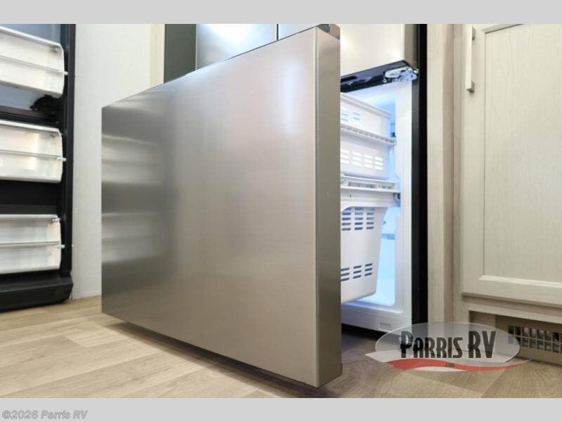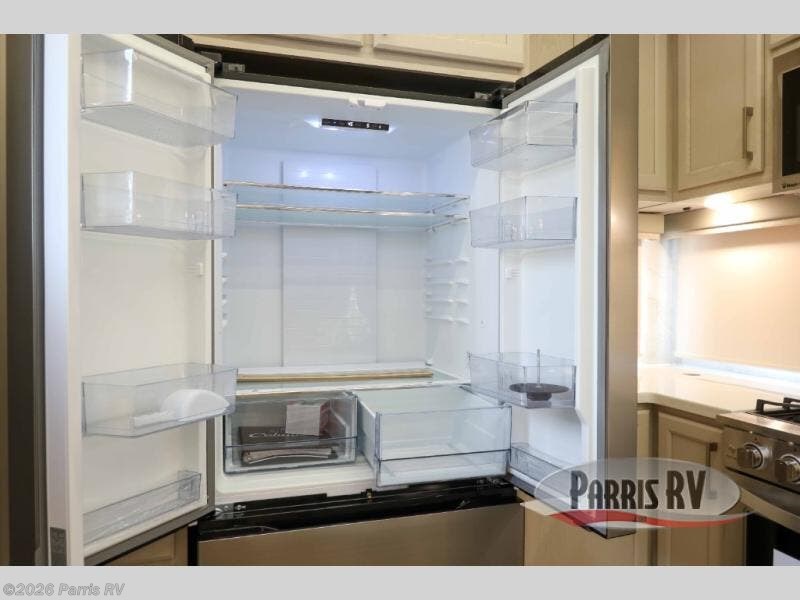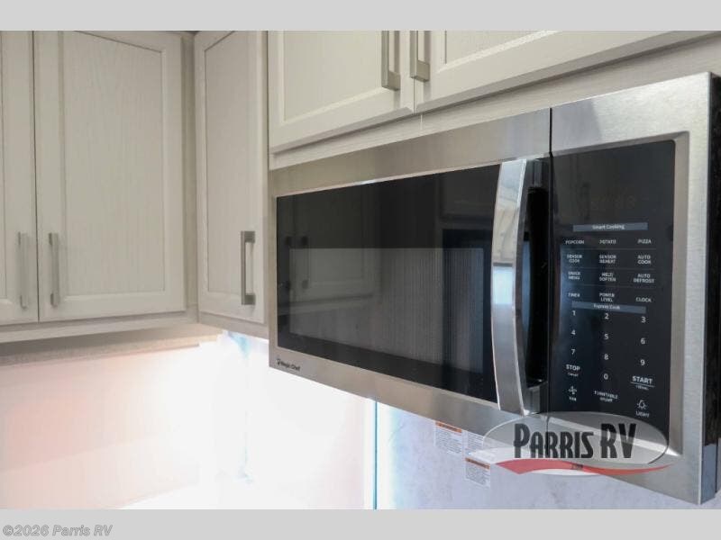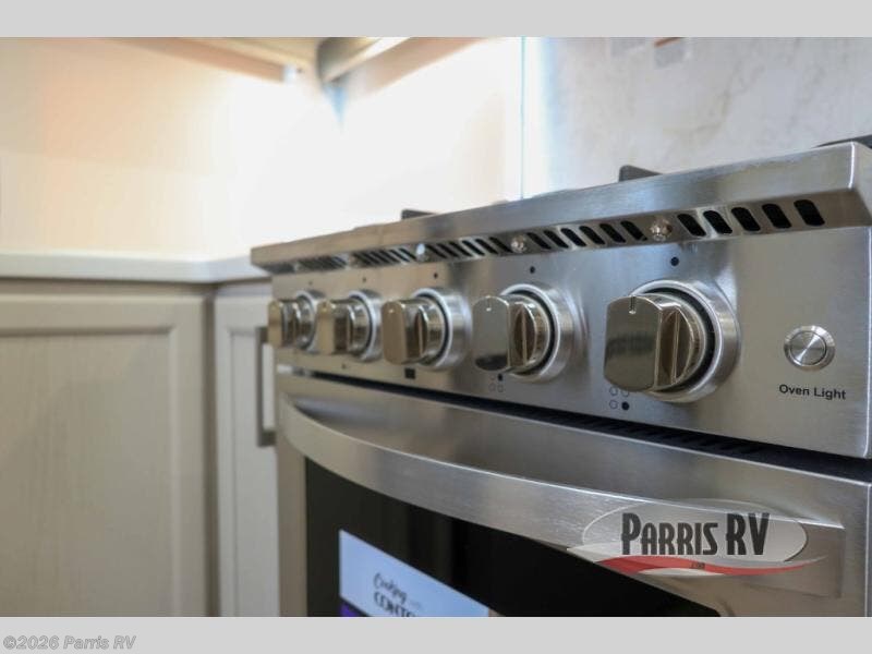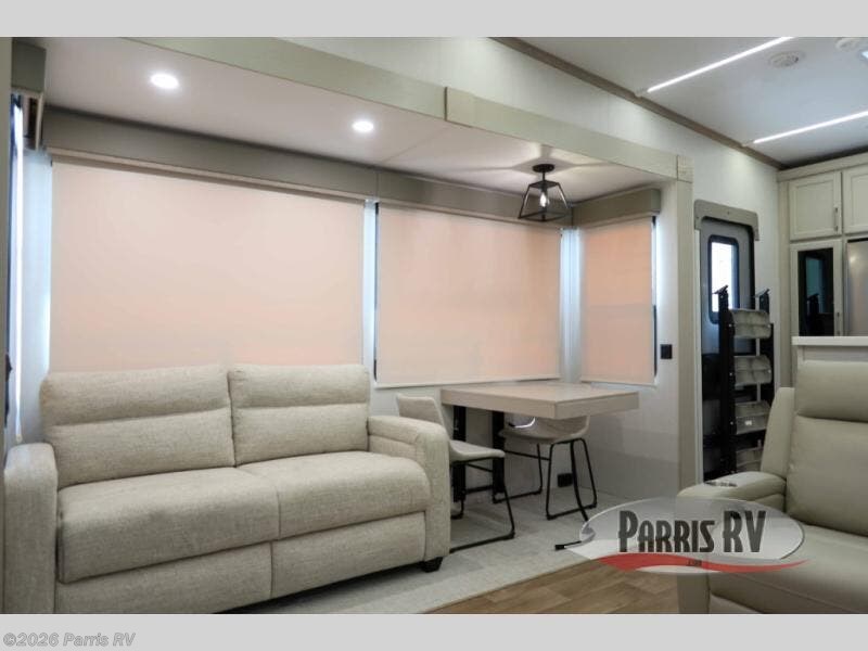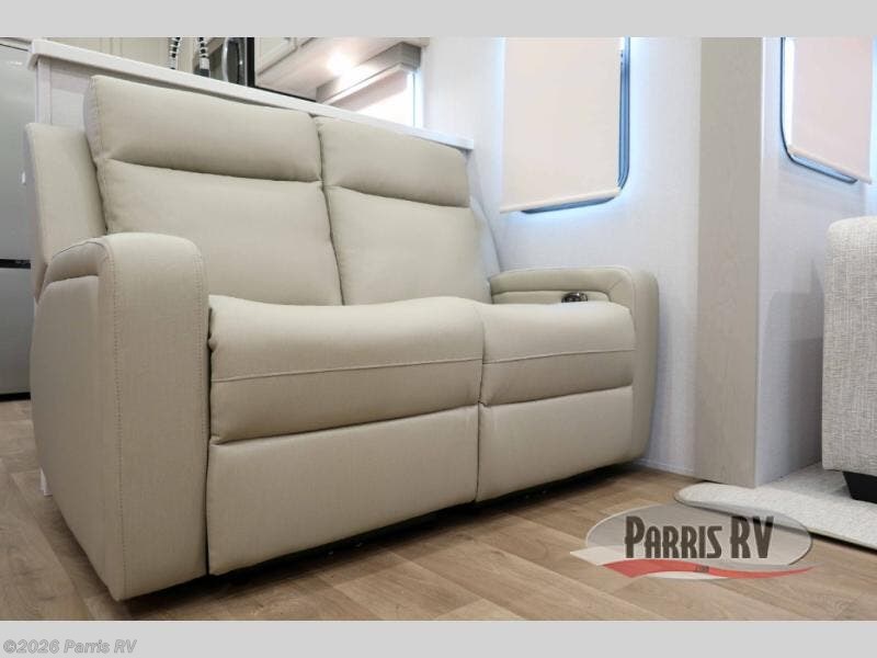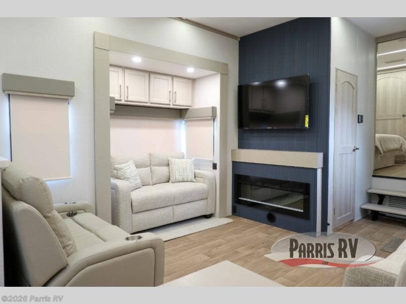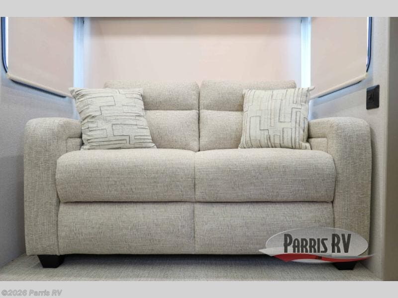 You won't believe all that this fifth wheel has to offer! Starting with the rear kitchen which has plenty of countertop space to prepare your delicious meals, a four burner cooktop with a stainless steel 24" oven to cook them, and a large single bowl stainless steel sink for easy clean up. The living area has opposing sofas and a theater seat with USB charging and storage across from an entertainment center with 50" Smart TV. The half bathroom is close to the living area so you can get back to watching your movie faster. You will feel right at home sleeping in the master suite on a slide out king bed across from a dresser and hamper to keep your space tidy, plus entrance into the front full bathroom. Inside the bathroom, you will find a vanity with dual sinks for two to get ready at once, a spacious shower with a seat, and a walk-in closet for clothes, shoes, and more!