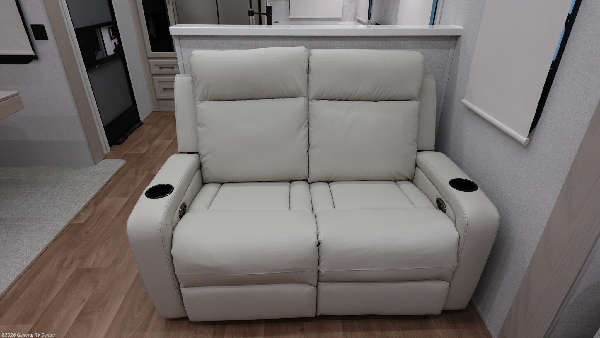 Palomino Columbus fifth wheel 384RKH highlights: Bath and a Half Master Suite Rear Kitchen Two Sofa/Sleepers Two Power Awnings Dual Entry Doors You won't believe all that this fifth wheel has to offer! Starting with the rear kitchen which has plenty of countertop space to prepare your delicious meals, a four burner cooktop with a stainless steel 24" oven to cook them, and a large single bowl stainless steel sink for easy clean up. The living area has opposing sofas and a theater seat with USB charging and storage across from an entertainment center with 50" Smart TV. The half bathroom is close to the living area so you can get back to watching your movie faster. You will feel right at home sleeping in the master suite on a slide out king bed across from a dresser and hamper to keep your space tidy, plus entrance into the front full bathroom. Inside the bathroom, you will find a vanity with dual sinks for two to get ready at once, a spacious shower with a seat, and a walk-in closet for clothes, shoes, and more! Experience a different camping life with residential furnishings and high end features in each one of these Palomino Columbus fifth wheels! The 101" wide body lets you walk around more throughout and the all-welded aluminum-frame superstructure has a snap-in ceiling molding to hold up through every adventure. Don't leave any of your gear behind either when you can easily store it in the climate controlled drop frame storage area. On the exterior, you'll find a heated utility convenience center, an outside sprayer to keep the dirt outside where it belongs, and magnetic compartment door holds to keep them from falling on you as you grab your items. Plus, there are some modern features that will really seal the deal like the power theater seating with USB charging!