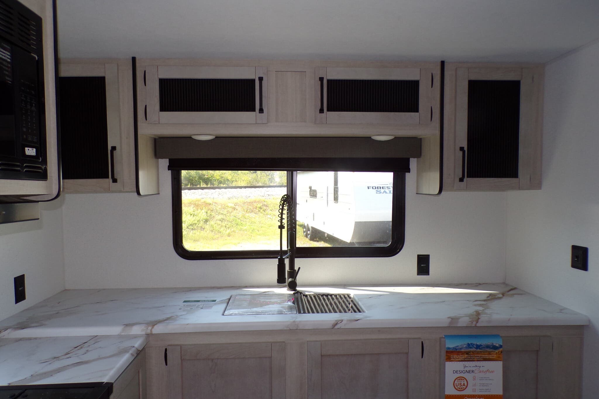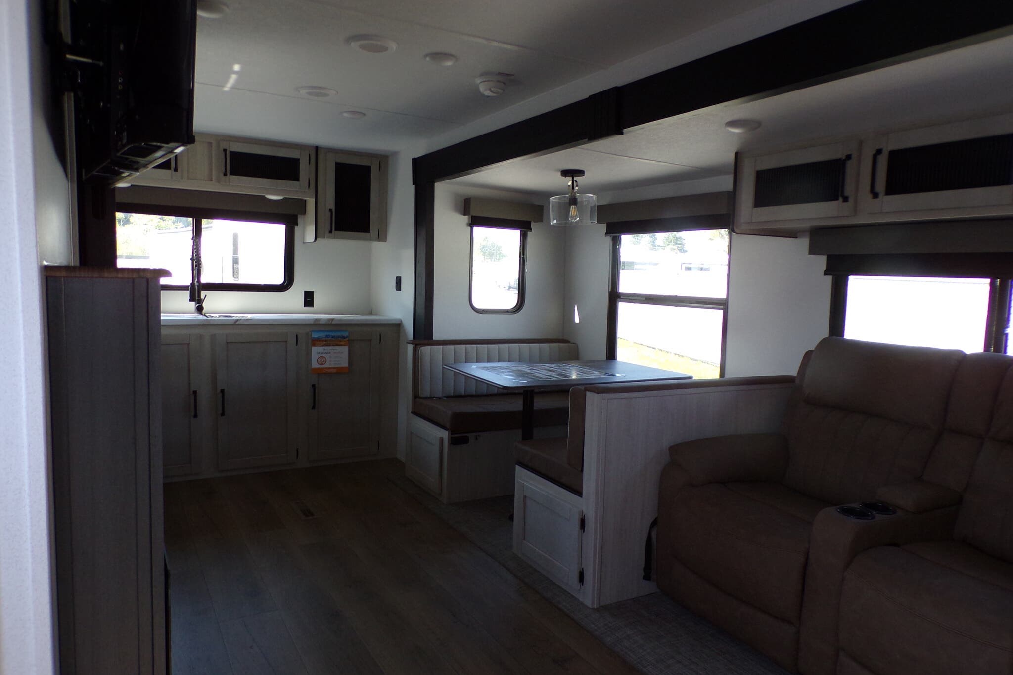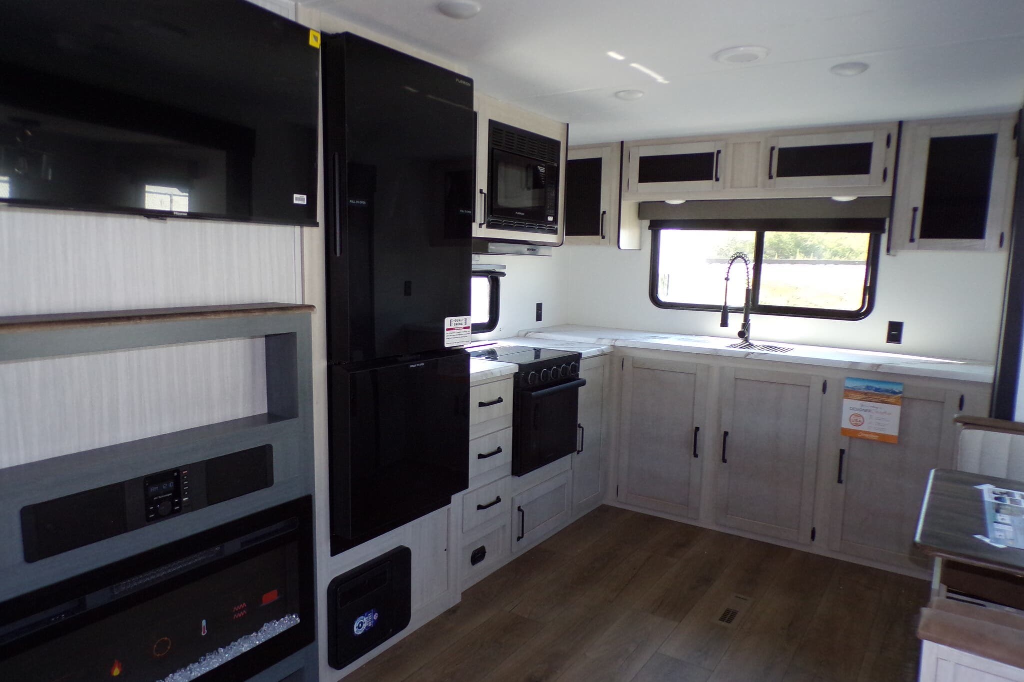 The 310RK floorplan emphasizes practical living space with two slideouts that expand the inner footprint, giving you generous room to relax, work, or entertain. Floorplan types for this model include Couples Coach, Front Bath, Outdoor Kitchen, and Rear Kitchen, offering flexible configurations to suit your adventures. Inside, you’ll find aKing Size Bed, comfy theater seating, and a washer/dryer prep option for longer stays. The rear kitchen layout keeps your entertaining and cooking zone close to the living area, making it easy to socialize while preparing delicious meals. An inviting living area, well-appointed galley, and large windows create a bright, homey feel throughout.