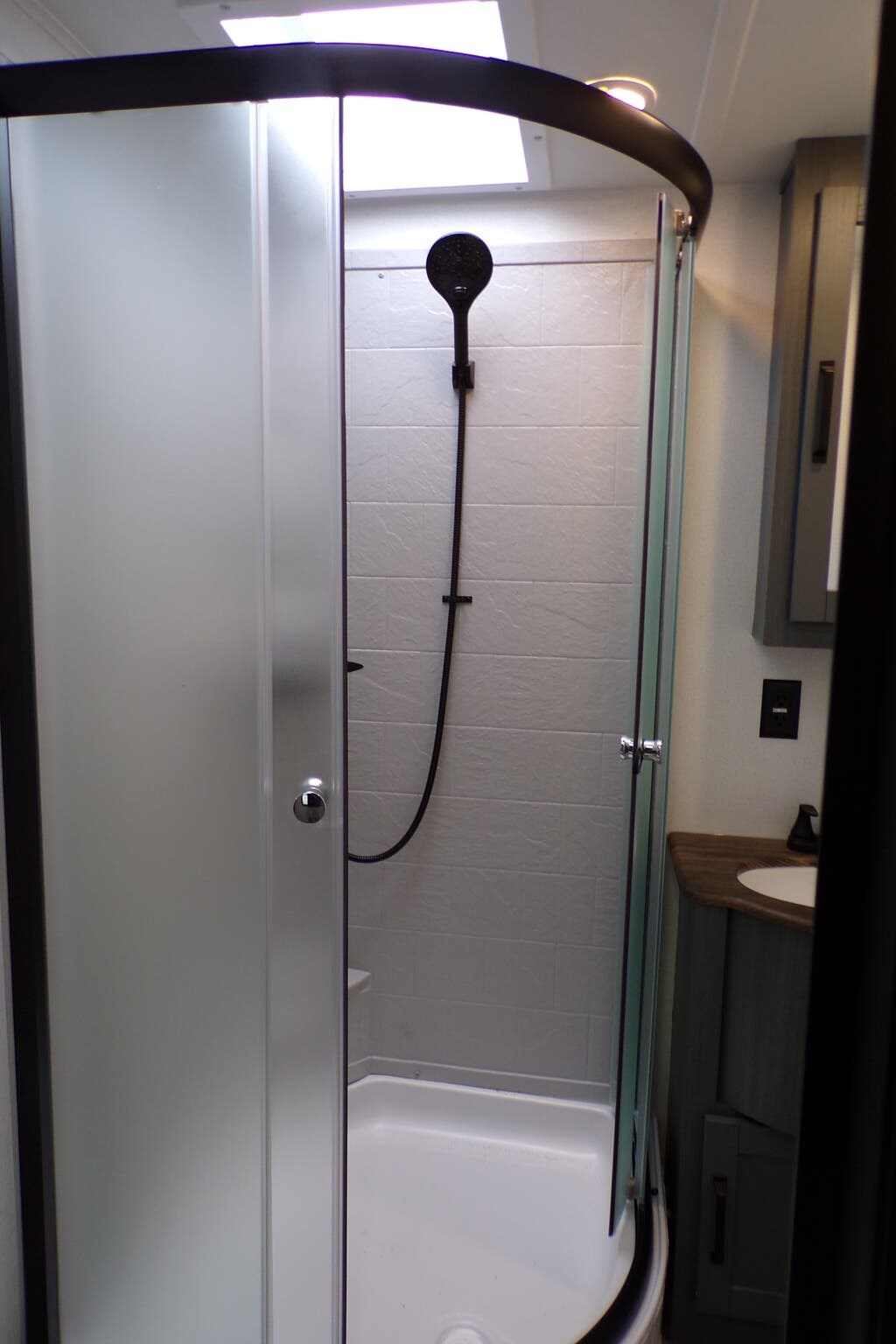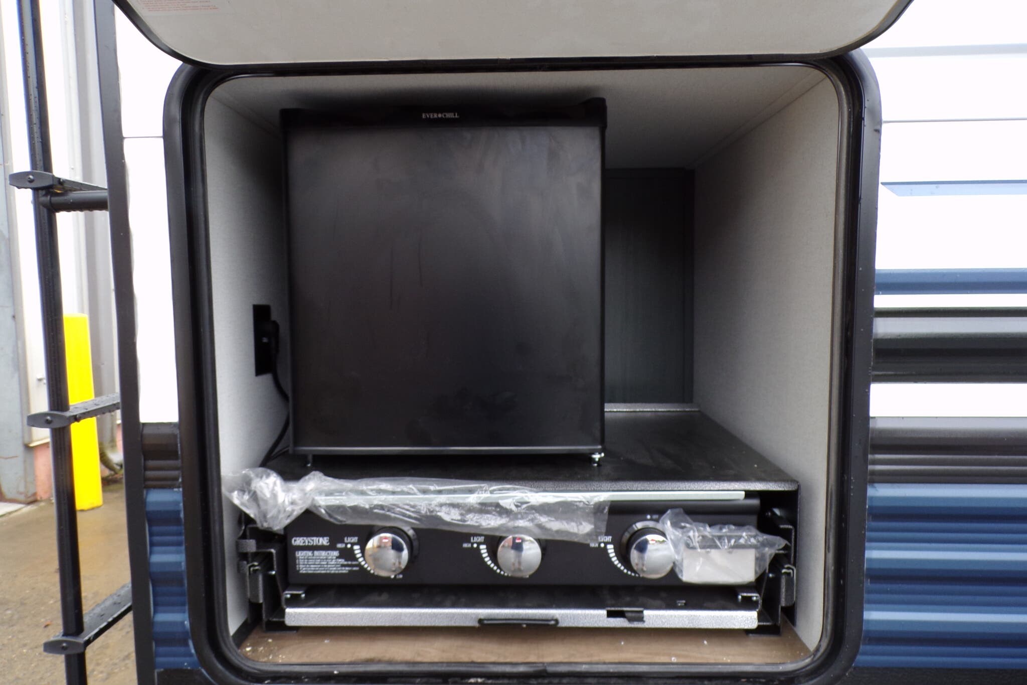Alloy Wheels, Aluminum Entrance Steps, Awning, Black Tank Flush, Detachable Power Cord, Enclosed Underbelly, Exterior Refrigerator, Exterior Speakers, Exterior Stereo, External Shower, Griddle, Ladder, Leveling Jacks, Outside Kitchen, Power Awning, Power Hitch Jack, Power Roof Vent, Power Stabilizer Jacks, Roof Vent, Screen Door, Second Roof A/C, Skylight, Slideout, Spare Tire Kit, Tinted Windows, Upgraded Insulation Package -