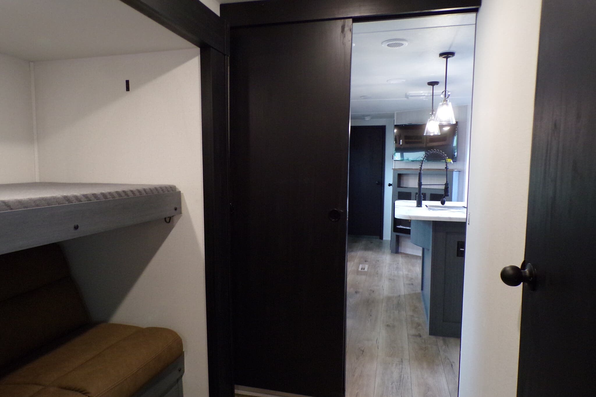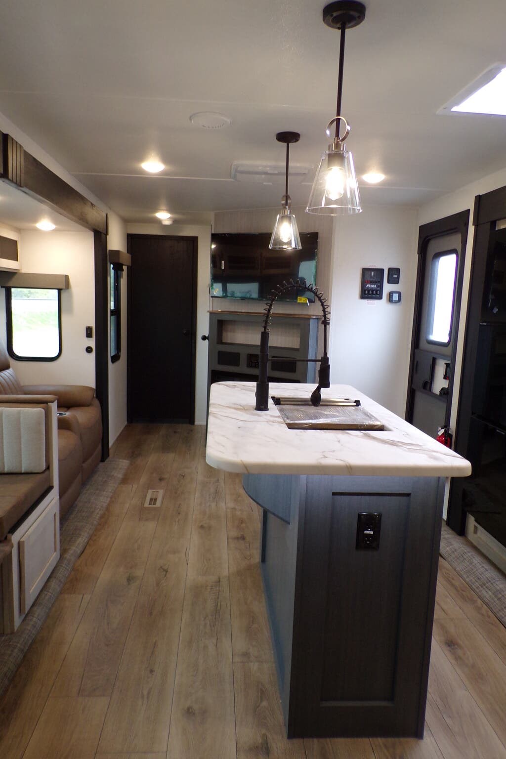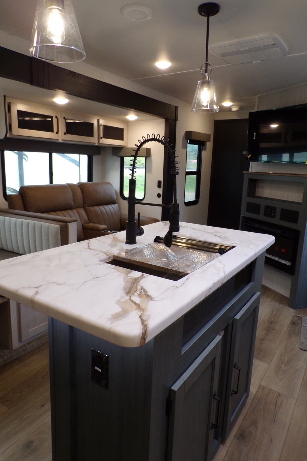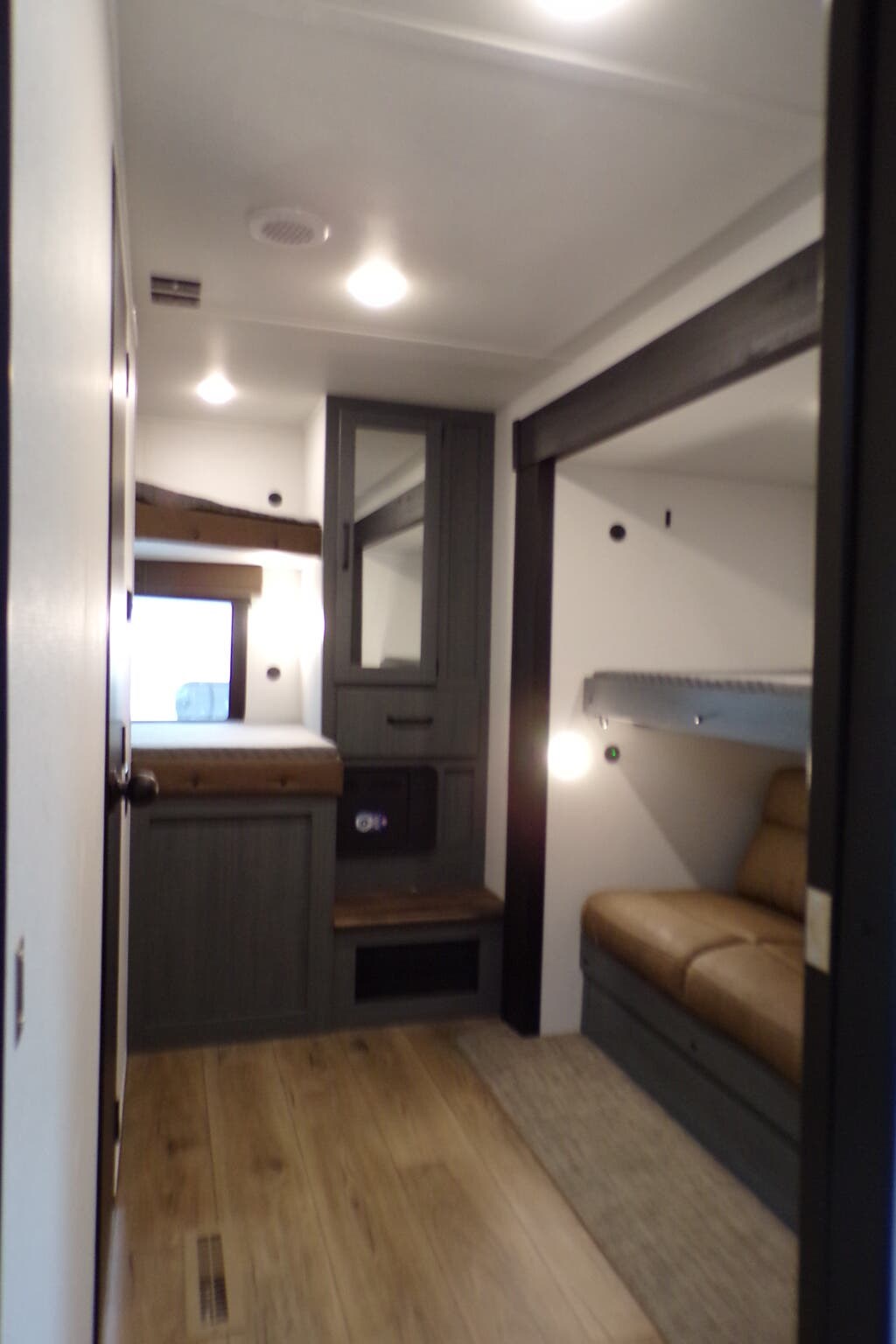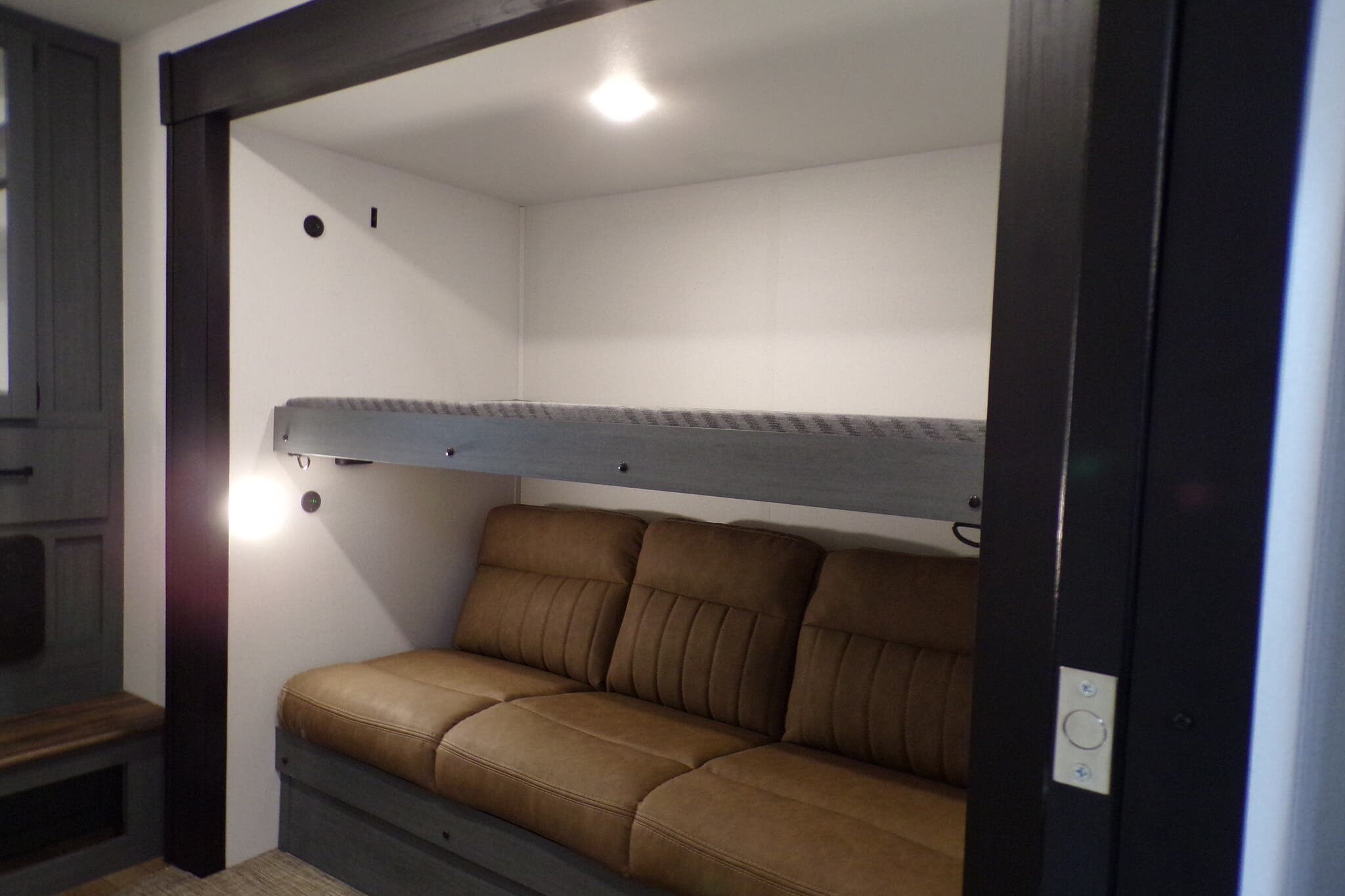 Booth Dinette, Bunk Beds, Bunkhouse, Dinette, Dinette Bed, Fireplace, Glass Shower Door, Island Kitchen, Kitchen Sink, Medicine Cabinet, Overhead Cabinetry, Pantry, Queen Bed, Queen Mattress, Roof Vents, Shower, Theater Seating, Toilet, Two Full Baths