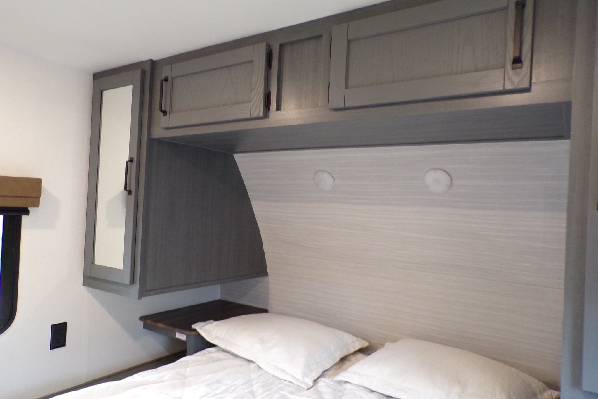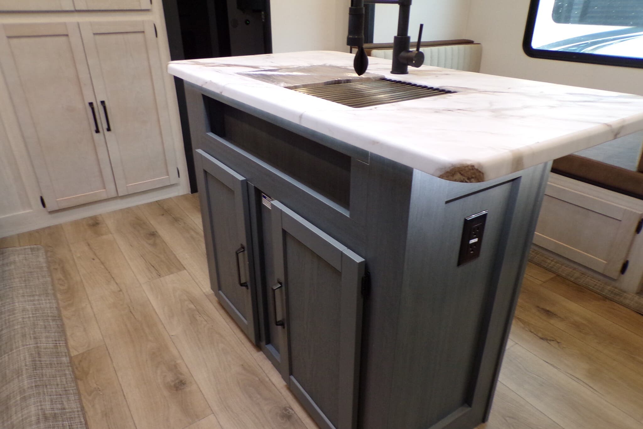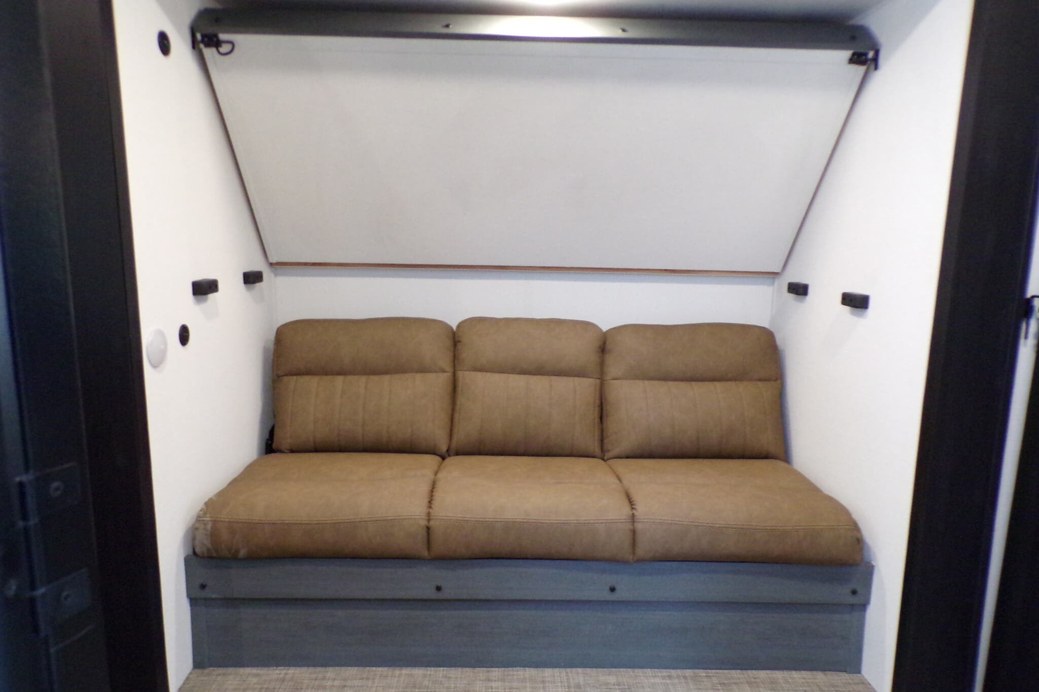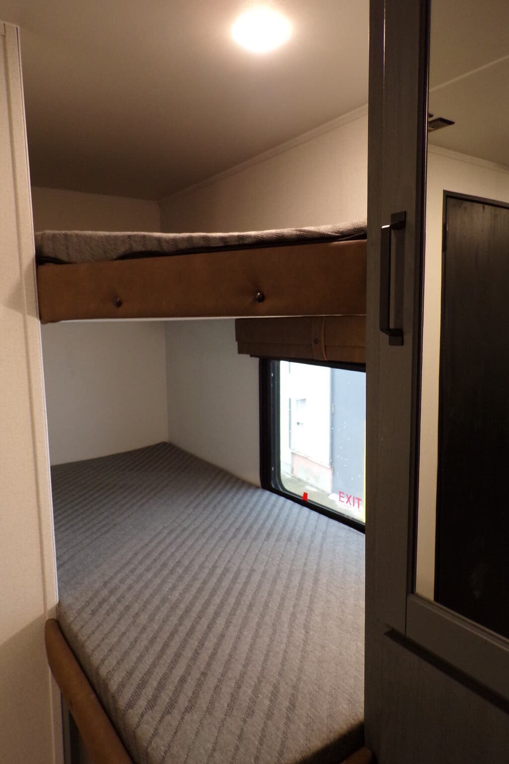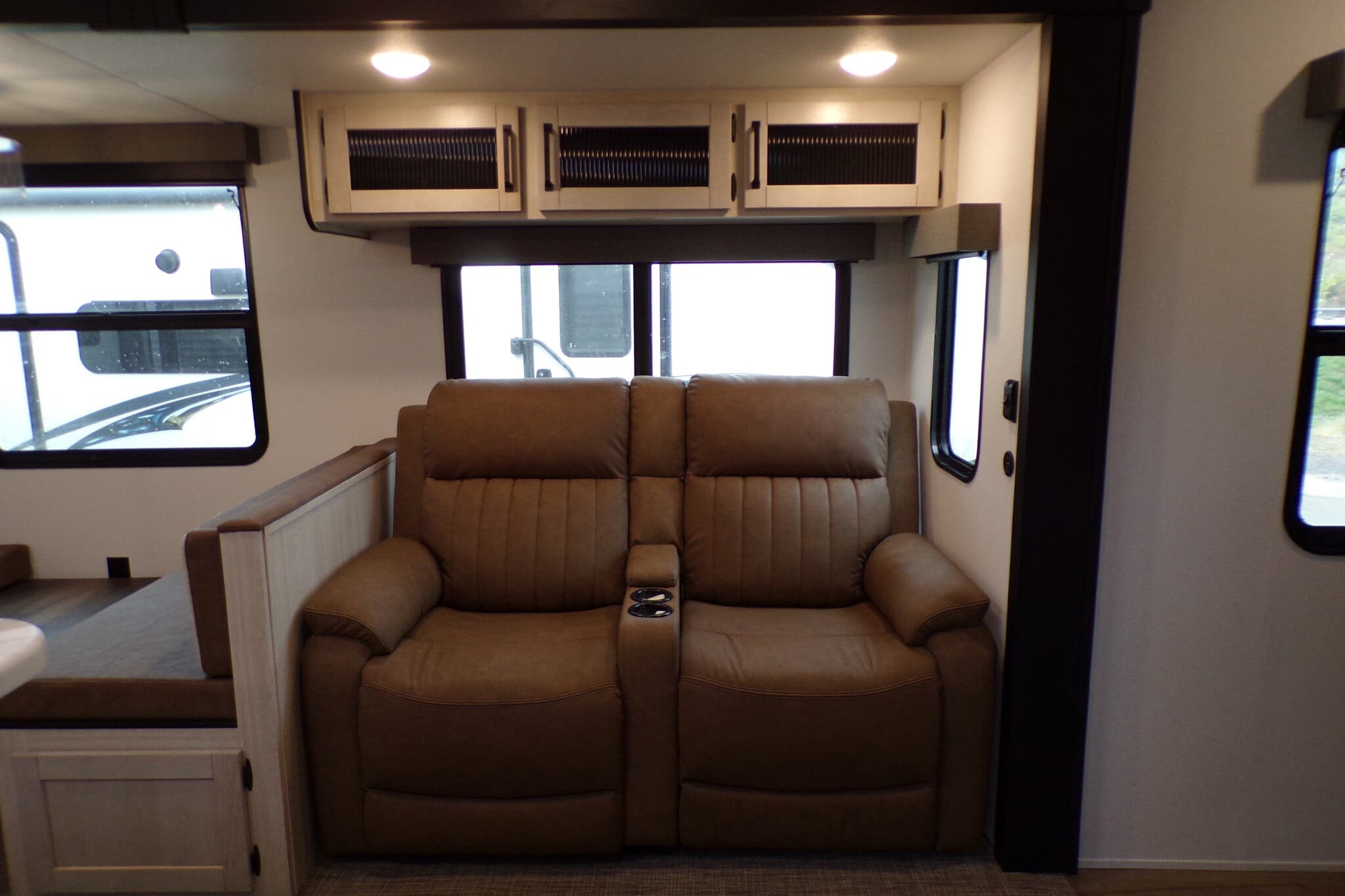 Booth Dinette, Bunk Beds, Bunkhouse, Dinette, Dinette Bed, Fireplace, Glass Shower Door, Island Kitchen, Kitchen Sink, Medicine Cabinet, Overhead Cabinetry, Pantry, Queen Bed, Queen Mattress, Roof Vents, Shower, Theater Seating, Toilet, Two Full Baths