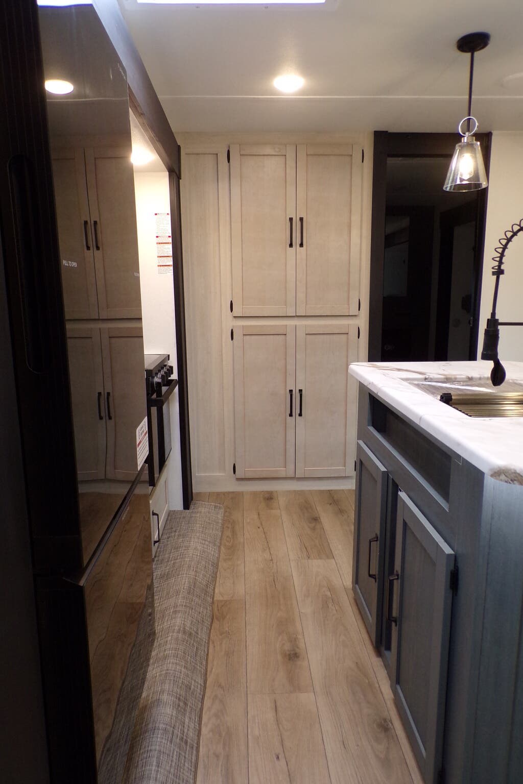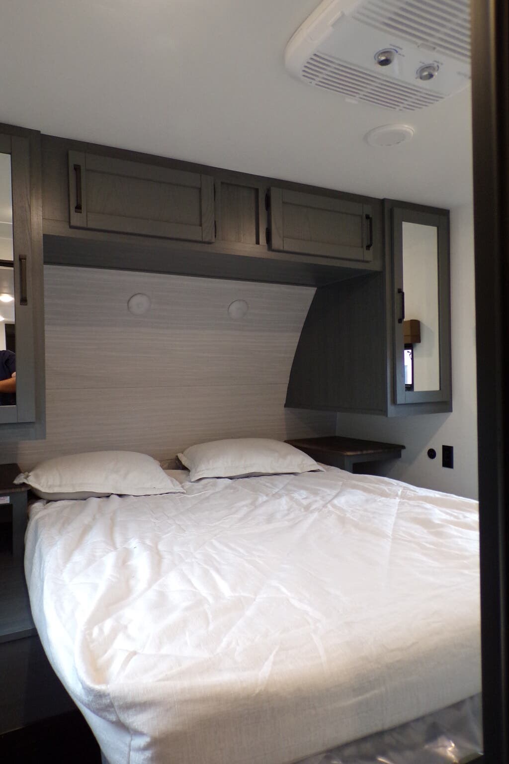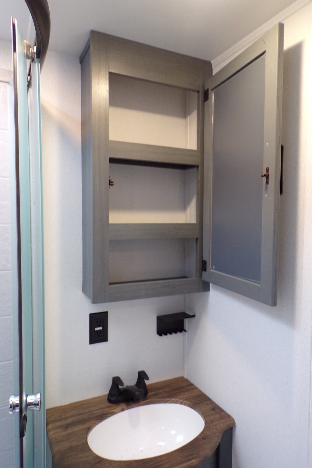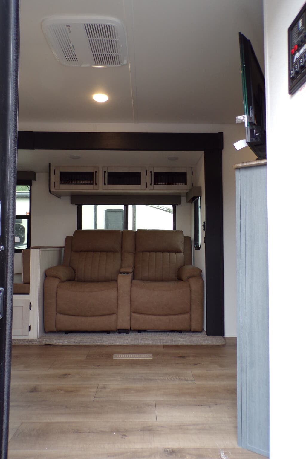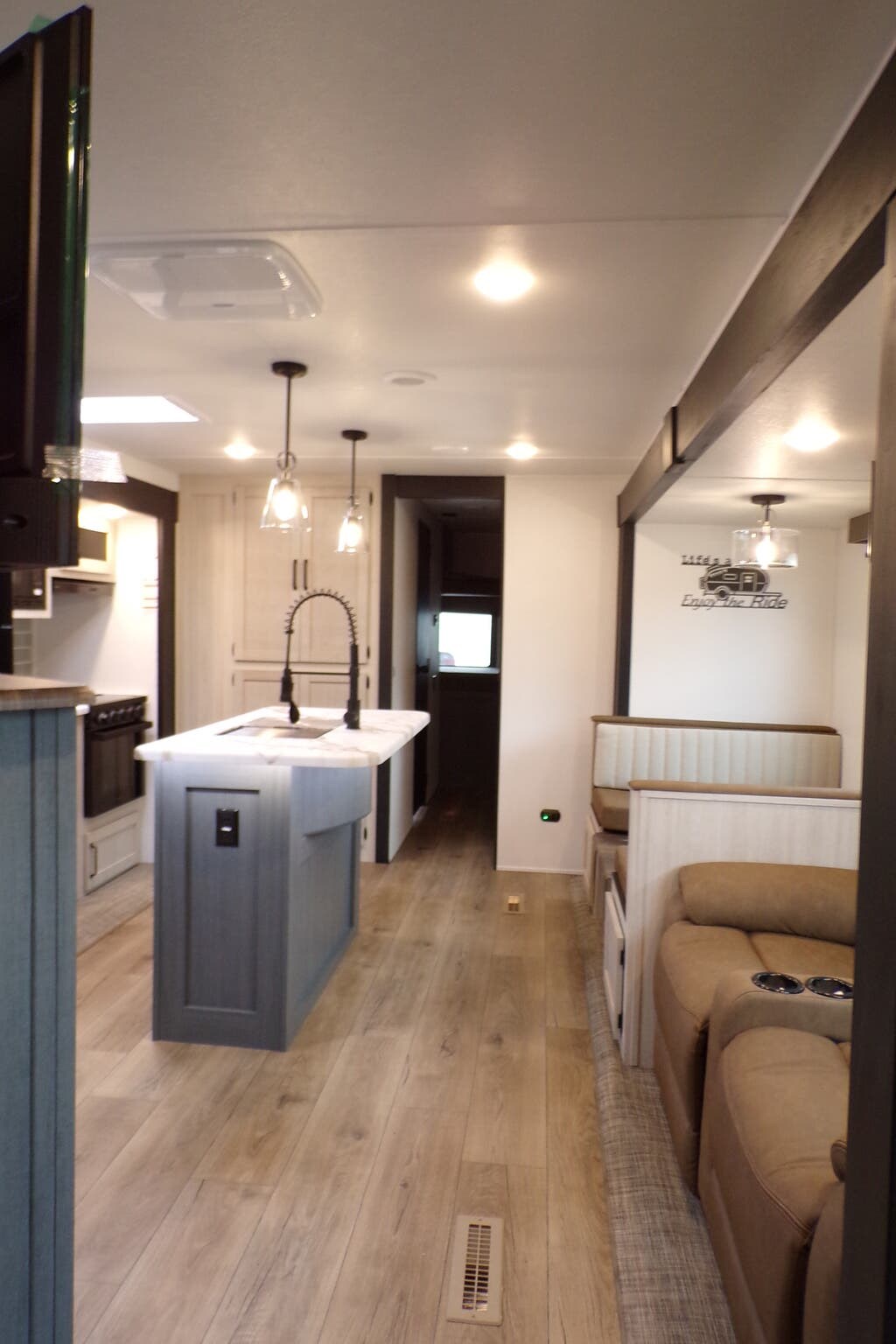 Booth Dinette, Bunk Beds, Bunkhouse, Dinette, Dinette Bed, Fireplace, Glass Shower Door, Island Kitchen, Kitchen Sink, Medicine Cabinet, Overhead Cabinetry, Pantry, Queen Bed, Queen Mattress, Roof Vents, Shower, Theater Seating, Toilet, Two Full Baths