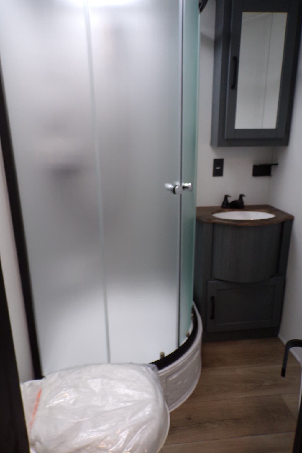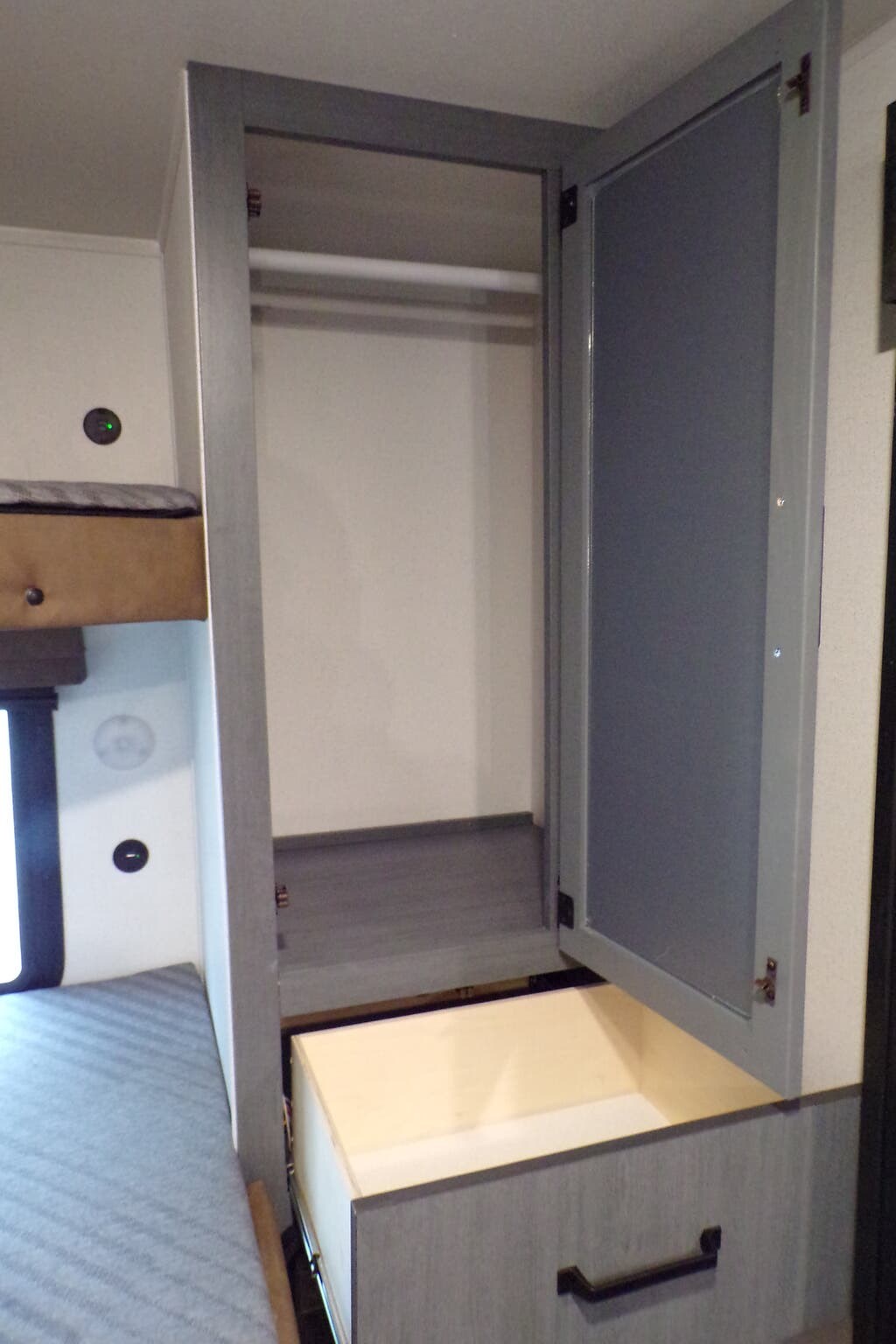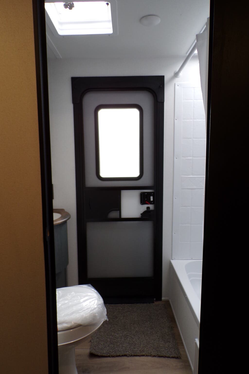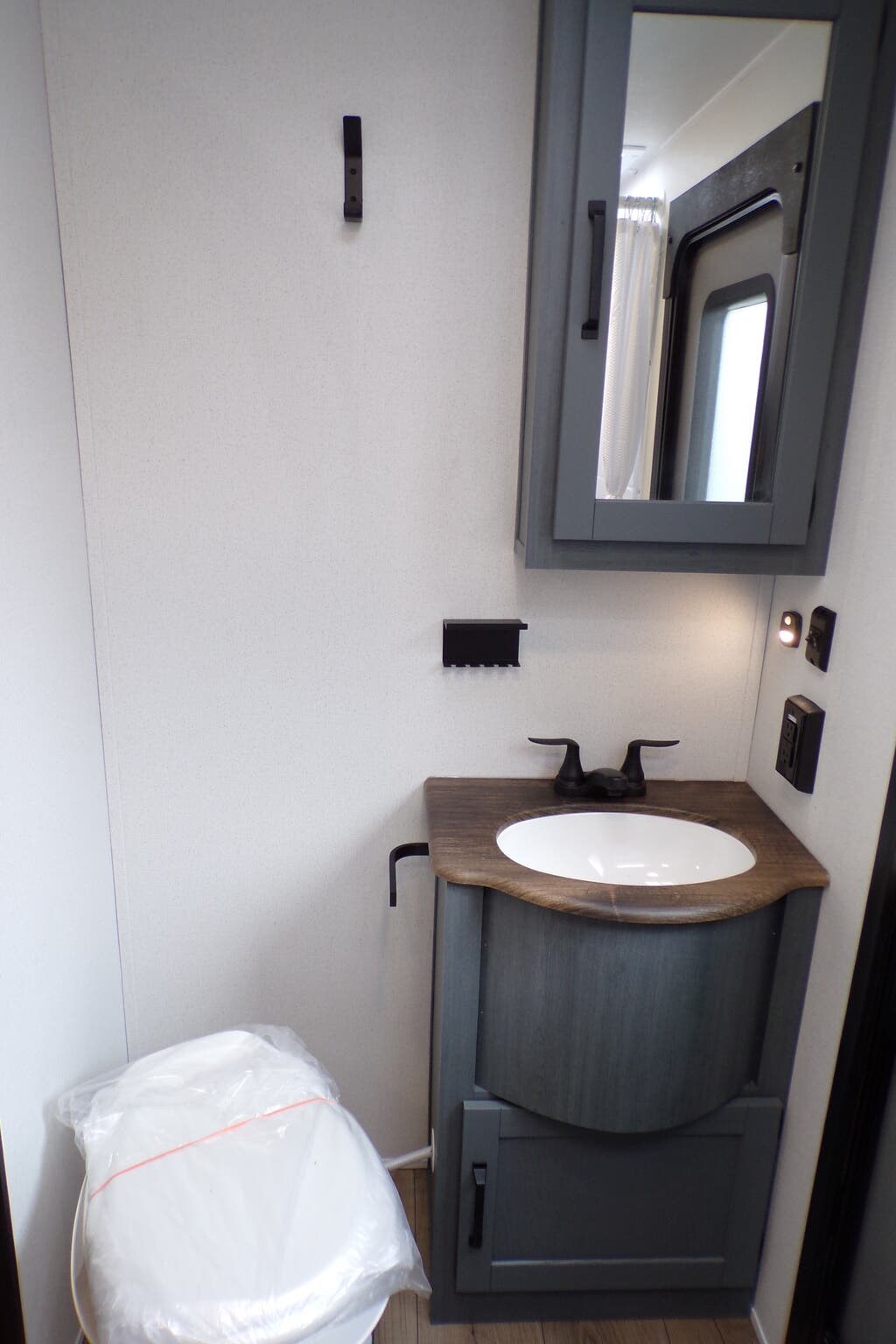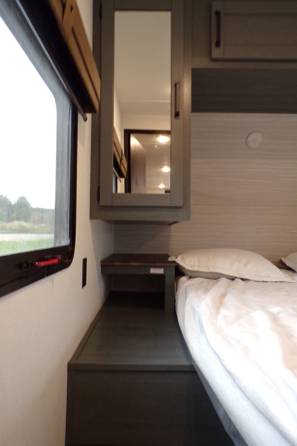 Booth Dinette, Bunk Beds, Bunkhouse, Dinette, Dinette Bed, Fireplace, Glass Shower Door, Island Kitchen, Kitchen Sink, Medicine Cabinet, Overhead Cabinetry, Pantry, Queen Bed, Queen Mattress, Roof Vents, Shower, Theater Seating, Toilet, Two Full Baths