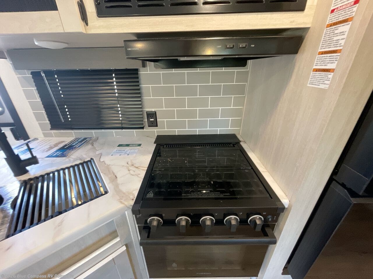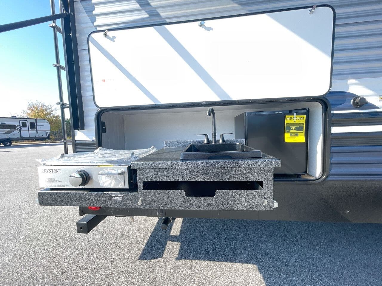 With dual entry doors and a bath and a half, you will have the ultimate in convenience with this travel trailer! The bedroom also has a front closet to keep your clothes looking their best and a queen bed slide for you to sleep your best. Everyone can freshen up in the full bathroom with the 34" x 34" radius shower and fill their bellies with scrambled eggs cooked with the stainless steel oven and range. Enjoy your meals, play games, and even sleep at the booth dinette or relax on the sofa while watching a movie with the entertainment center and fireplace. And your guests will love the rear private bunkhouse with three bunks, a jiffy sofa, and a slide out for more space! This model also includes an optional outside mini kitchen with a griddle!