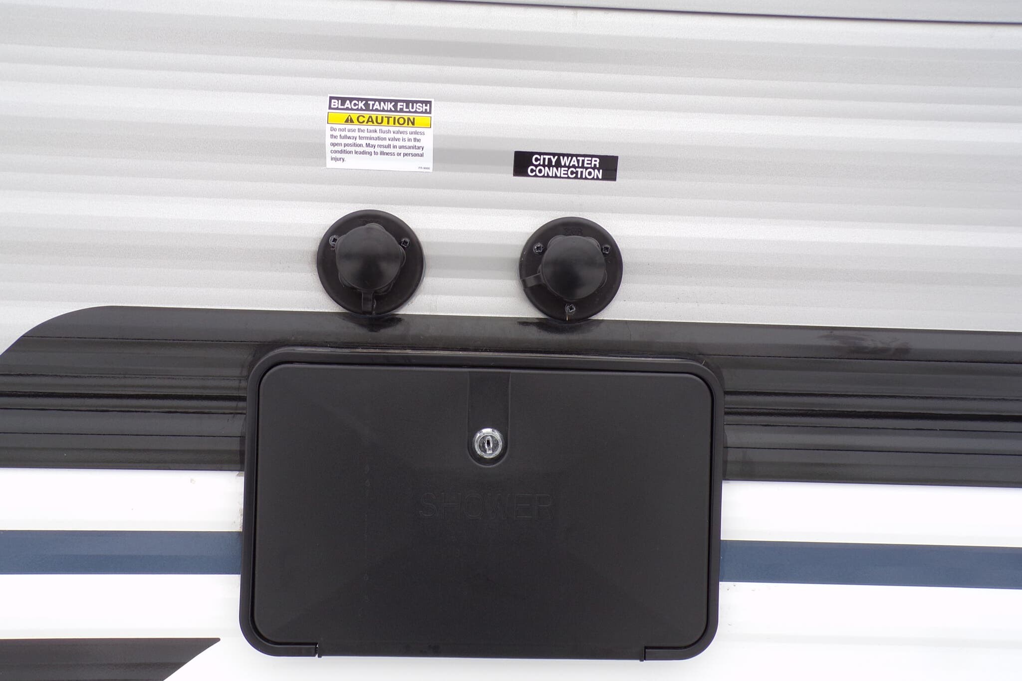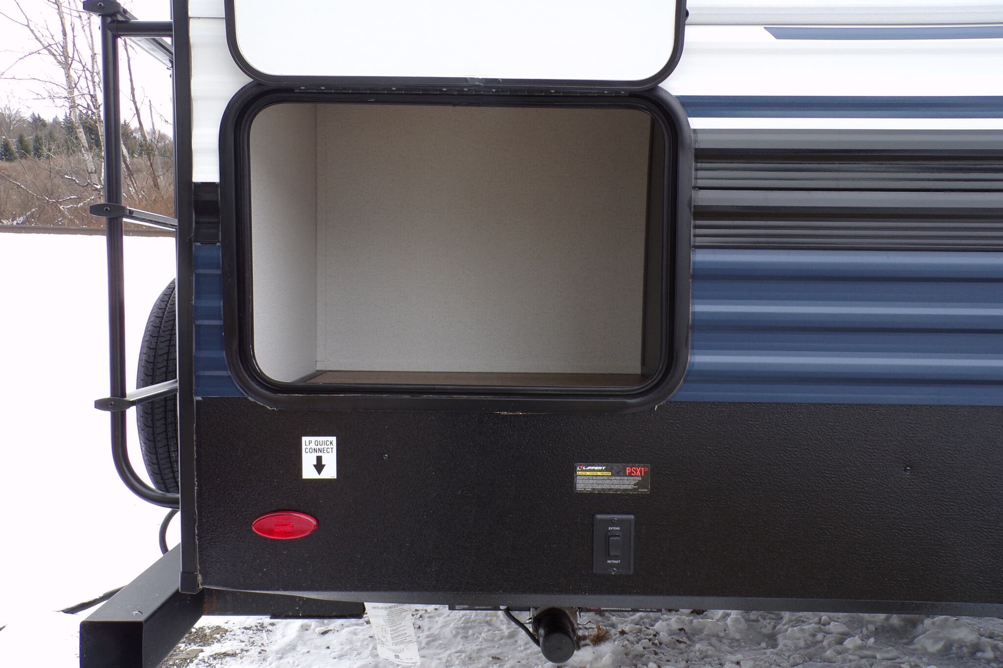 Alloy Wheels, Aluminum Entrance Steps, Awning, Black Tank Flush, Detachable Power Cord, Enclosed Underbelly, Exterior Refrigerator, Exterior Speakers, Exterior Stereo, External Shower, Griddle, Ladder, Outside Kitchen, Pass Thru Storage, Power Awning, Power Hitch Jack, Power Roof Vent, Power Stabilizer Jacks, Roof Vent, Screen Door, Skylight, Slideout, Spare Tire Kit, Stabilizer Jacks, Tinted Windows, Upgraded Insulation Package -