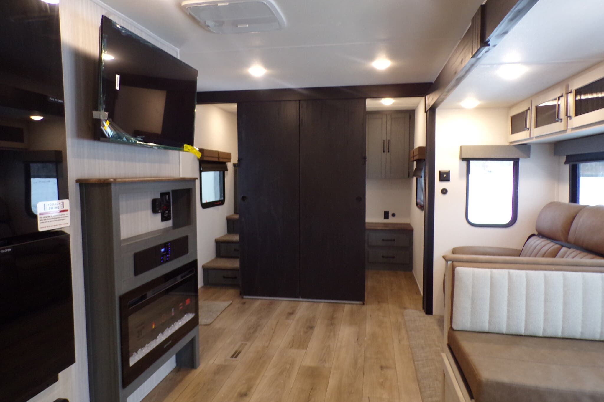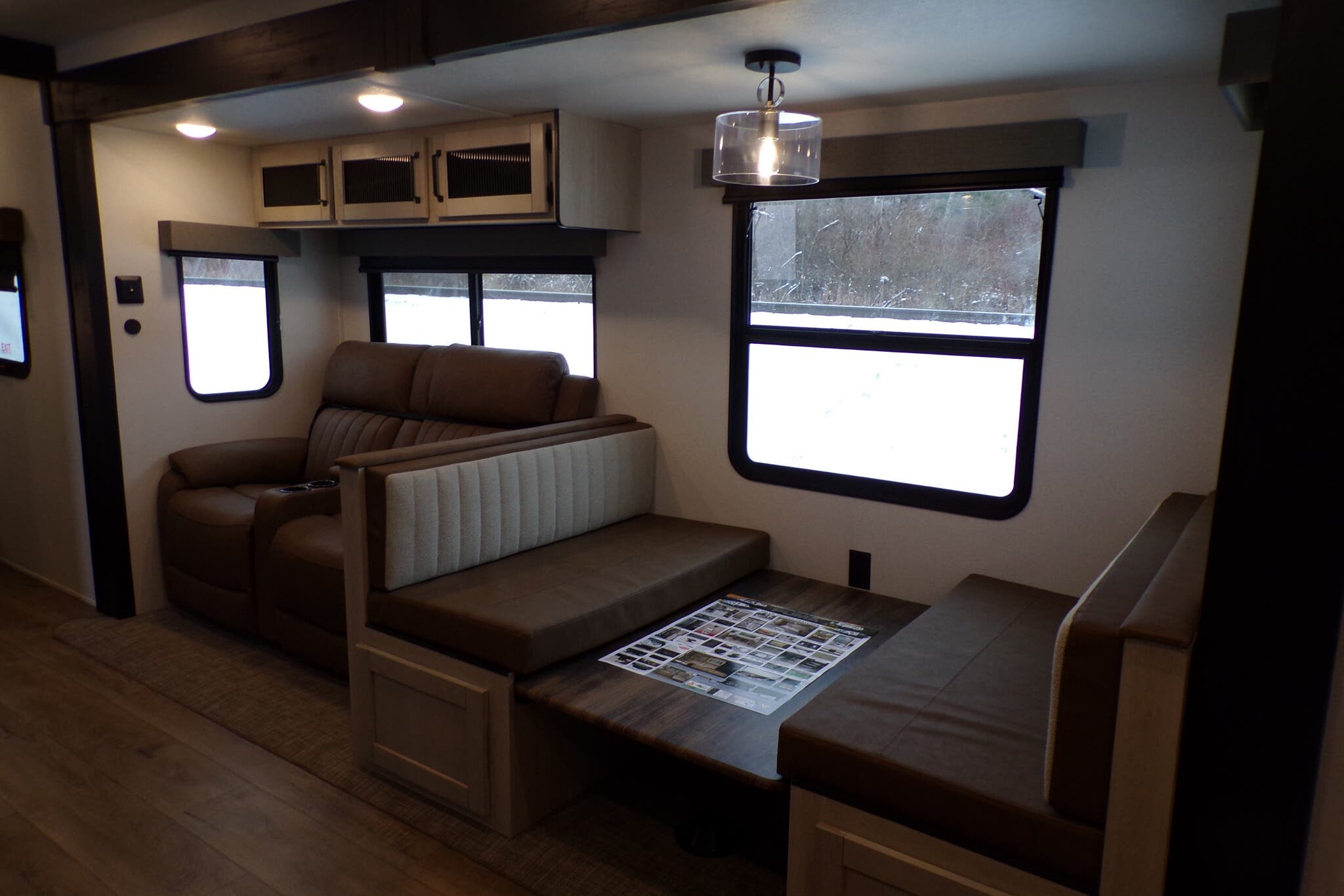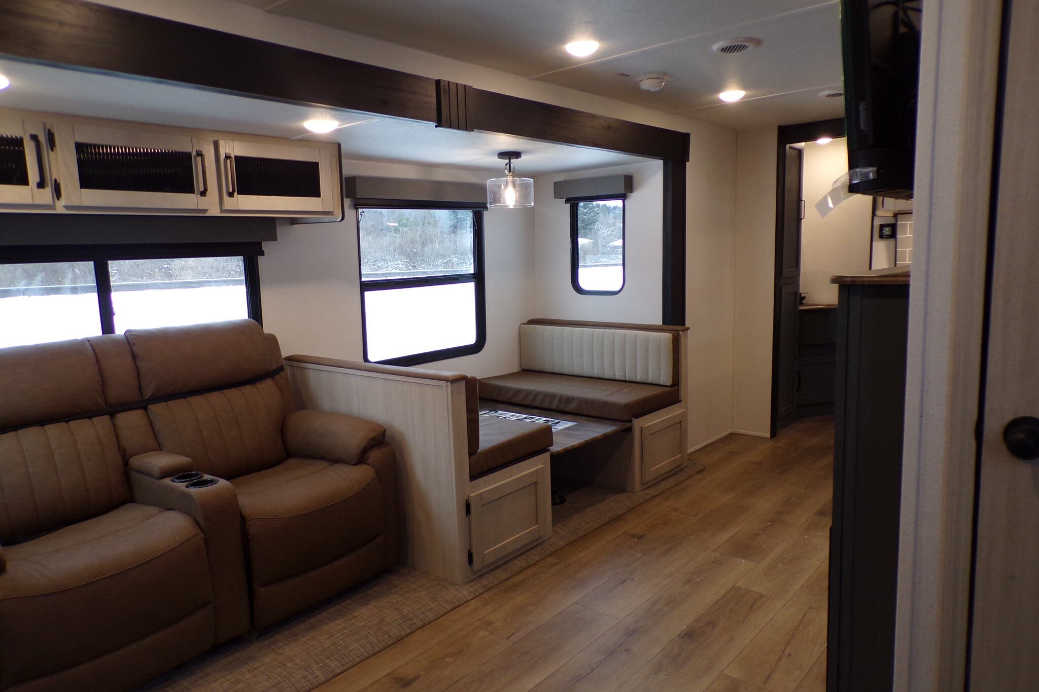 Booth Dinette, Bunk Beds, Bunkhouse, Dinette, Dinette Bed, Fireplace, Glass Shower Door, Pantry, Pocket Door(s), Queen Bed, Queen Mattress, Shower, Theater Seating, Toilet, Vanity